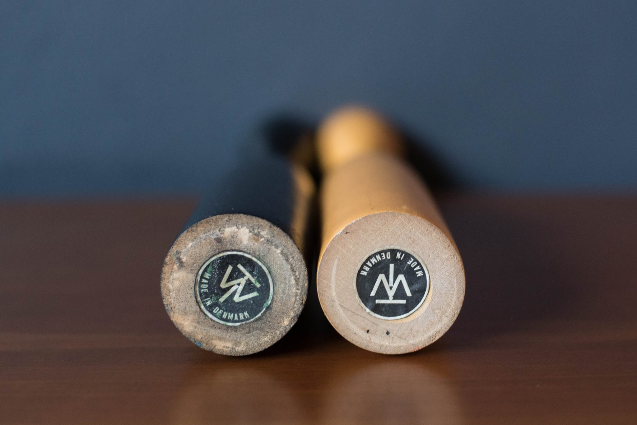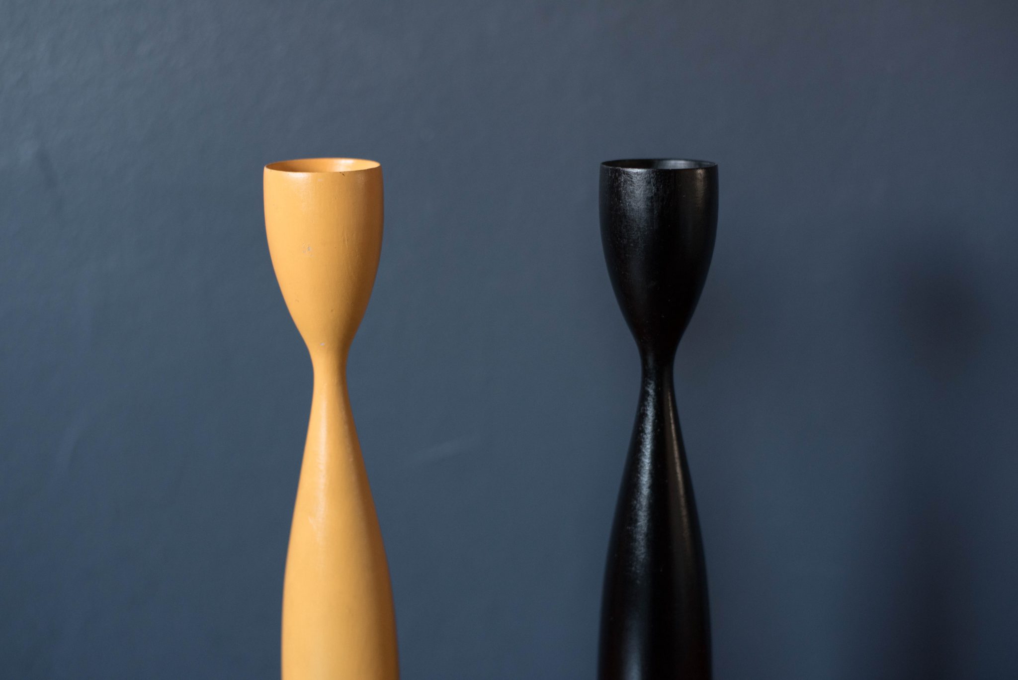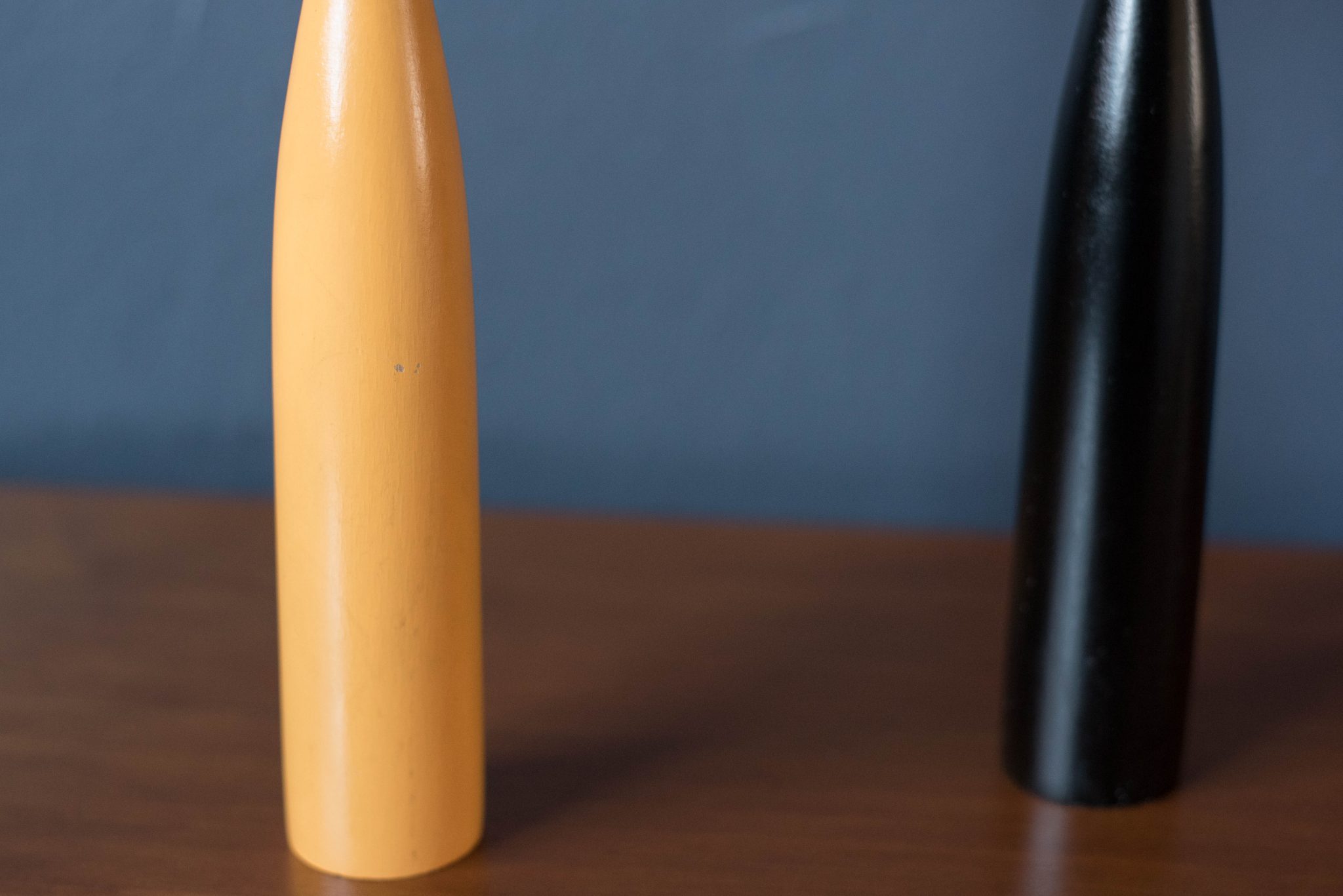 Mid-Century Modern pair of tall sculptural wood candleholders made in Denmark. This set displays well with any modern decor and fits 3/4″ candles. Price is for the pair.