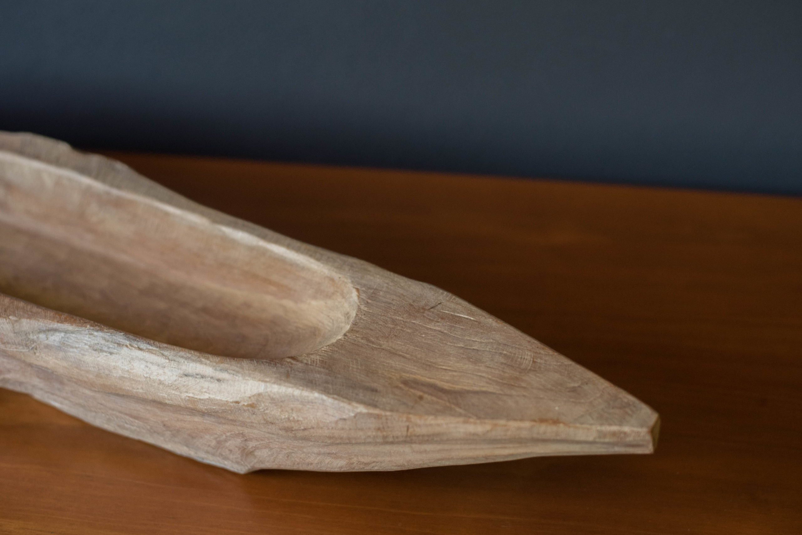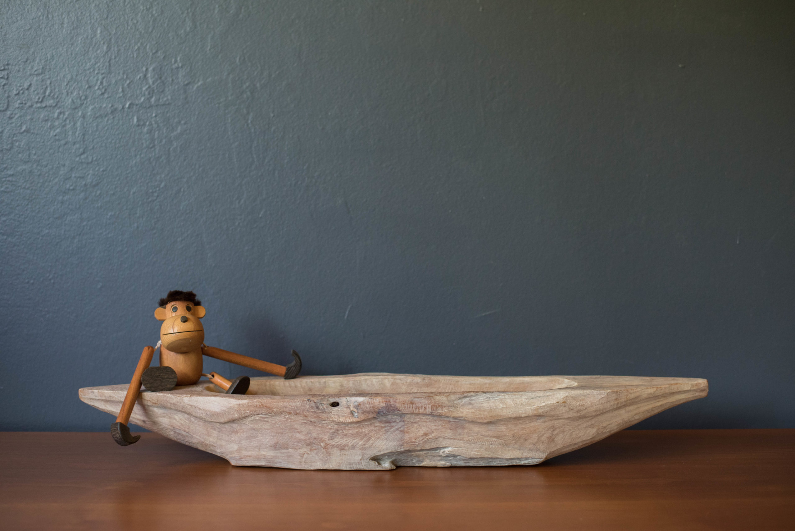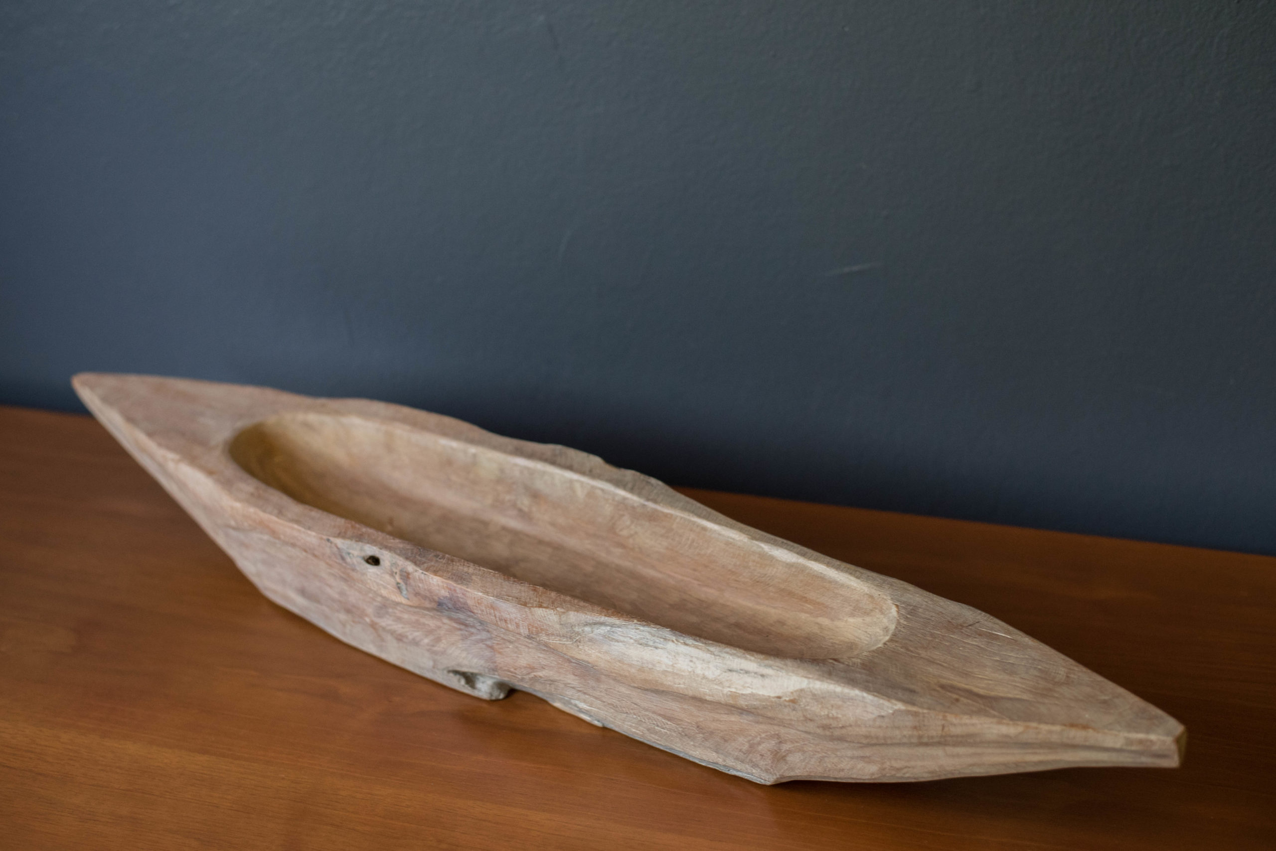 Vintage sculptural decorative centerpiece serving bowl circa 1970s. Crafted in a hand carved canoe shape that has been naturally aged displaying plenty of rustic charm and patina. The perfect home decor piece that can be accessorized with fruit, floral arrangements, or set up as a candle tray.