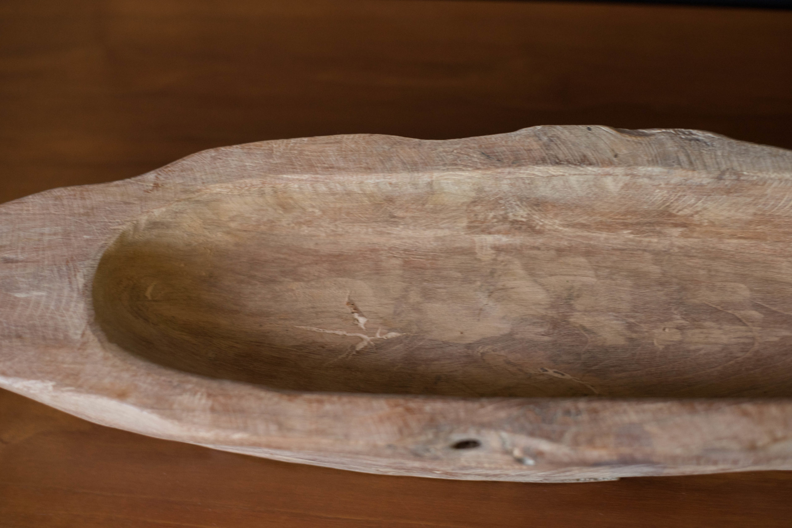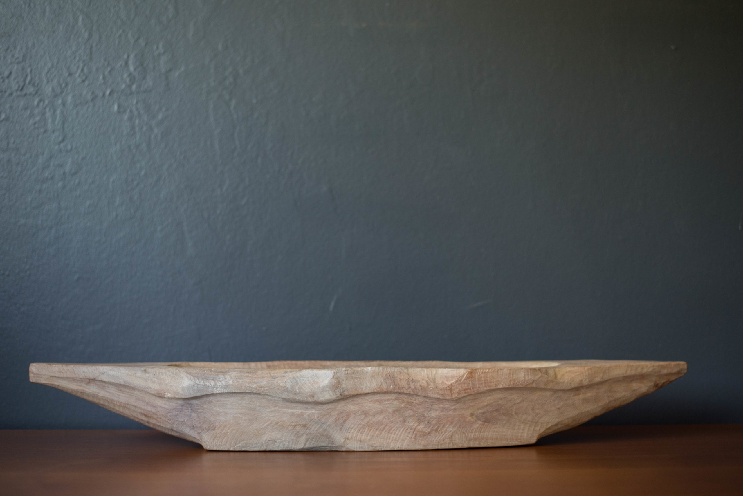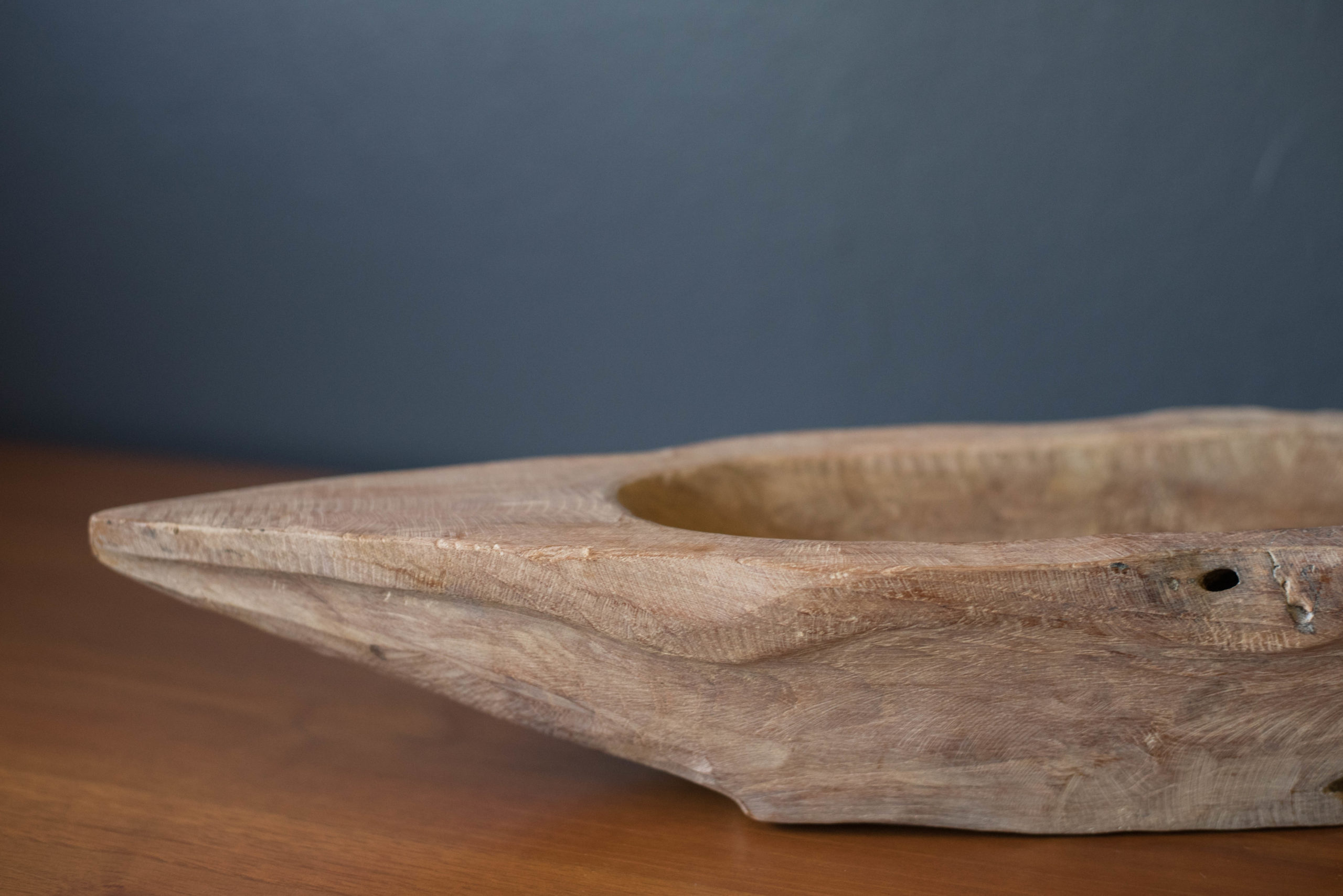 Vintage sculptural decorative centerpiece serving bowl circa 1970s. Crafted in a hand carved canoe shape that has been naturally aged displaying plenty of rustic charm and patina. The perfect home decor piece that can be accessorized with fruit, floral arrangements, or set up as a candle tray.