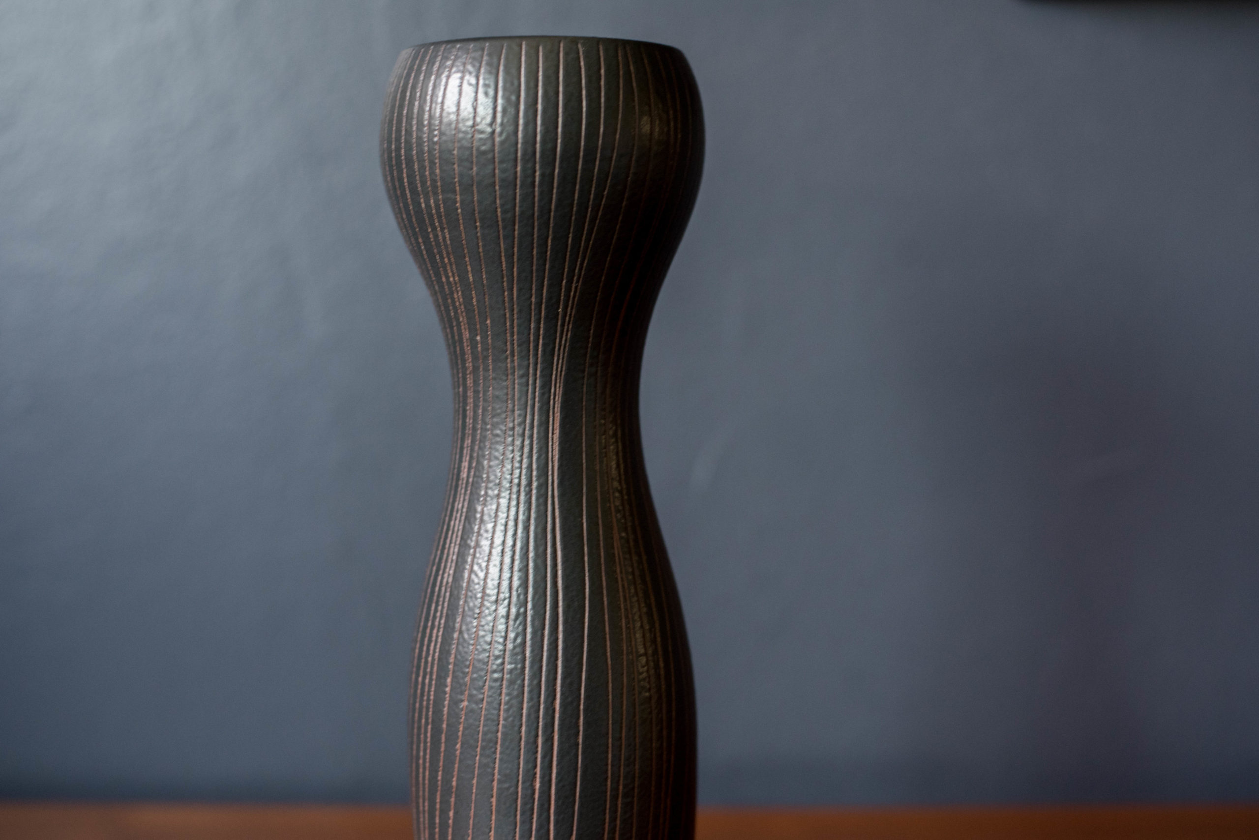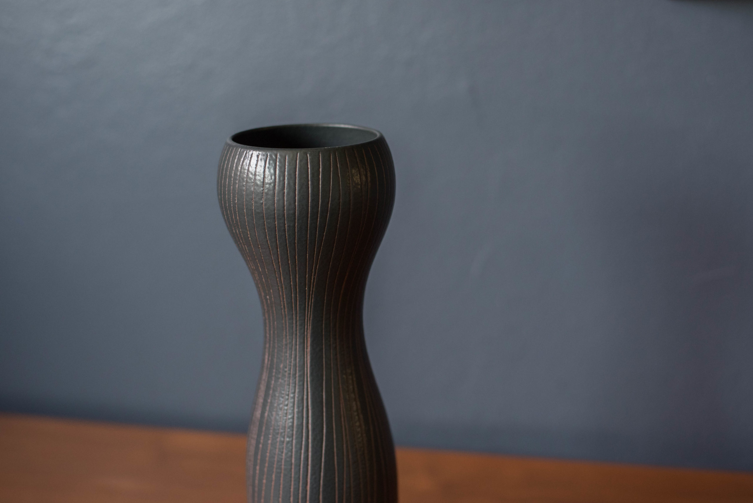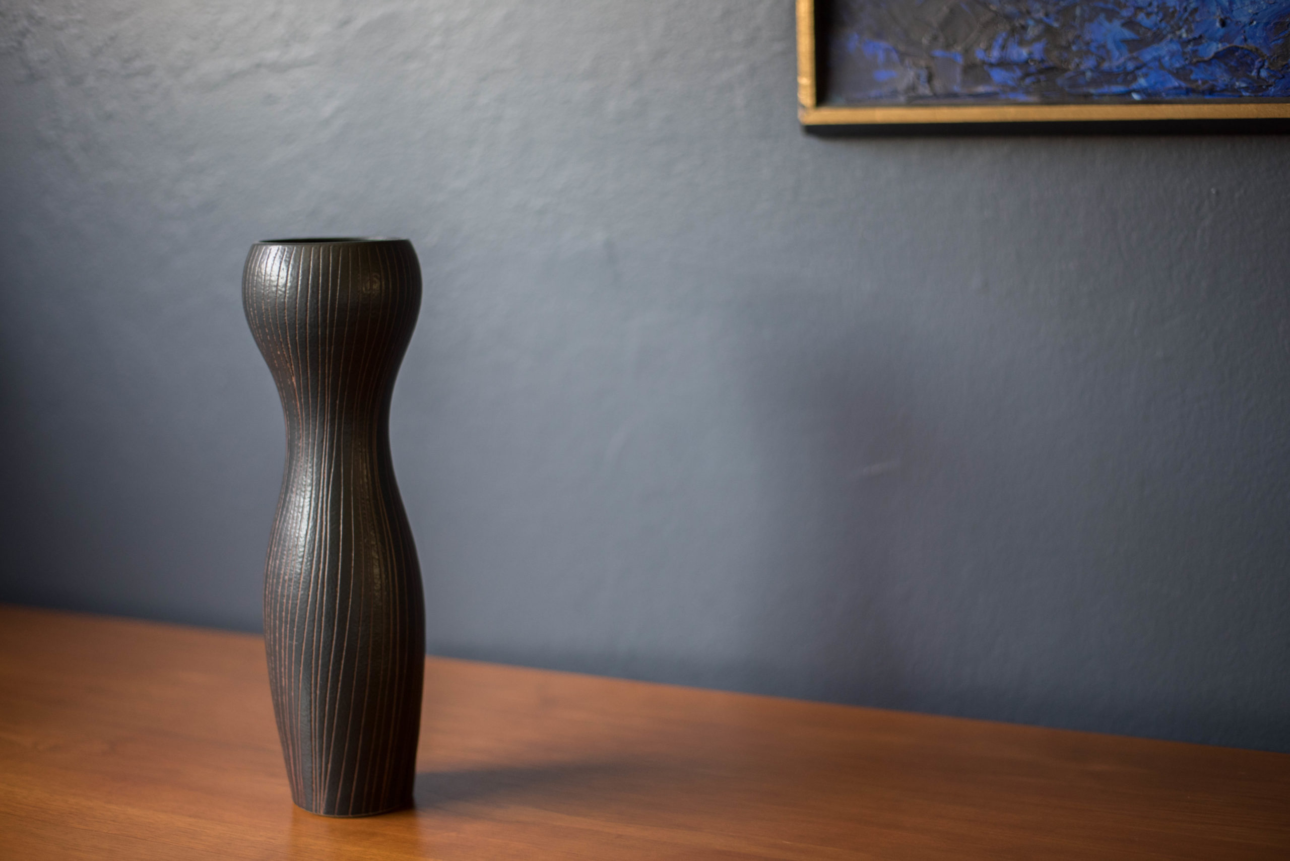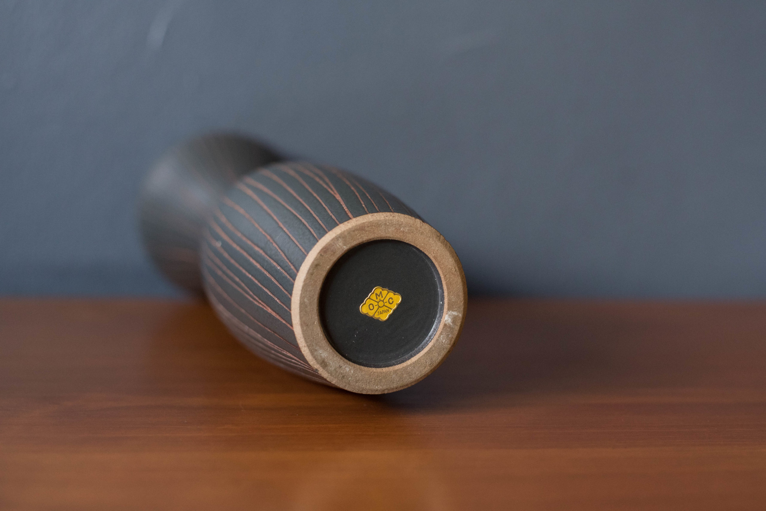Mid-Century Modern ceramic pottery vase by Otagiri Mercantile Company, circa 1960s. This unique vessel features a sculptural stoneware shape with natural decorative incising in a matte black finish.