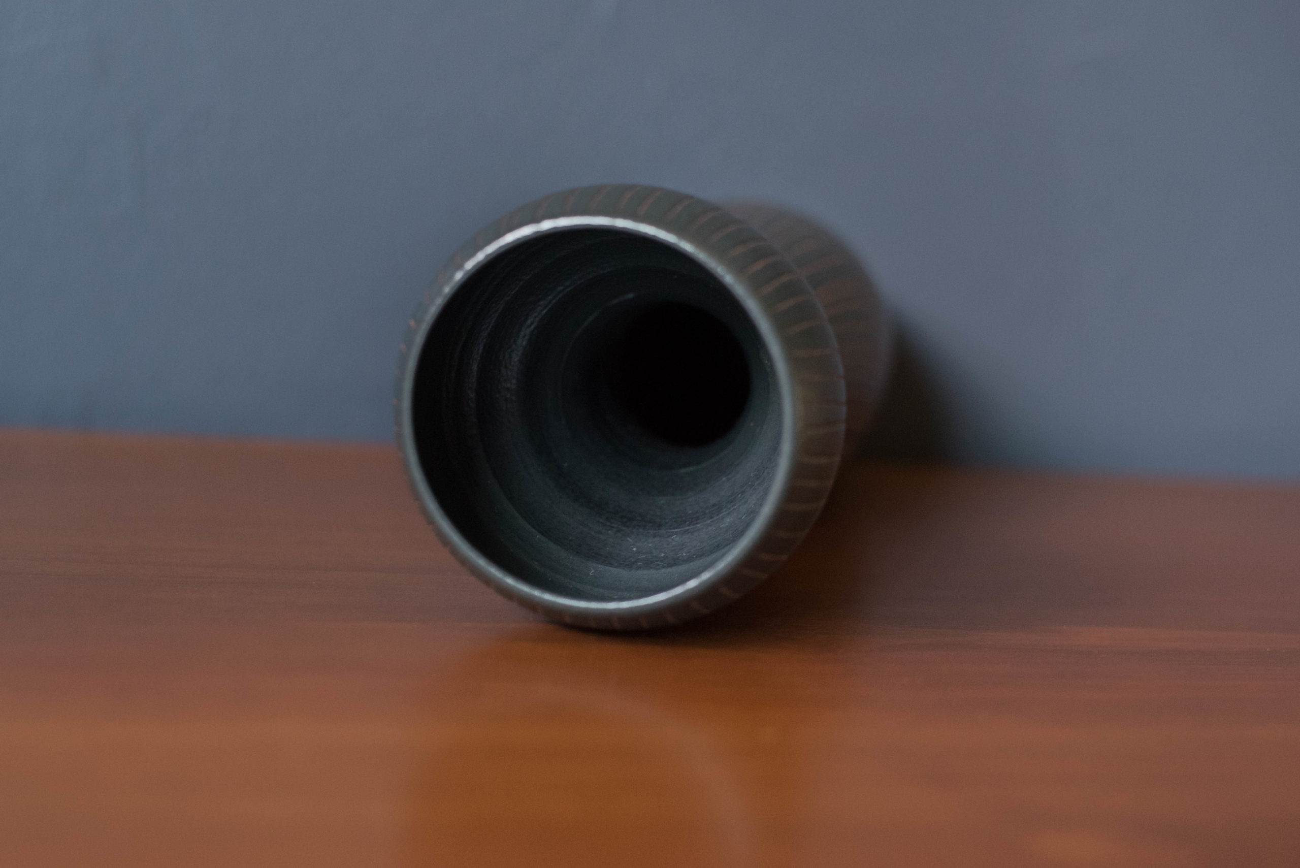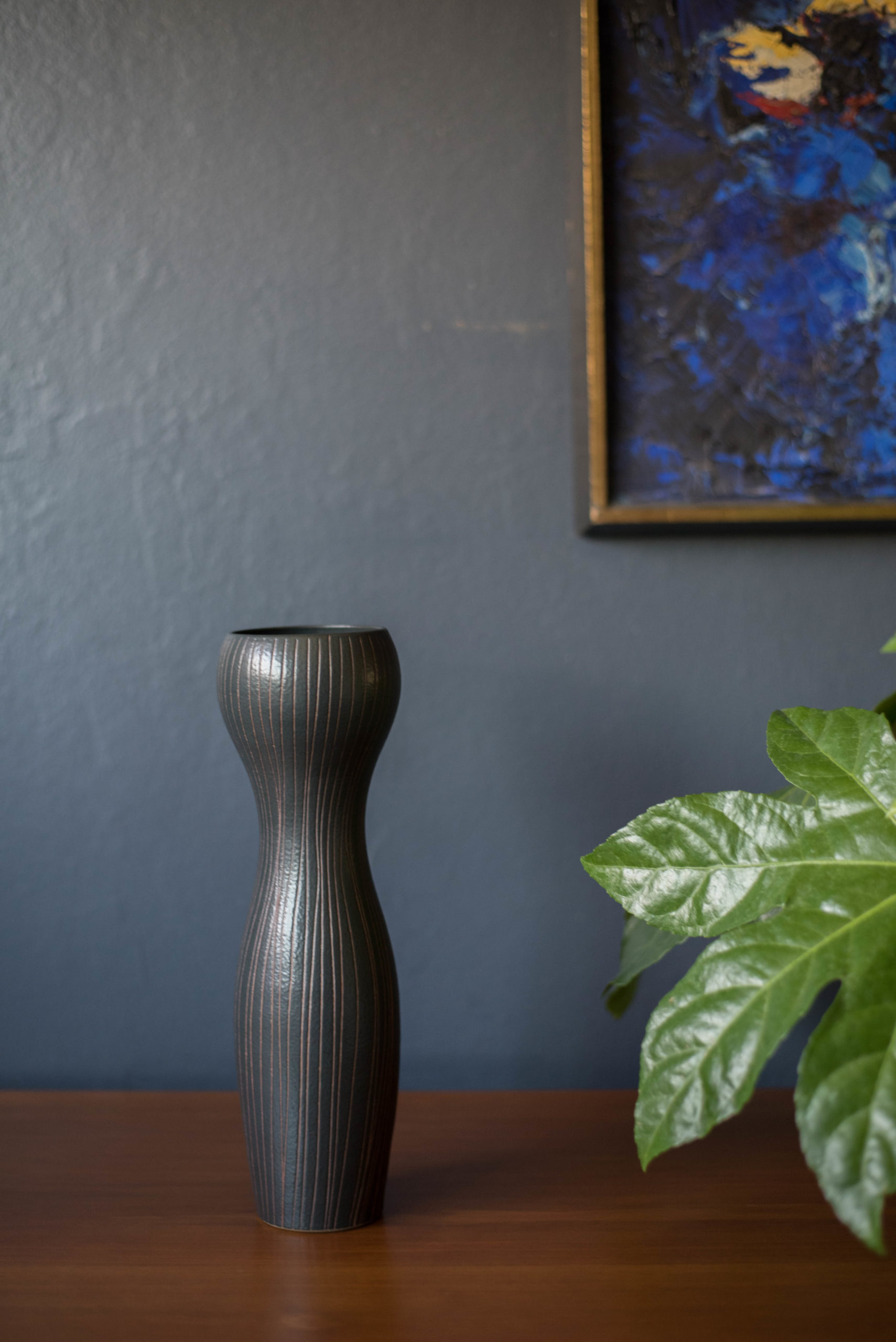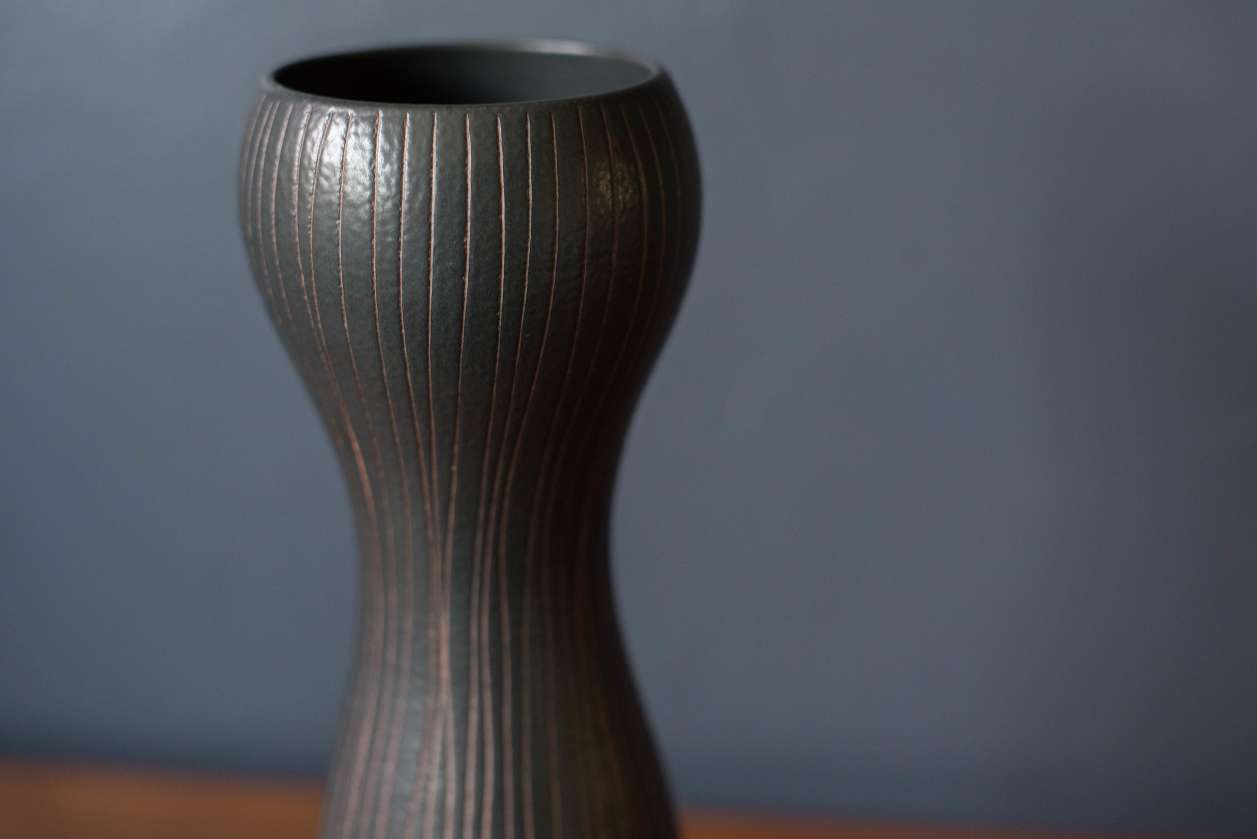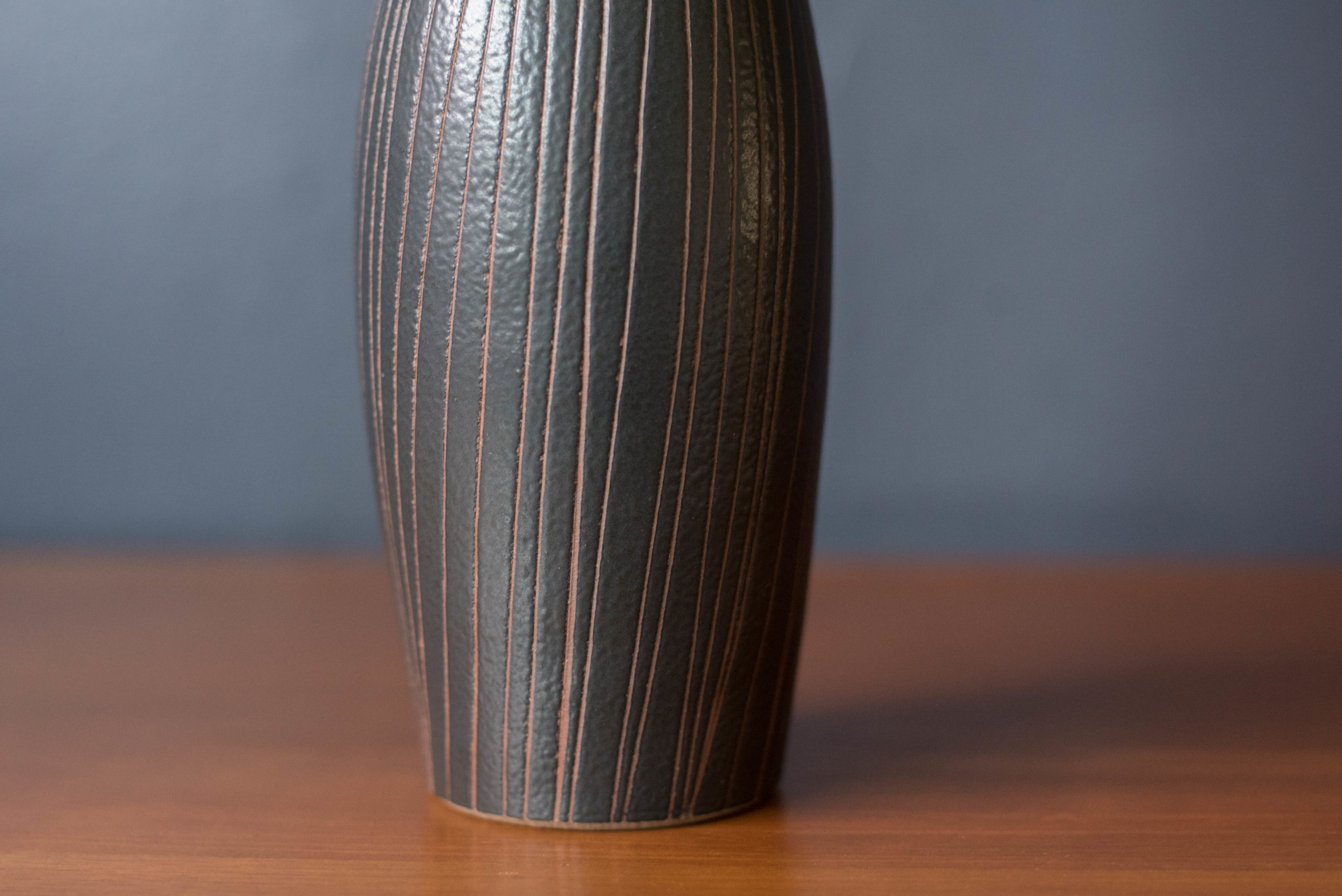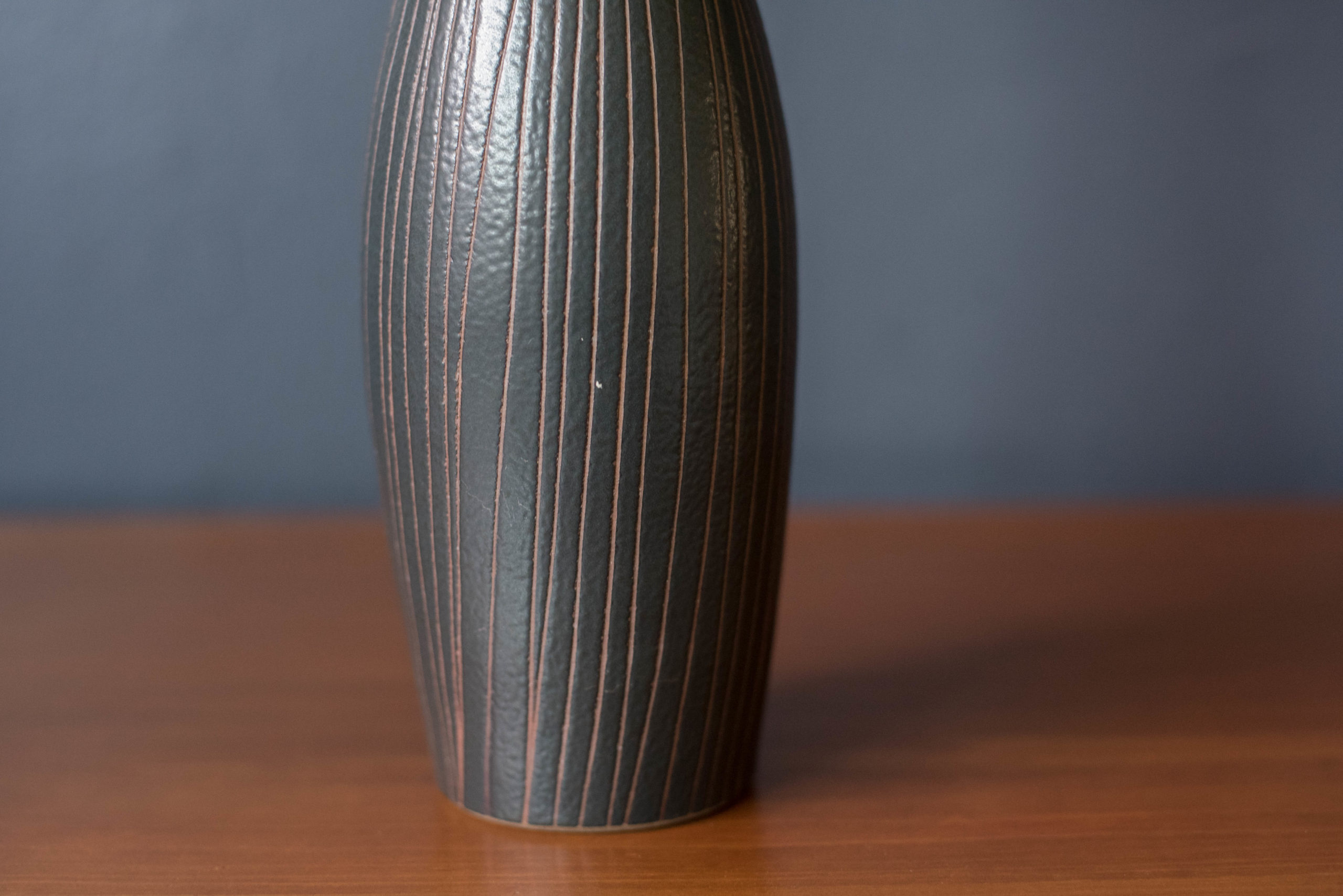 Mid-Century Modern ceramic pottery vase by Otagiri Mercantile Company, circa 1960s. This unique vessel features a sculptural stoneware shape with natural decorative incising in a matte black finish.