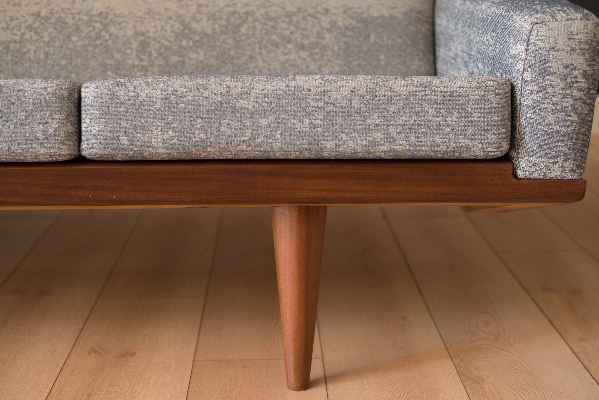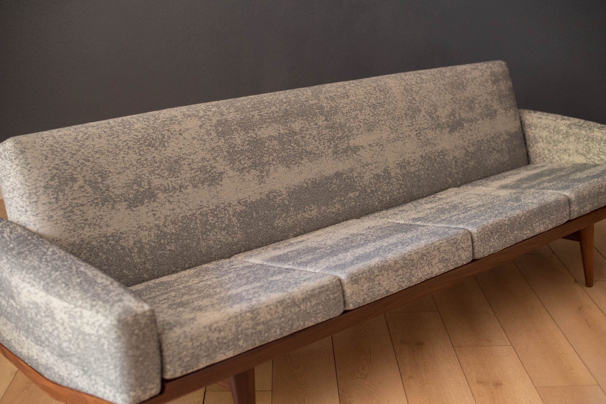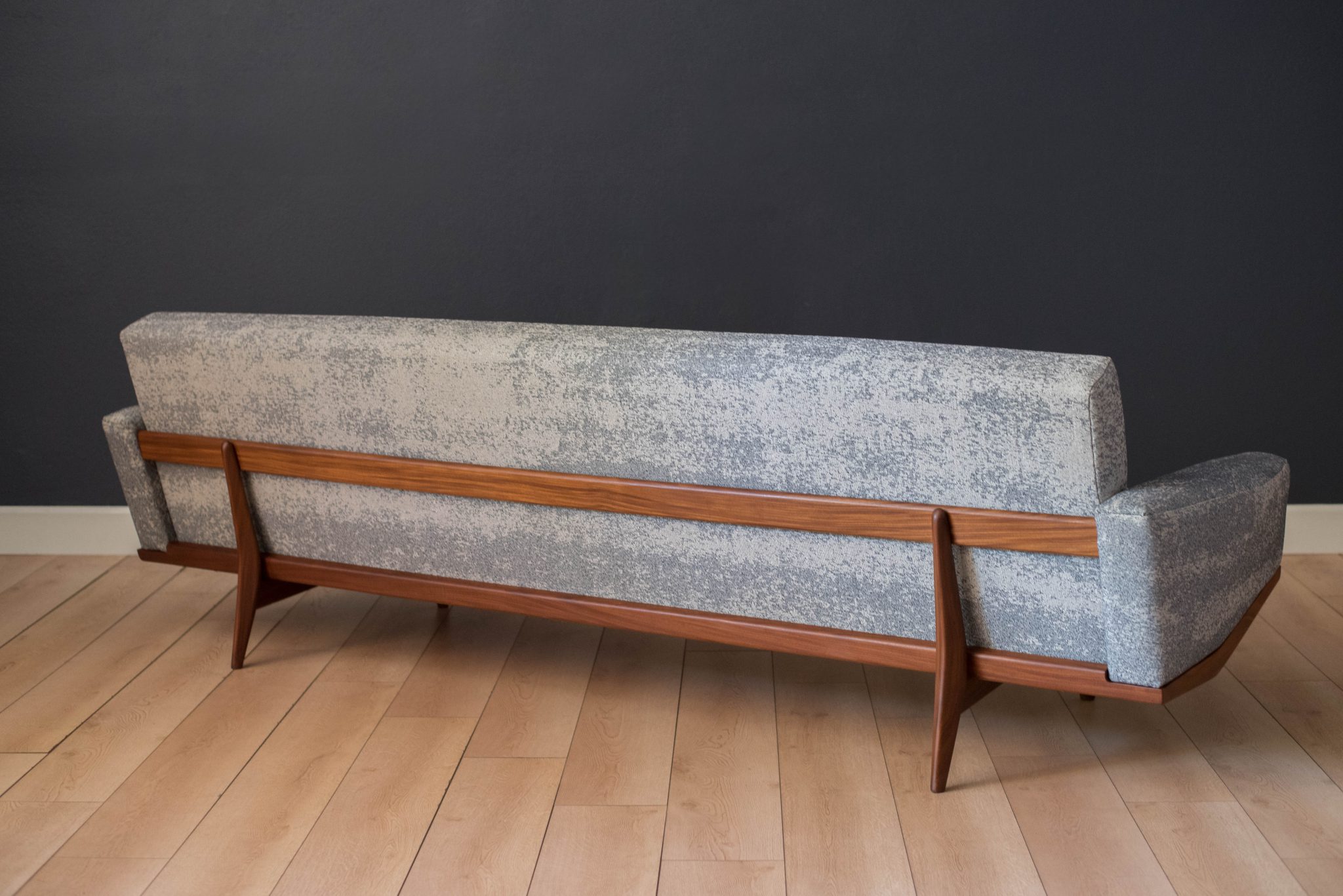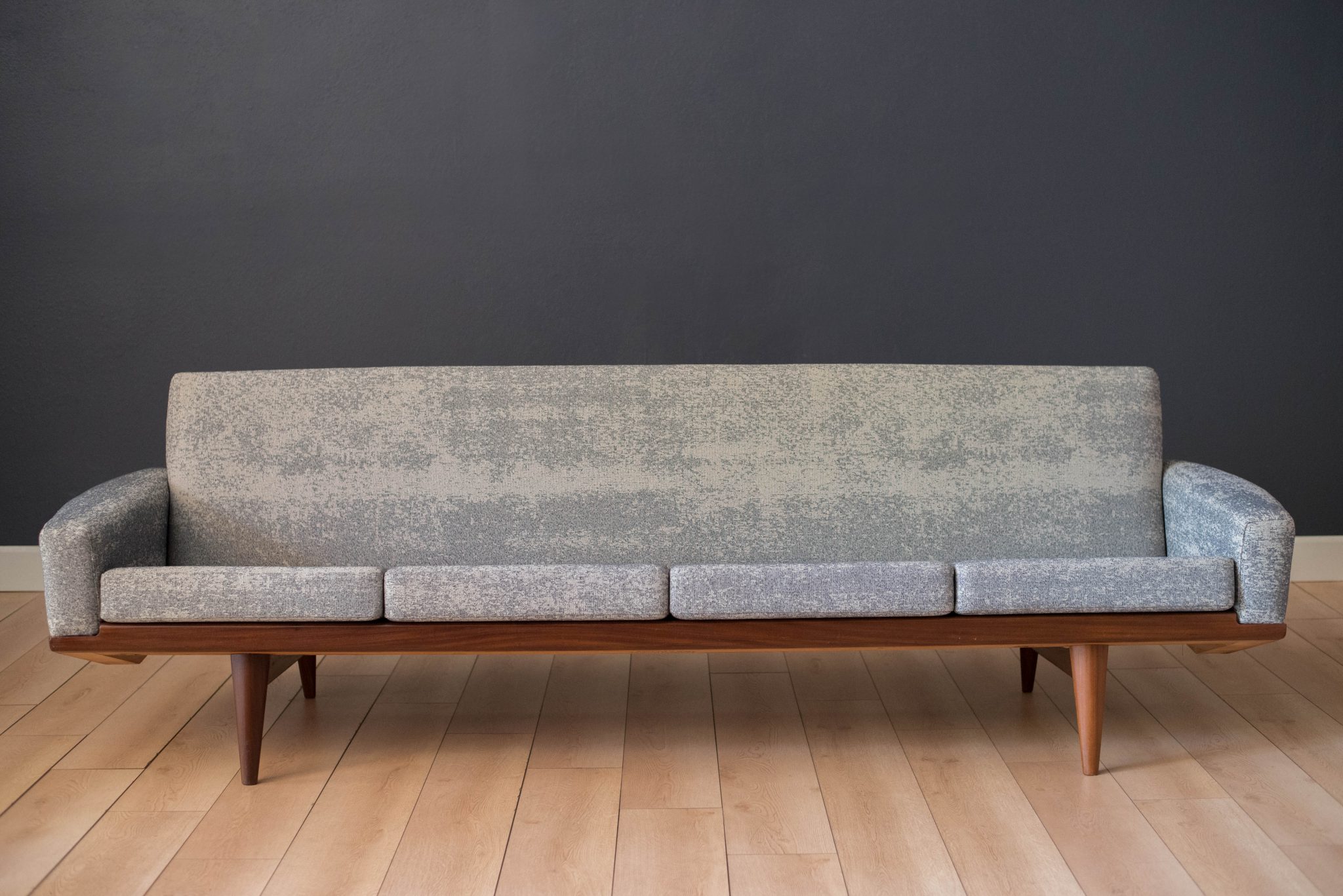 Mid-Century Modern four-seat sofa designed by H.W. Klein for N.A. Jørgensens Møbelfabrik, Bramin. This statement piece features a sculptural teak frame that displays well from all angles. Cushions are supported by original sinuous springs throughout that are built to last. Newly reupholstered in a blue and grey textile blend by Maharam Kvadrat. Complements any Danish modern or contemporary space.