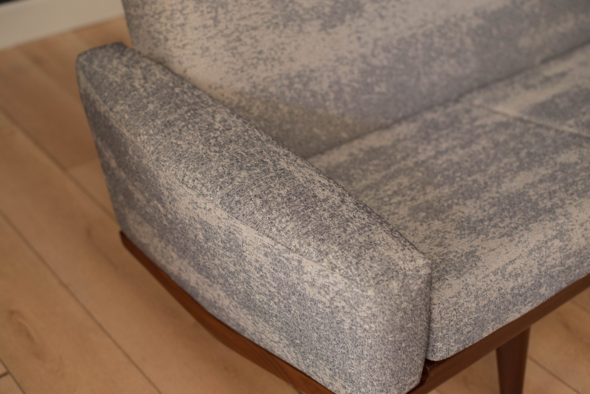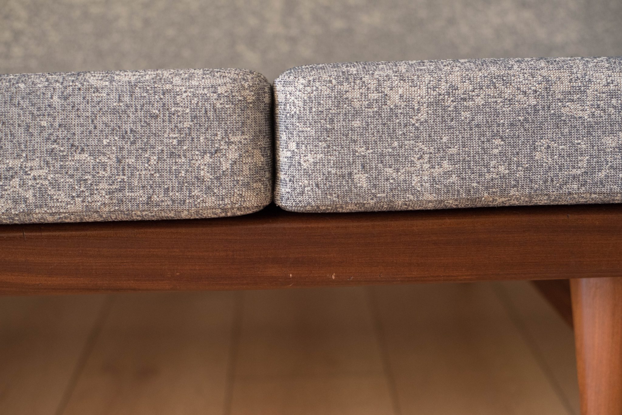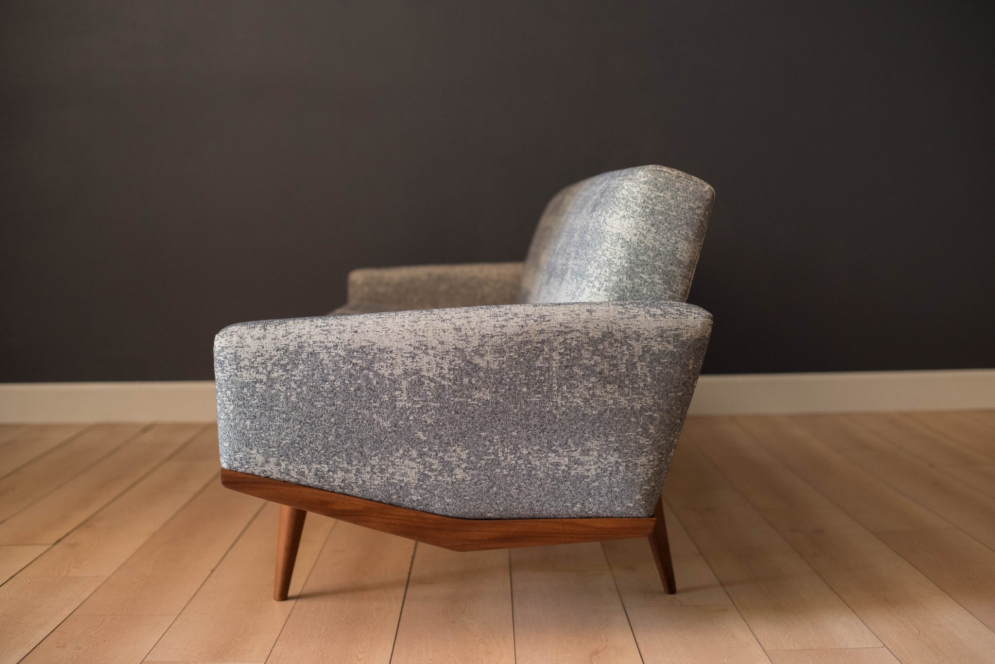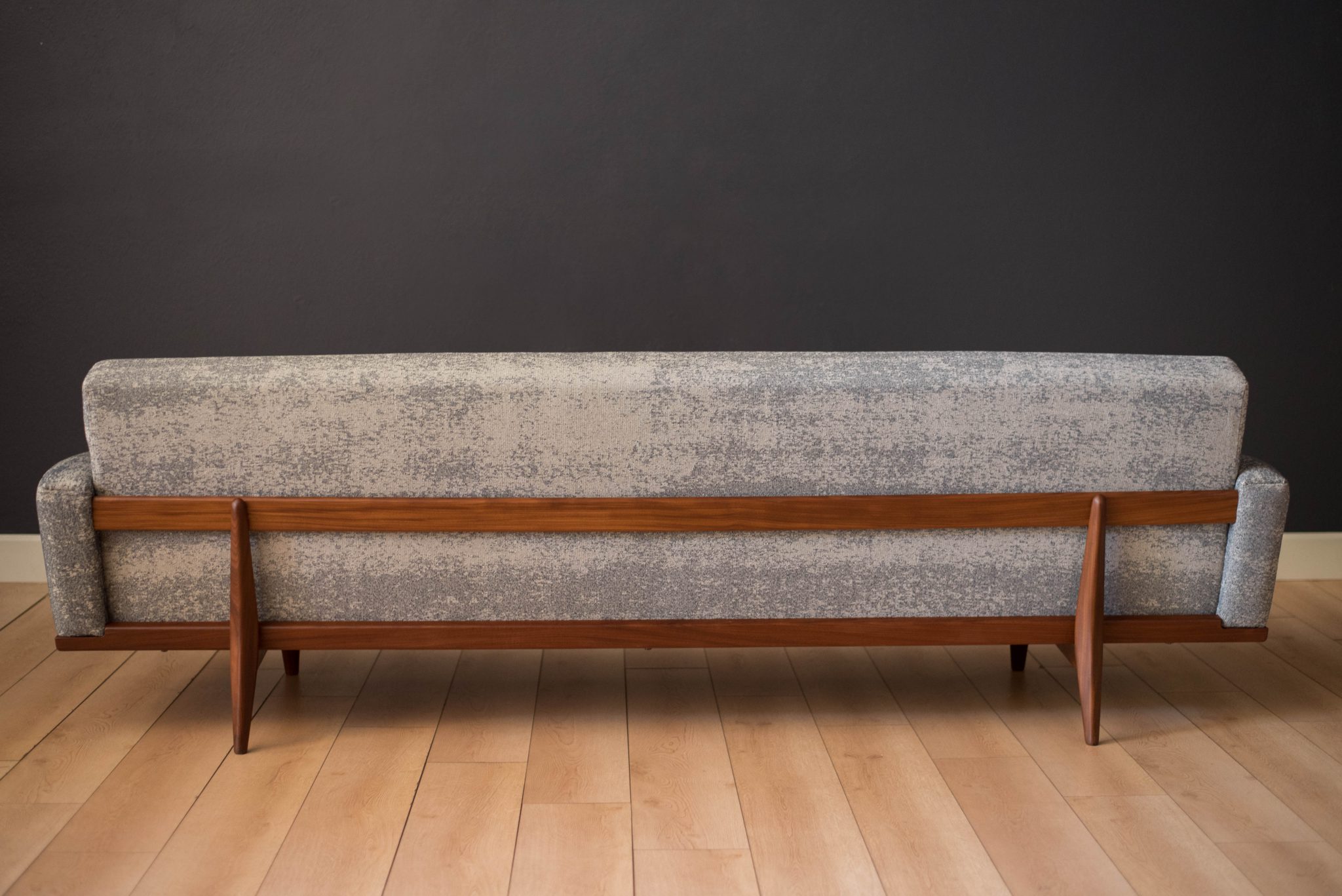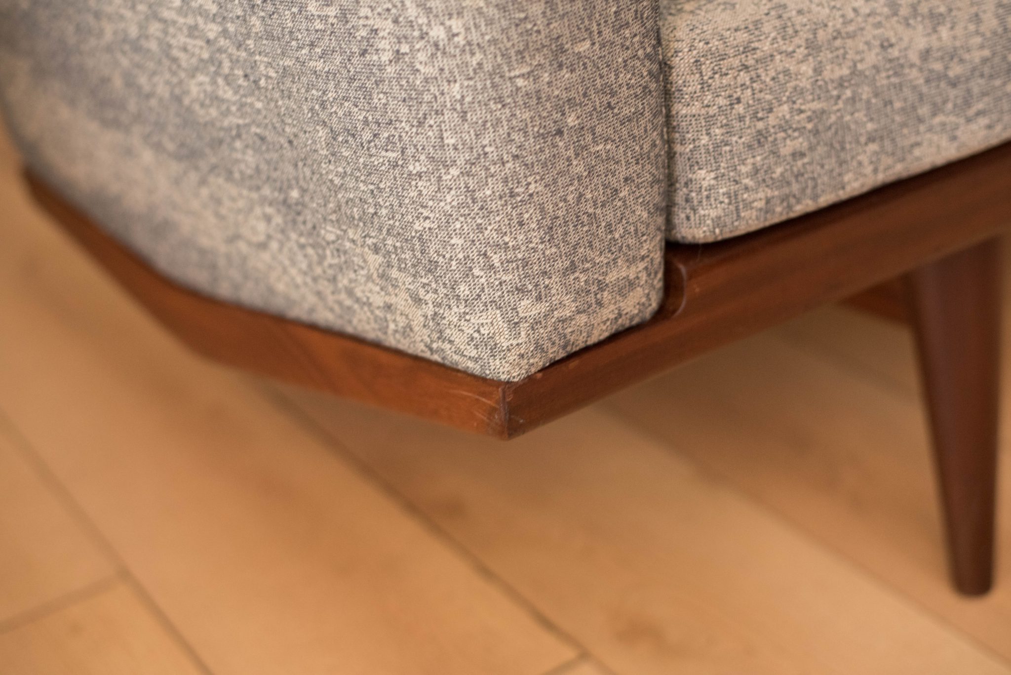 Mid-Century Modern four-seat sofa designed by H.W. Klein for N.A. Jørgensens Møbelfabrik, Bramin. This statement piece features a sculptural teak frame that displays well from all angles. Cushions are supported by original sinuous springs throughout that are built to last. Newly reupholstered in a blue and grey textile blend by Maharam Kvadrat. Complements any Danish modern or contemporary space.