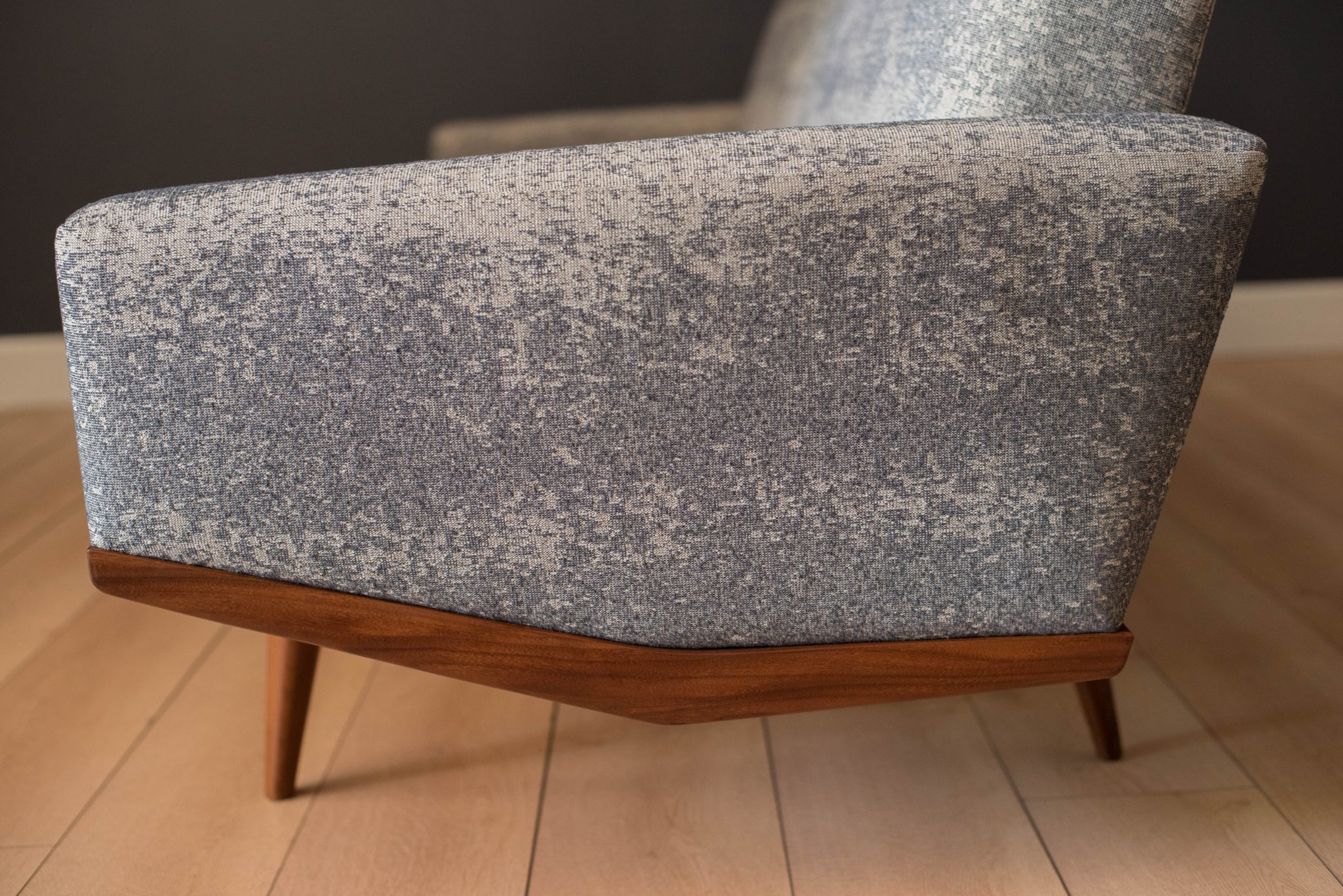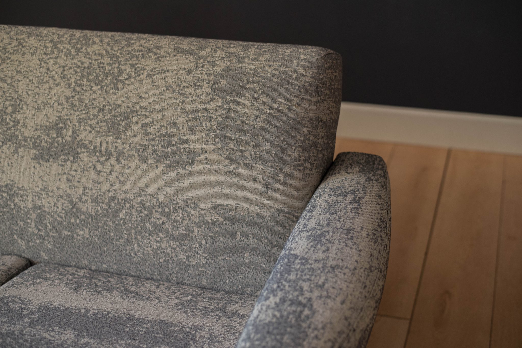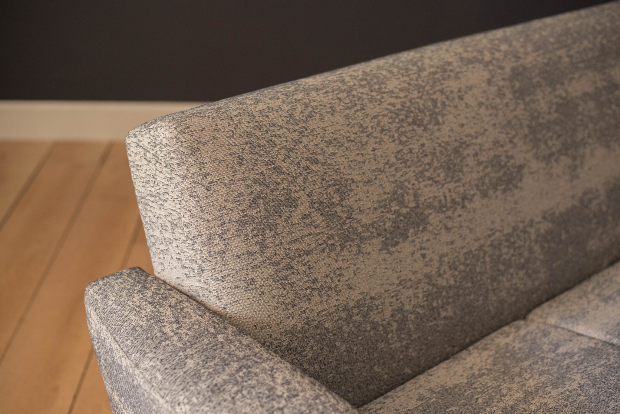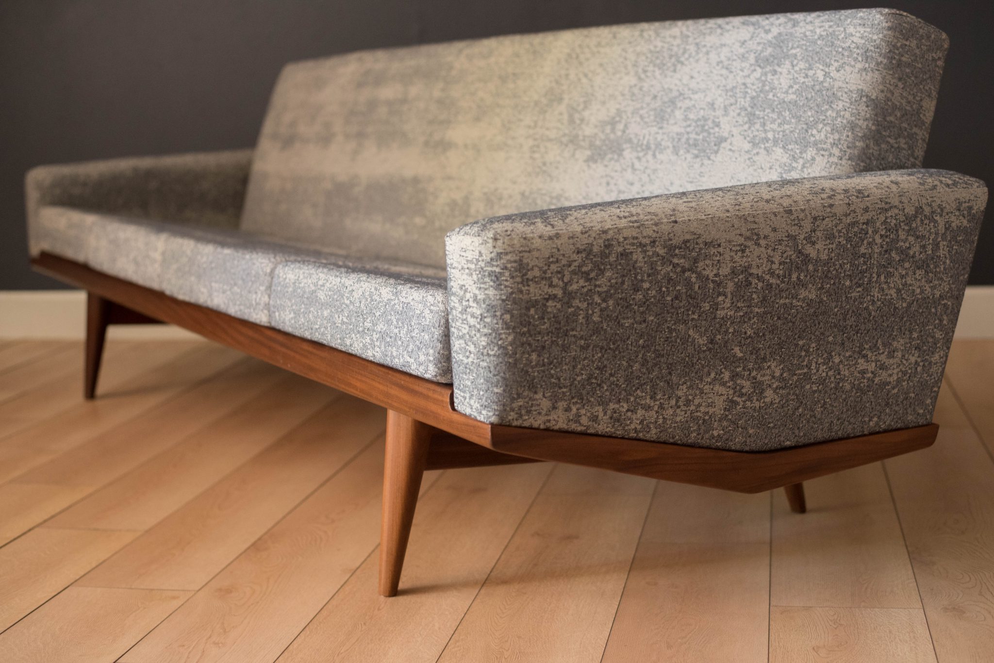 Mid-Century Modern four-seat sofa designed by H.W. Klein for N.A. Jørgensens Møbelfabrik, Bramin. This statement piece features a sculptural teak frame that displays well from all angles. Cushions are supported by original sinuous springs throughout that are built to last. Newly reupholstered in a blue and grey textile blend by Maharam Kvadrat. Complements any Danish modern or contemporary space.