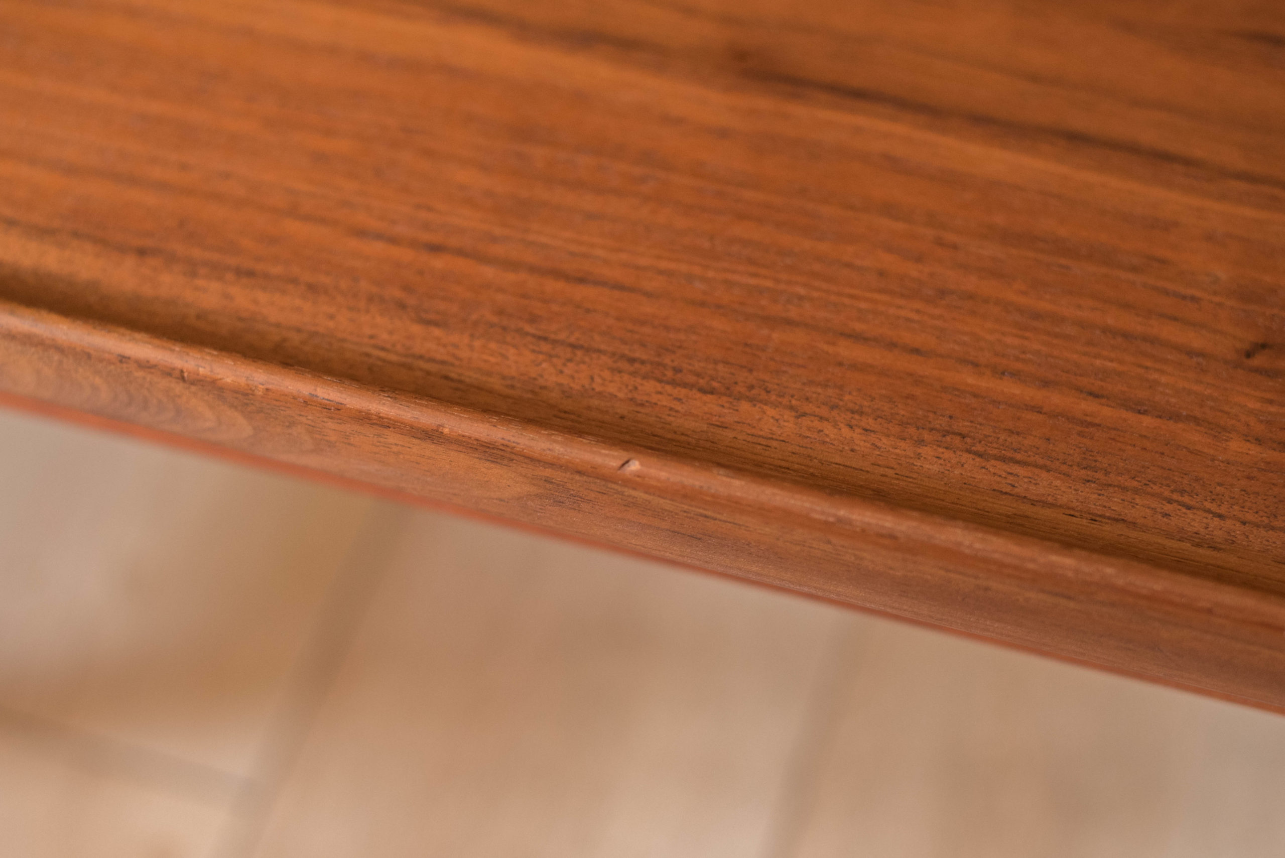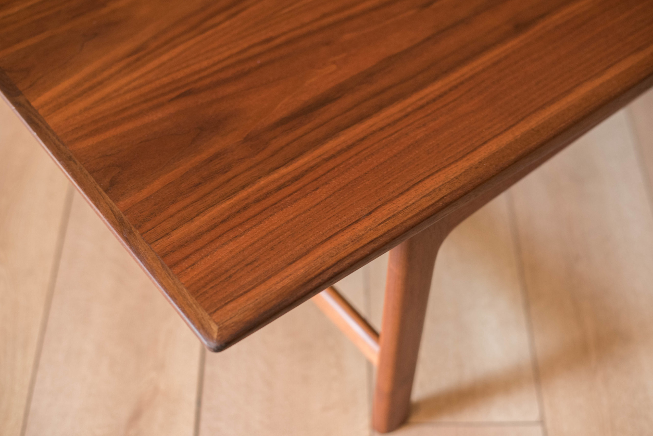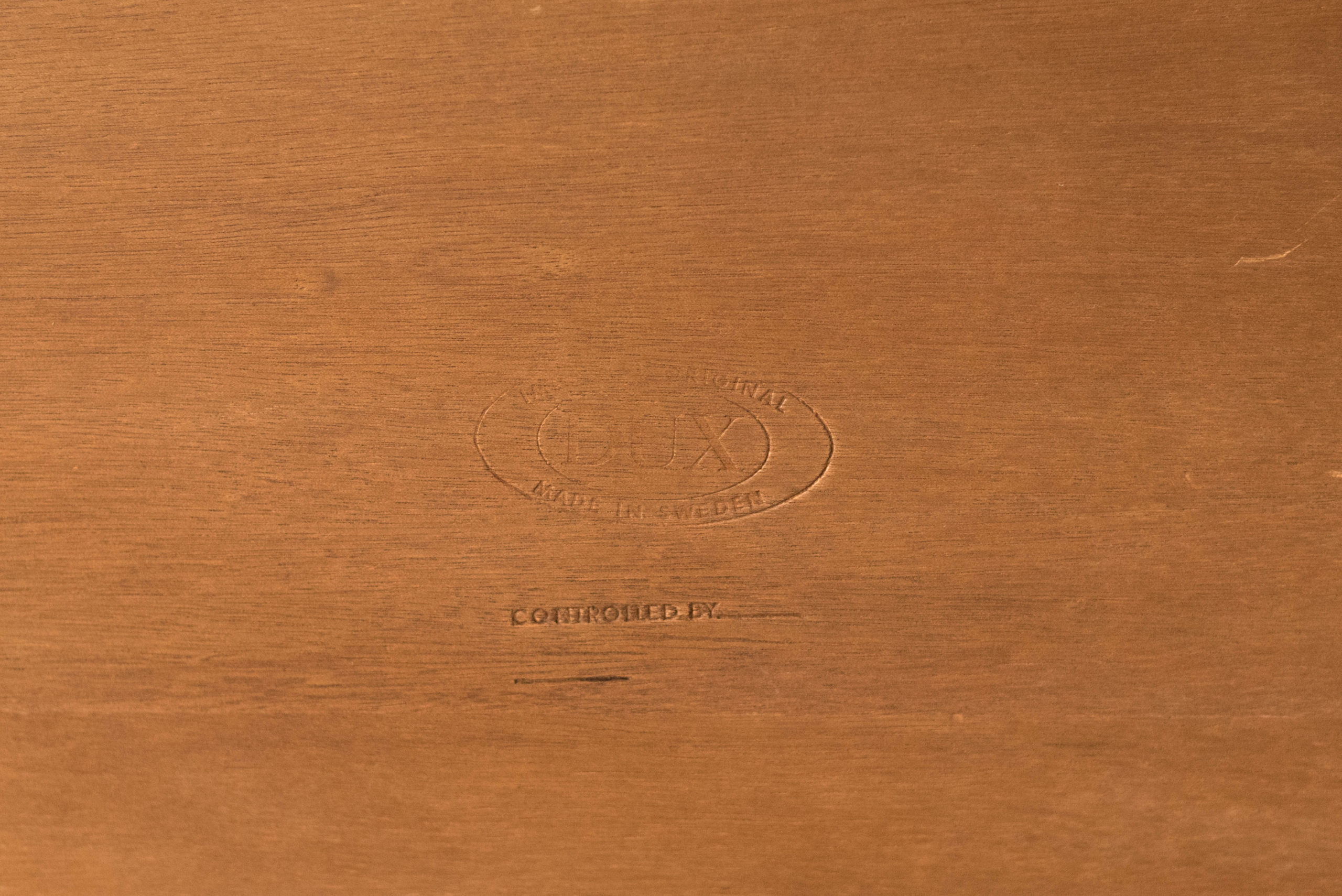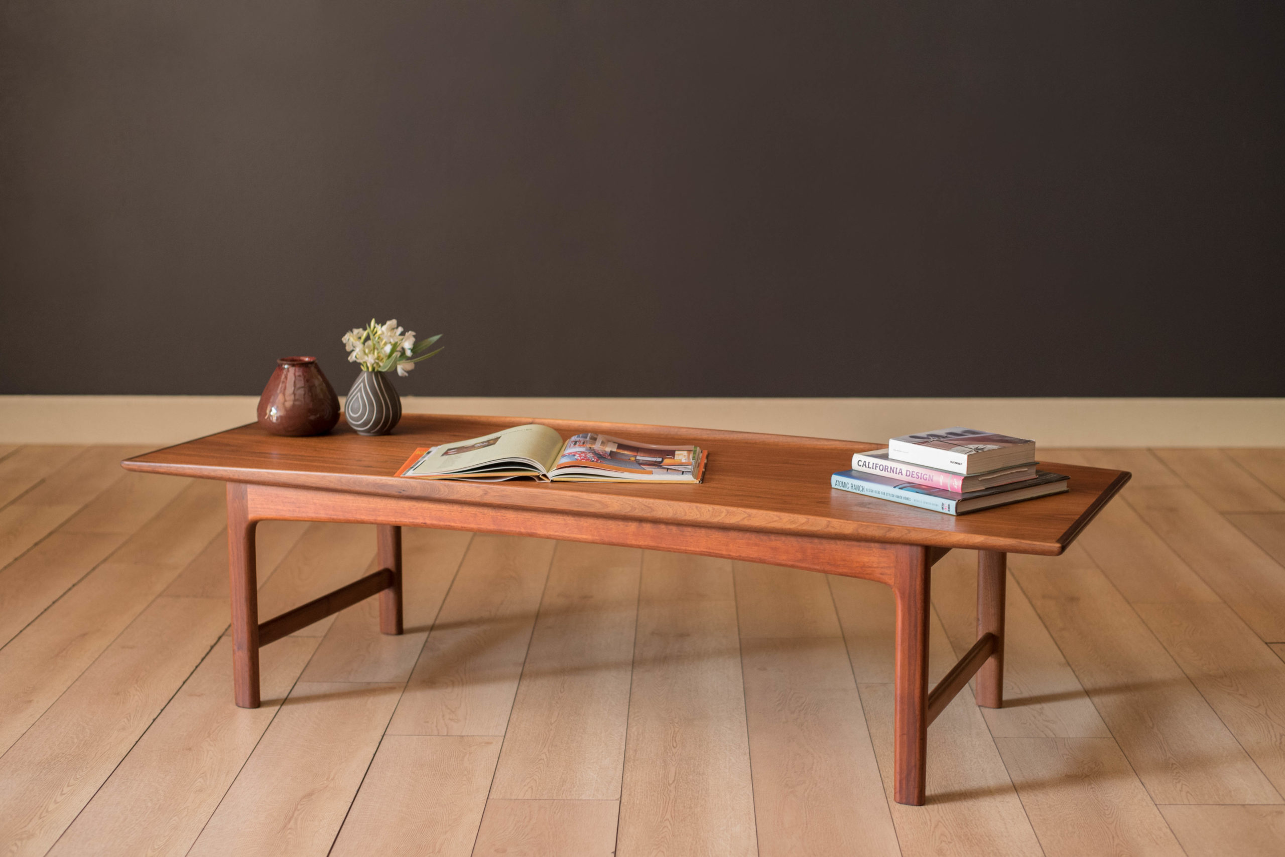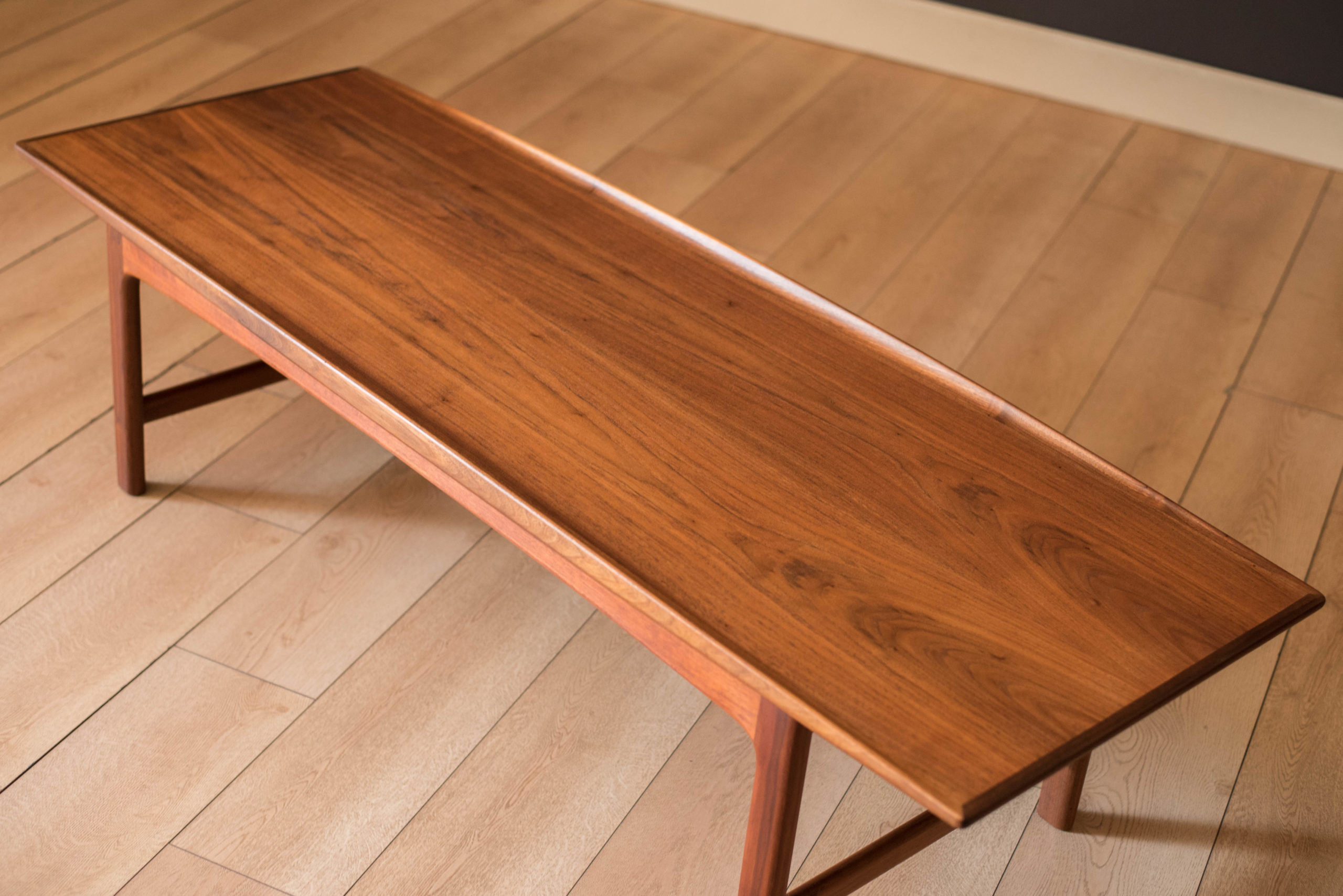 Mid century modern coffee table in walnut designed by Folke Ohlsson for DUX, Sweden. This classic piece features a warm natural wood grain pattern and raised sculpted edges. Supporting base is constructed with sturdy solid walnut legs. The perfect piece to complement a long sofa and Danish modern living room space. In good condition with wear such as nicks, scratches, and scuffs. See photos.