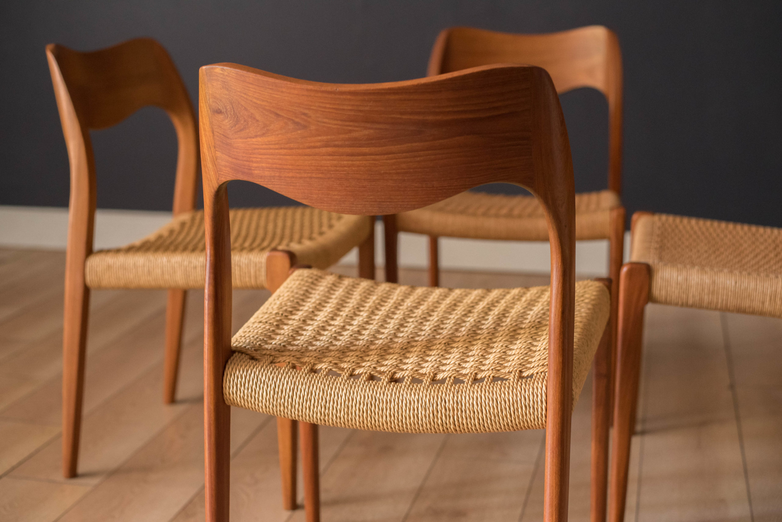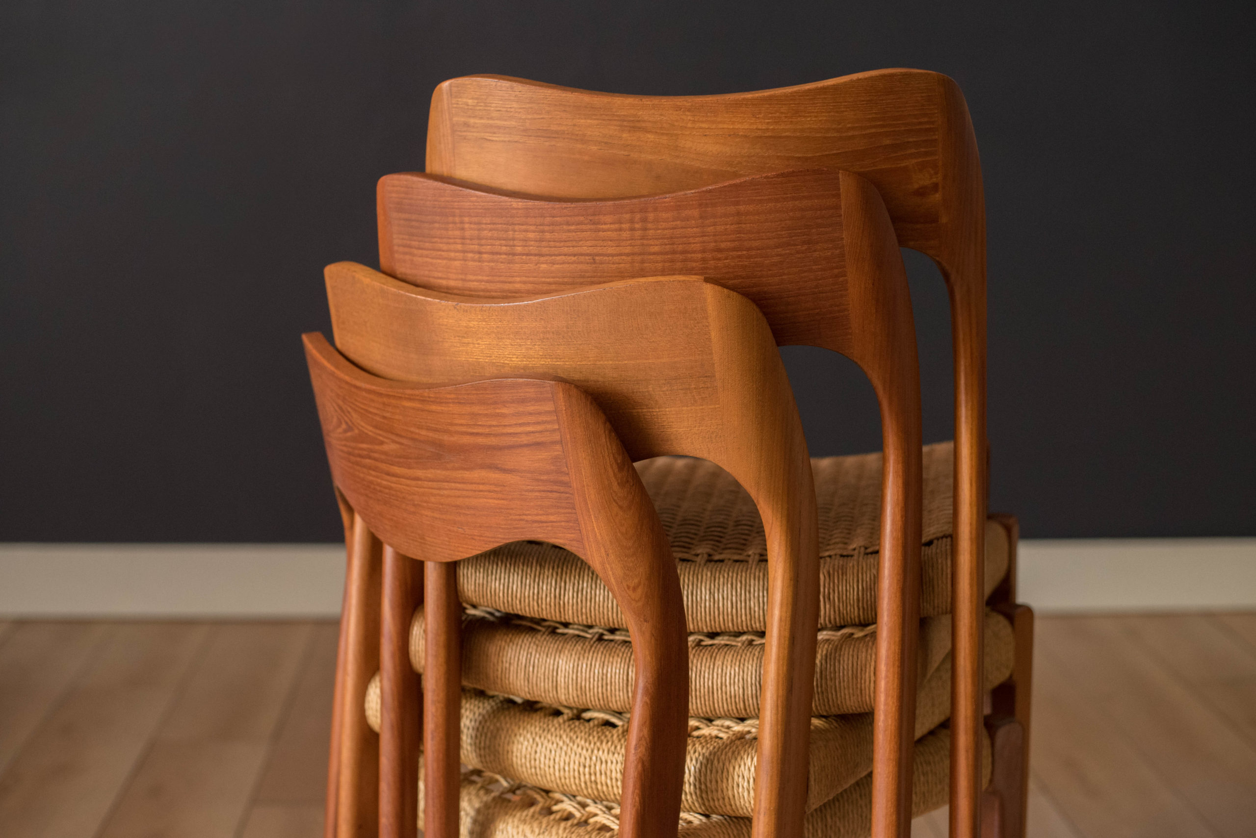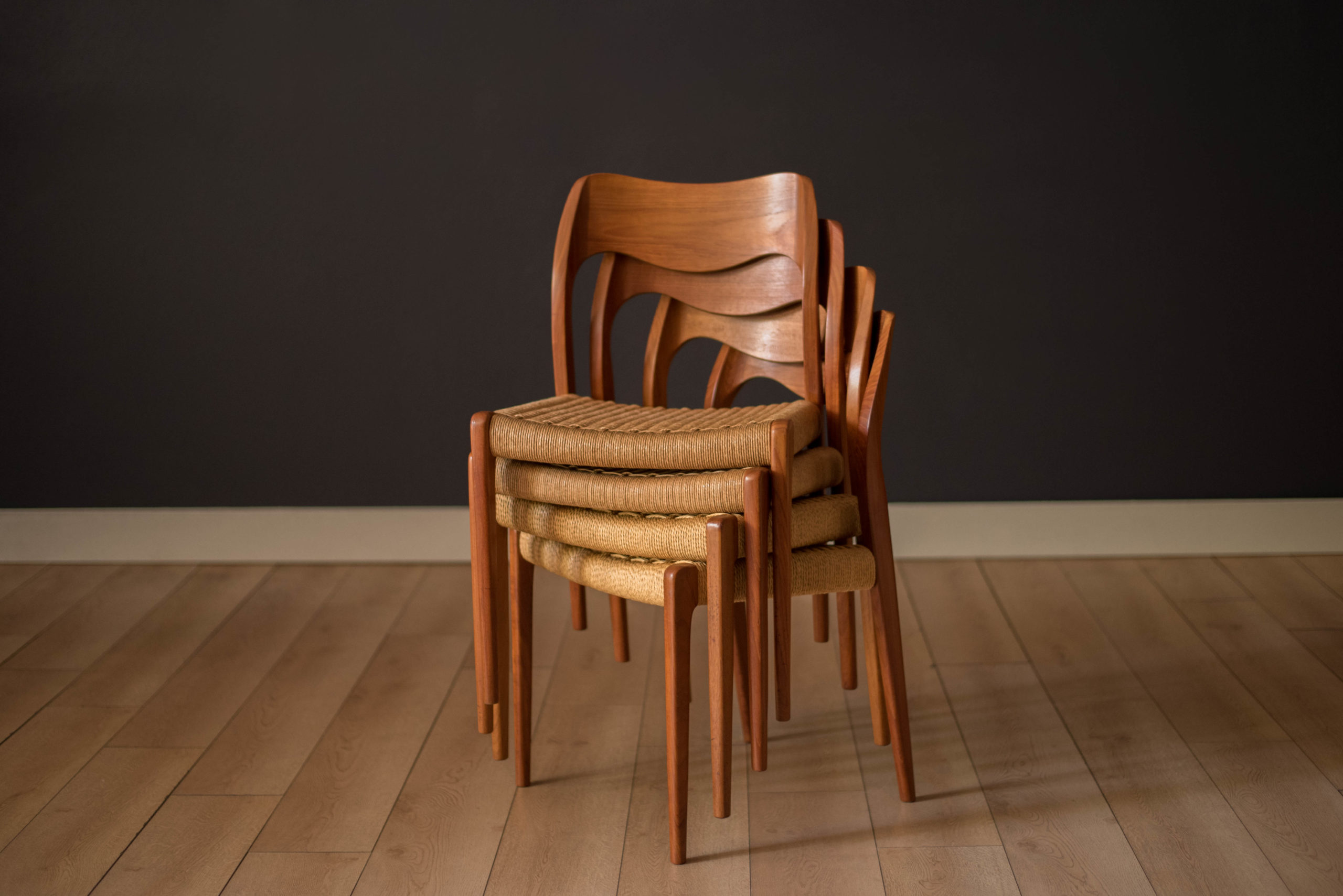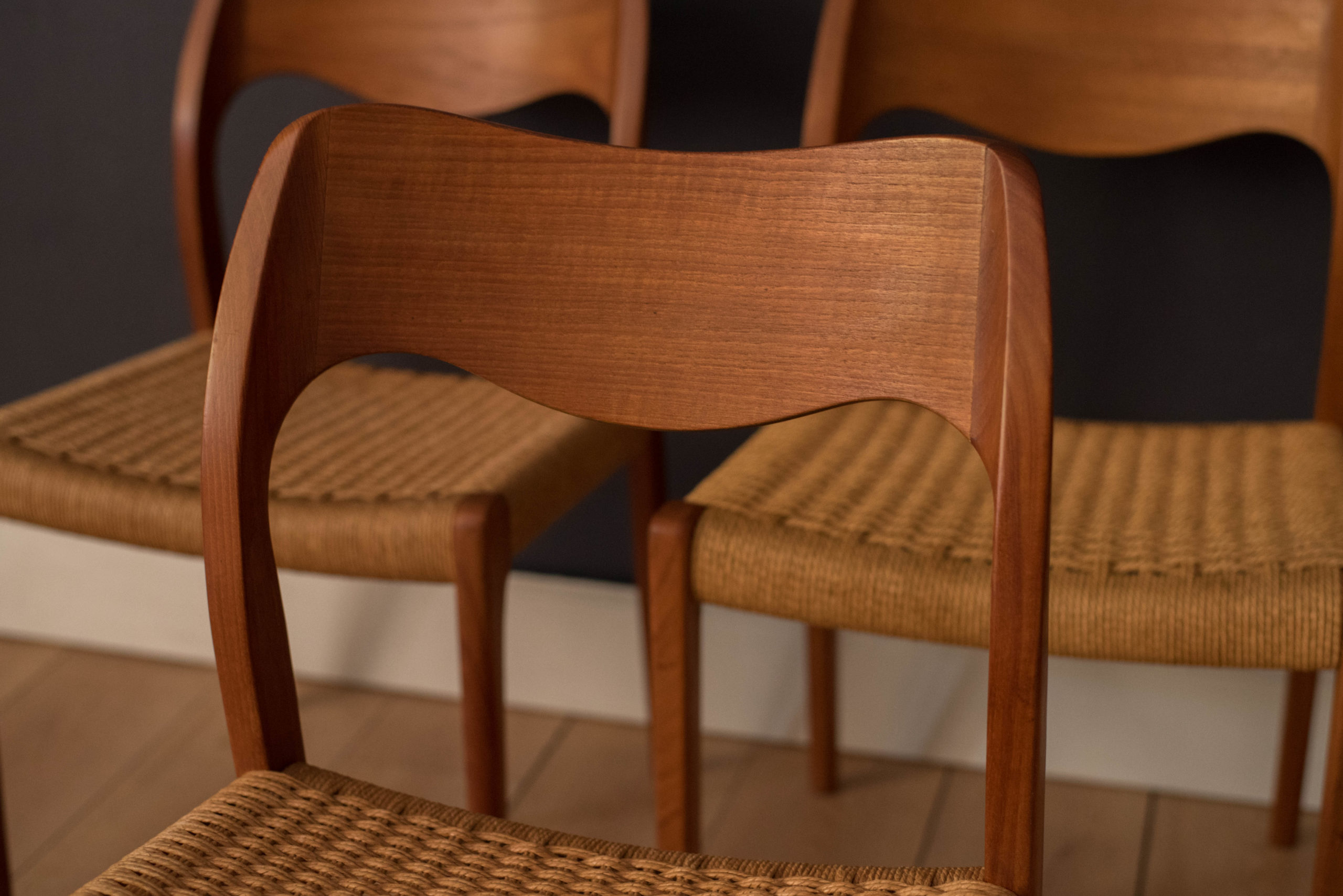 Mid century modern dining chairs by Niels O. Møller for J.L. Møller Møbelfabrik model no. 71, Denmark. This set features sculpted teak frames and retains the original paper cord seats. Price is for the set of four.