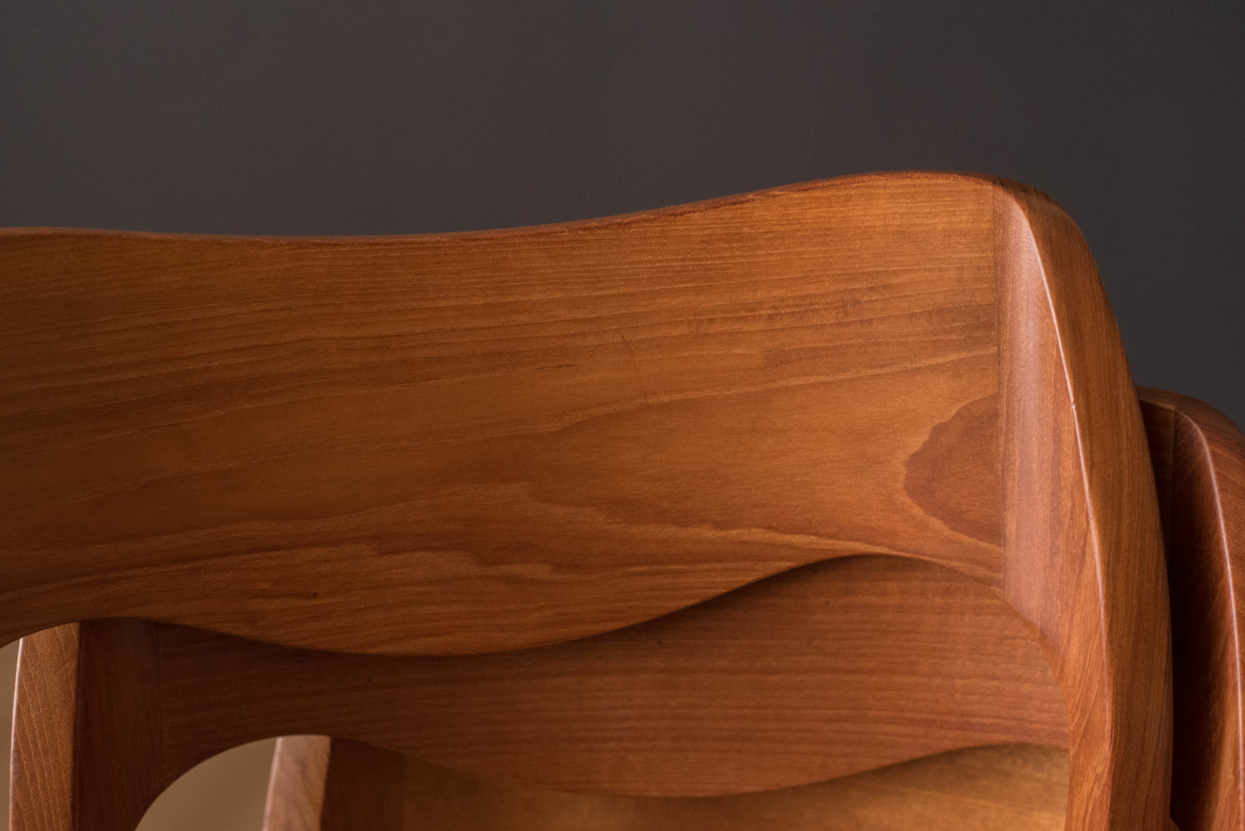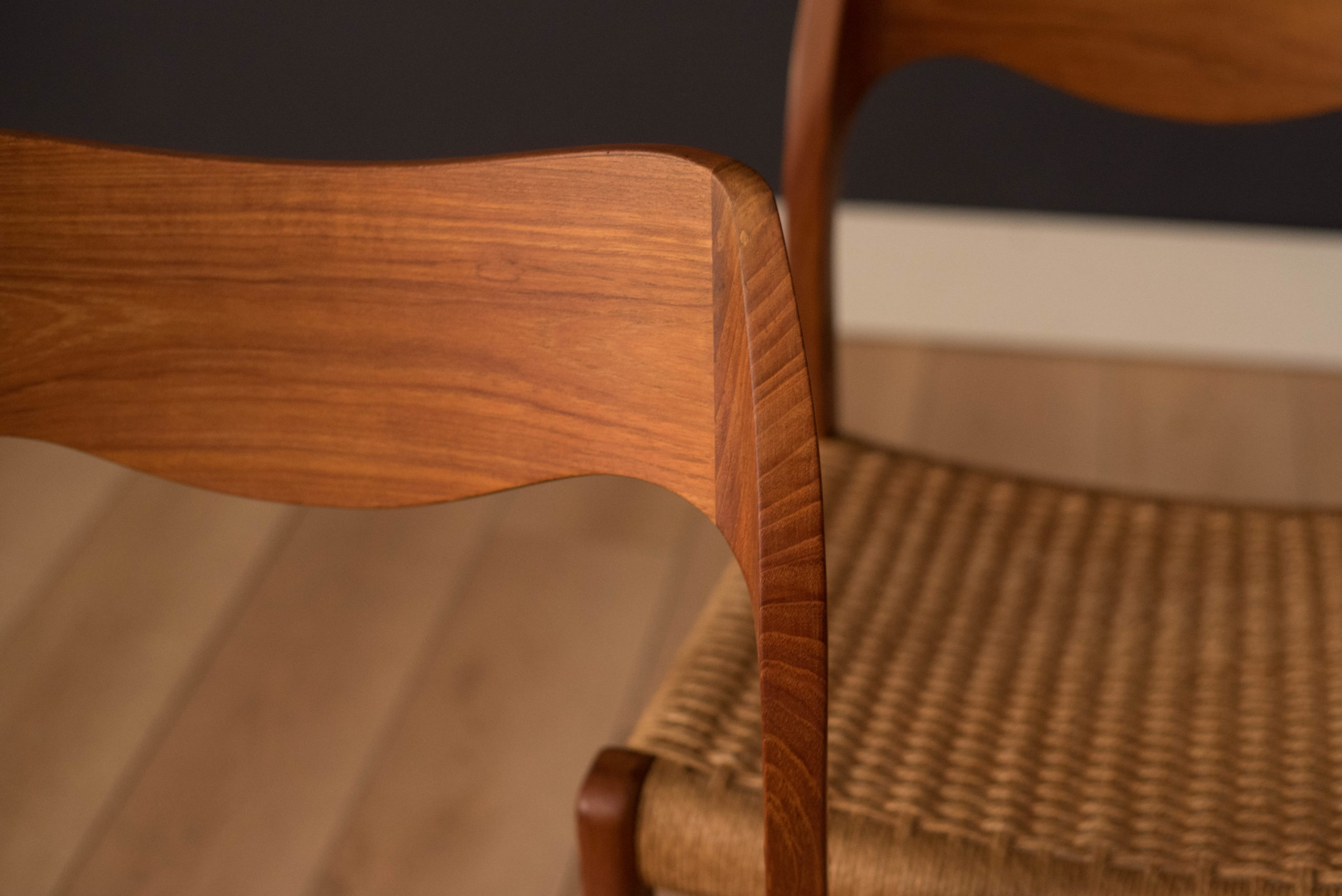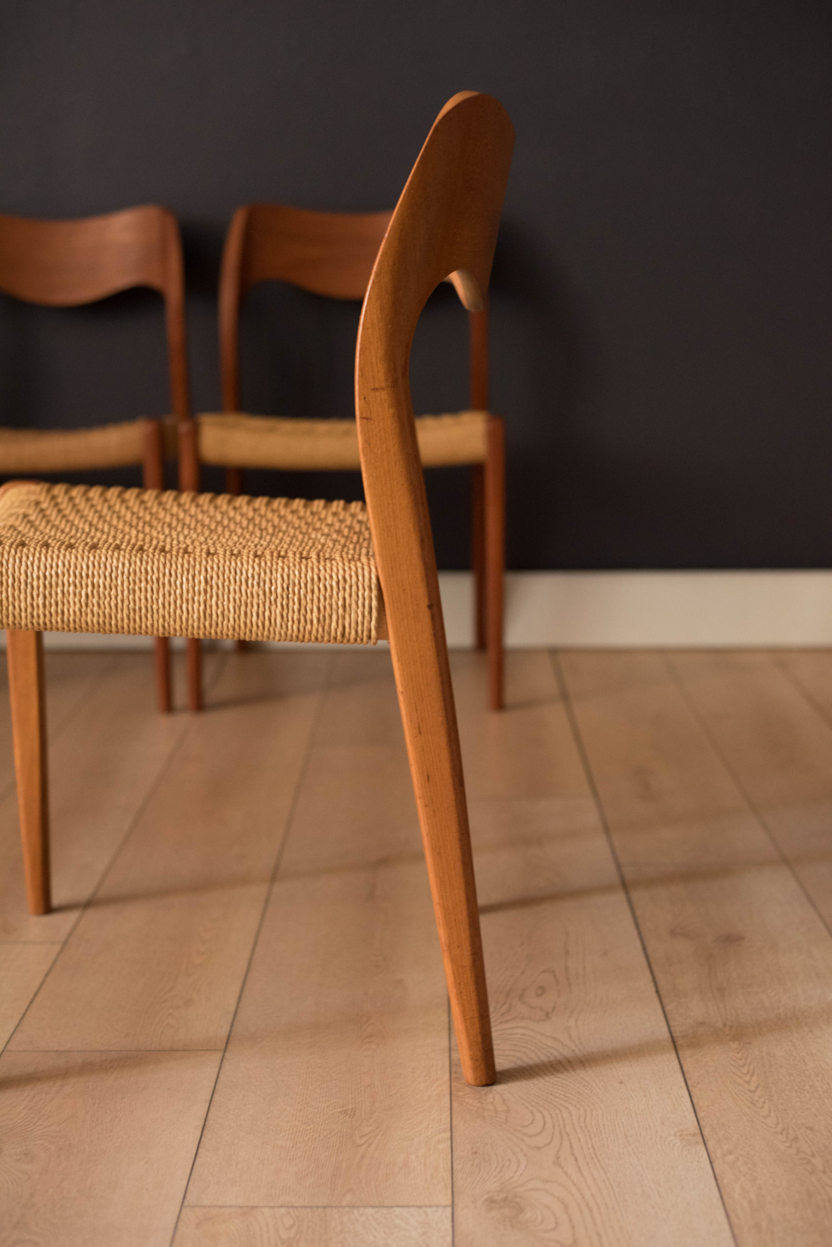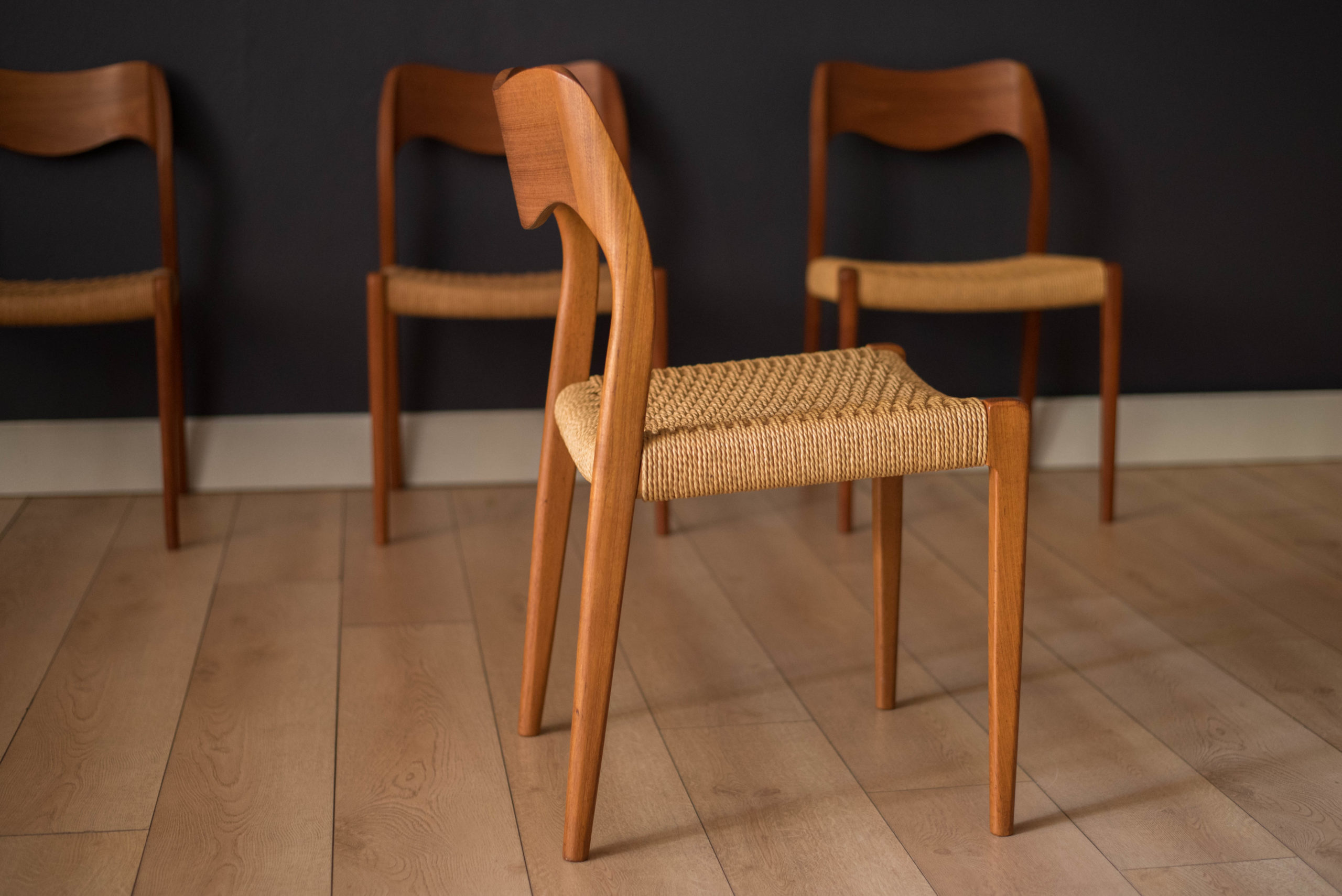 Mid century modern dining chairs by Niels O. Møller for J.L. Møller Møbelfabrik model no. 71, Denmark. This set features sculpted teak frames and retains the original paper cord seats. Price is for the set of four.