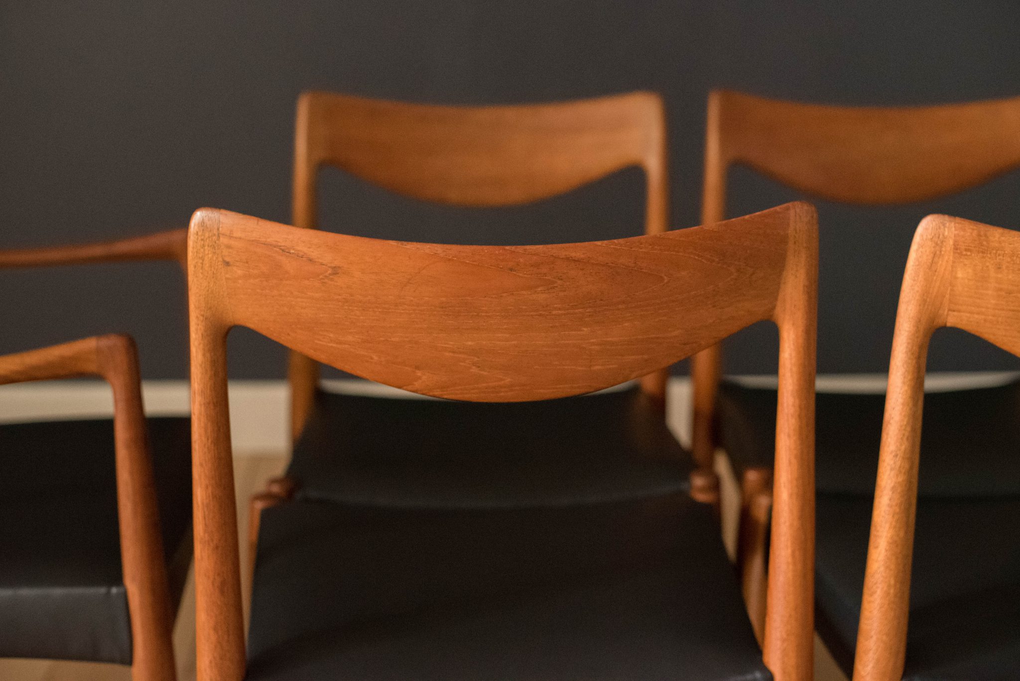 Mid-Century Modern model no. 65 dining chairs designed by Rastad & Relling for Gustav Bahus, Norway. Features sculptural teak frames and newly reupholstered seats in black vinyl. Includes one captain chair and five side chairs. Price is for the set.