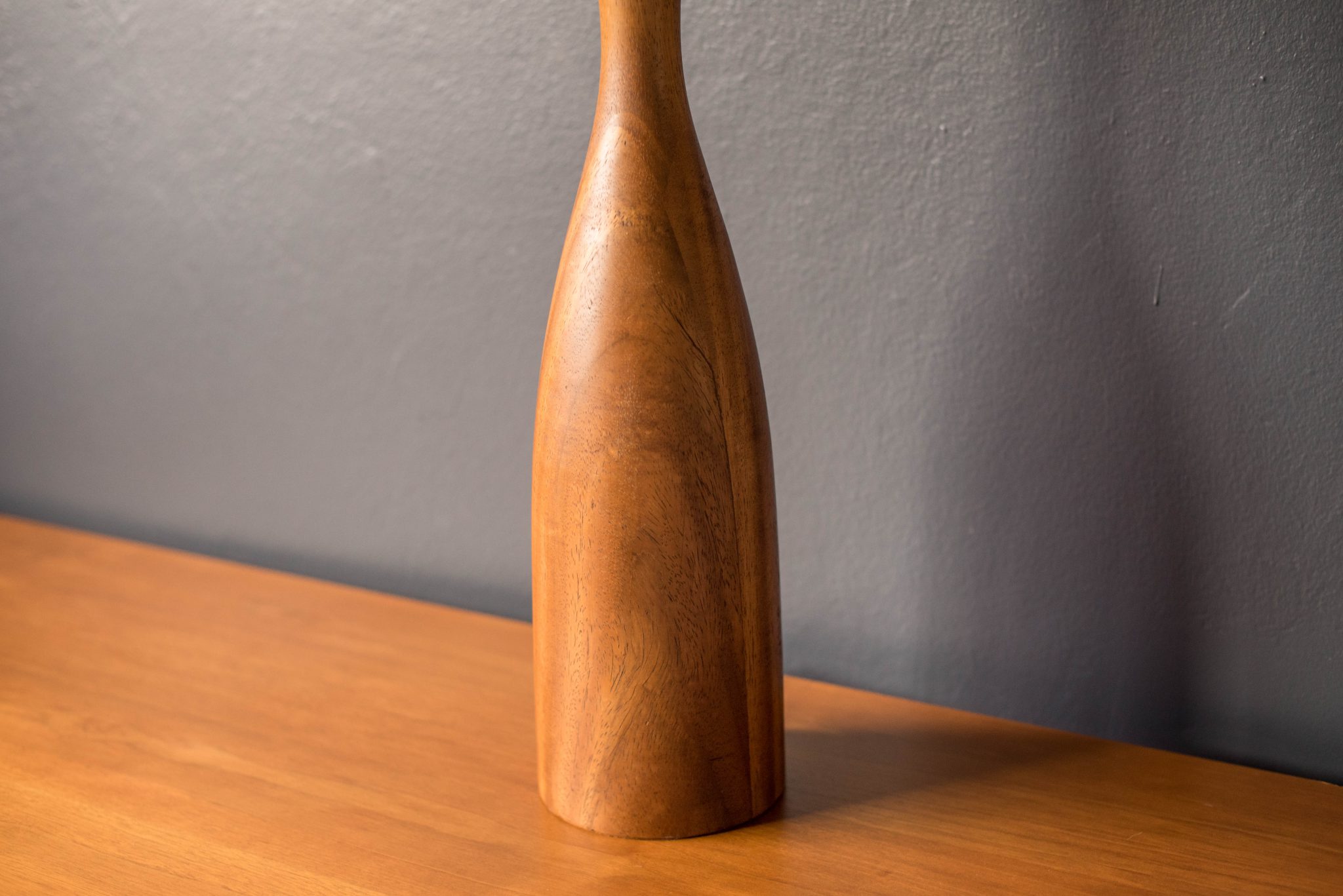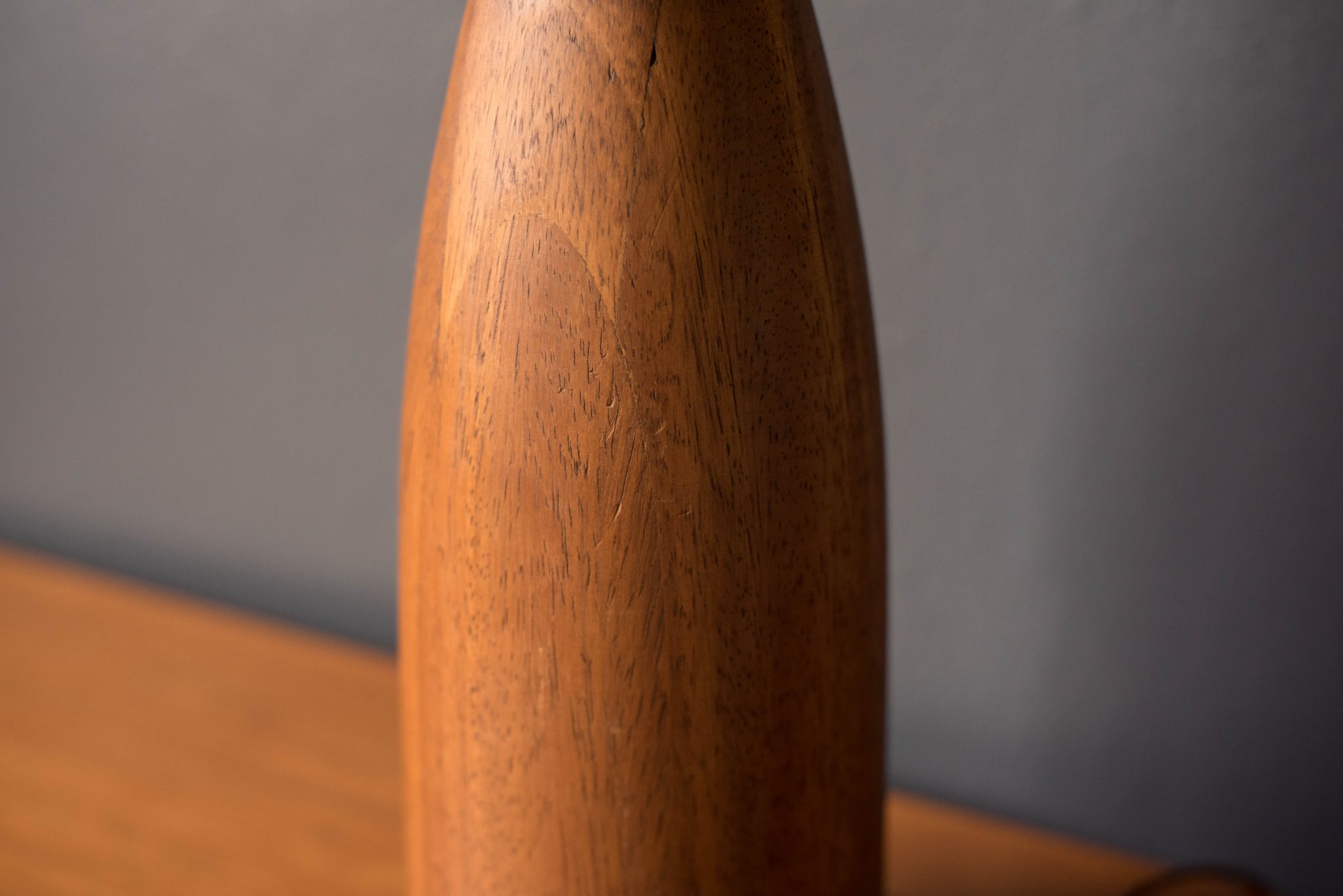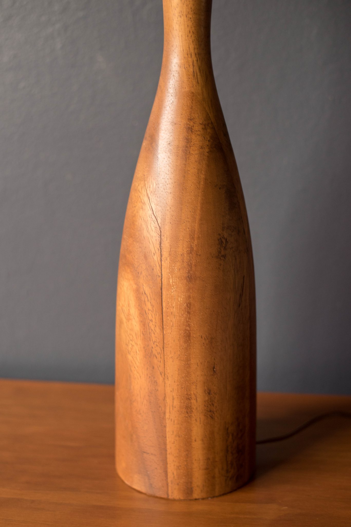 Mid-century modern tall table lamp c. 1960’s. This piece is made of solid planked mahogany with brass hardware. Includes a three-way switch mechanism.