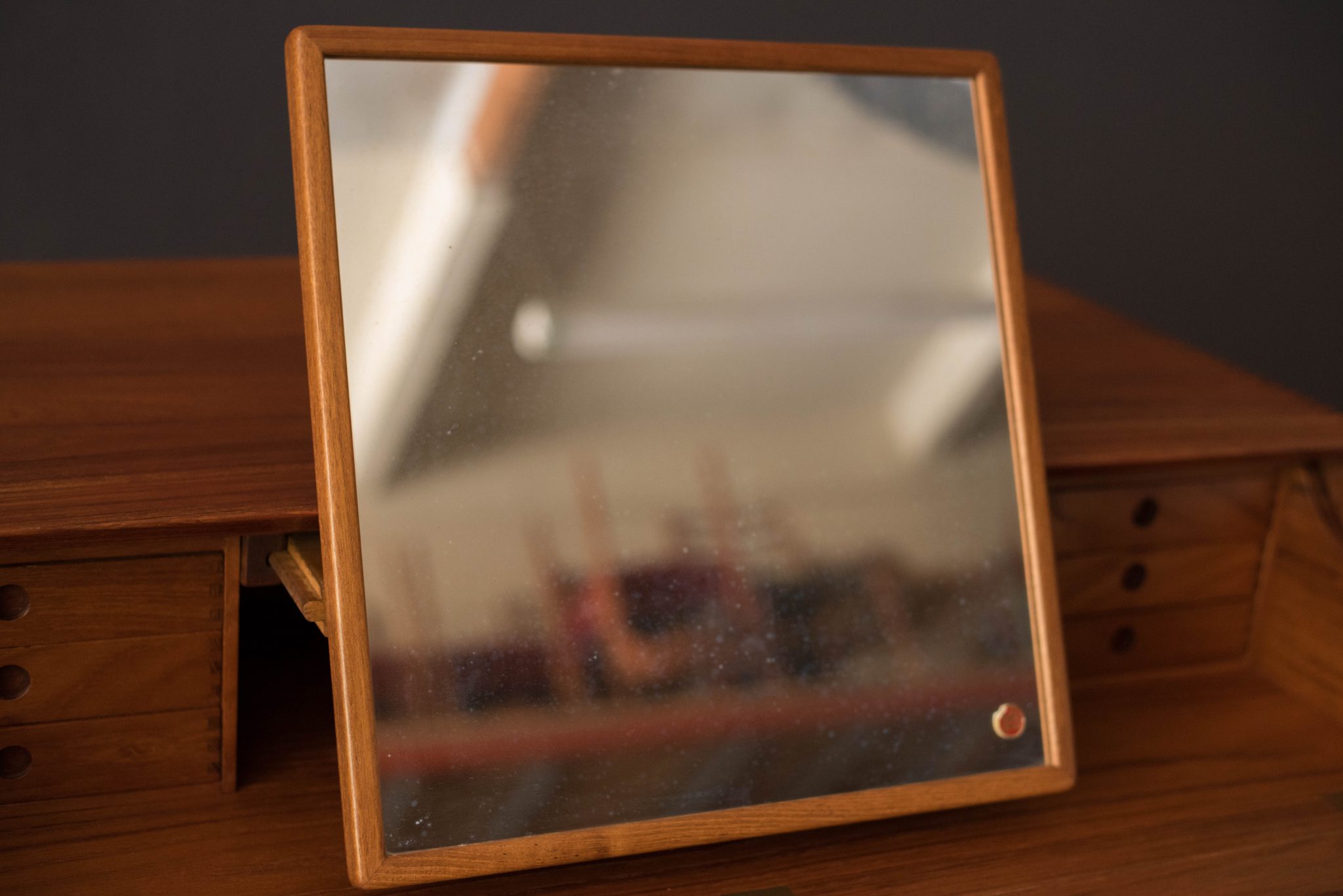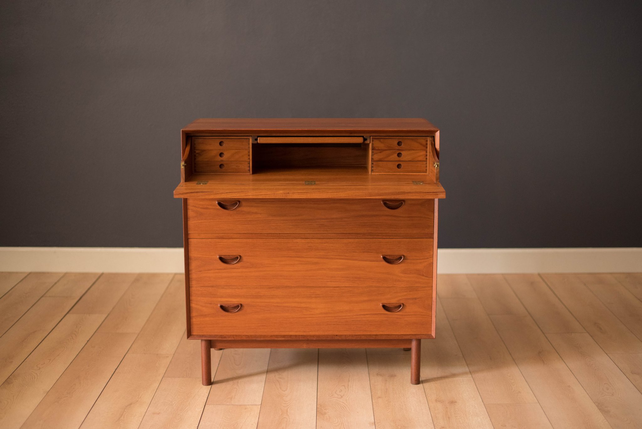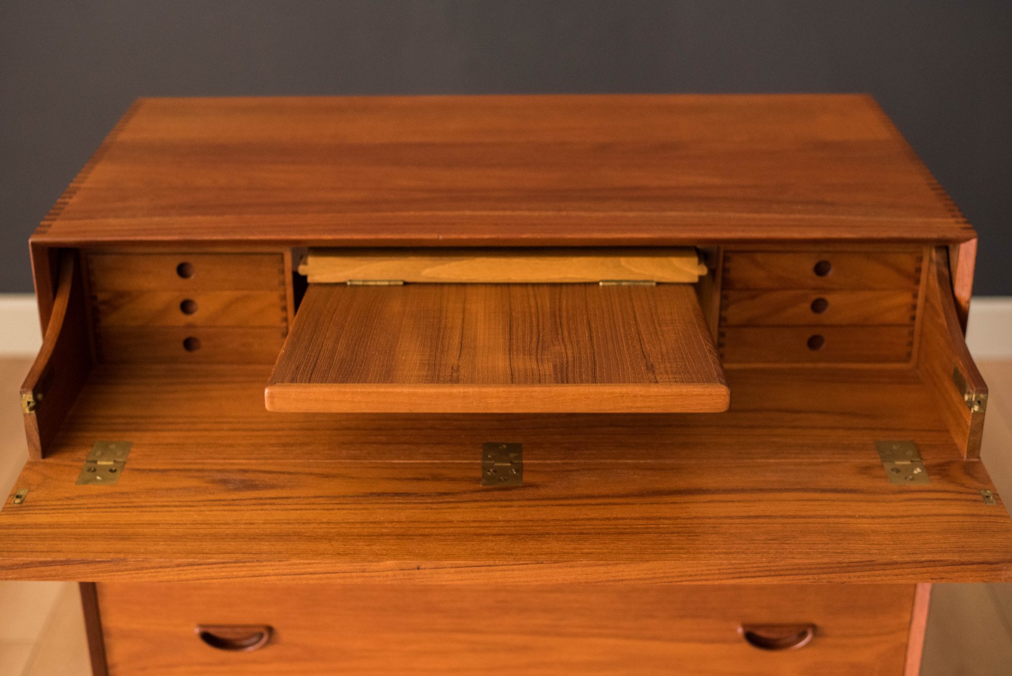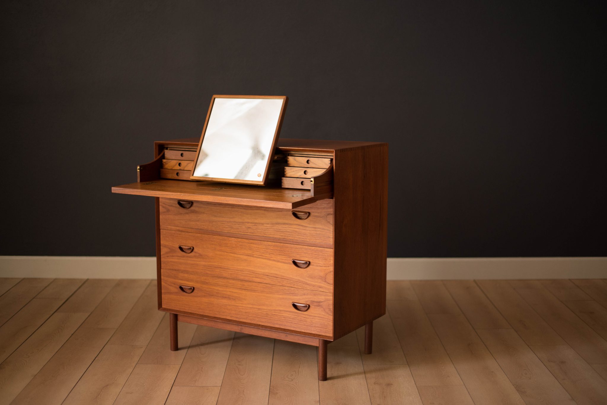 Mid century modern teak dresser chest designed by Peter Hvidt and Orla Mølgaard-Nielsen for Søborg Møbler. This piece includes three storage drawers with signature sculpted handles. Features a hidden mirror vanity slide out desk that reveals six additional small drawers. Solid teak case is constructed with detailed finger joinery and brass hardware. Matching cabinets available in separate listing.