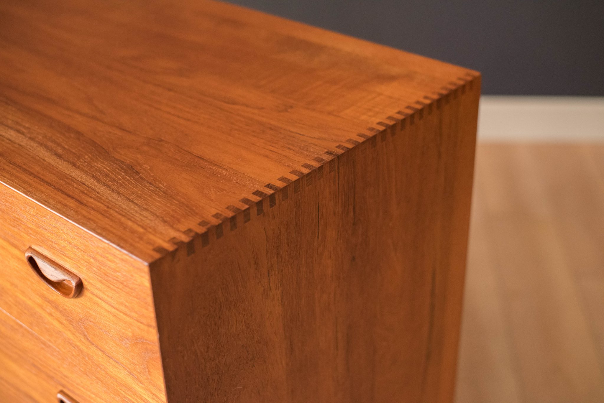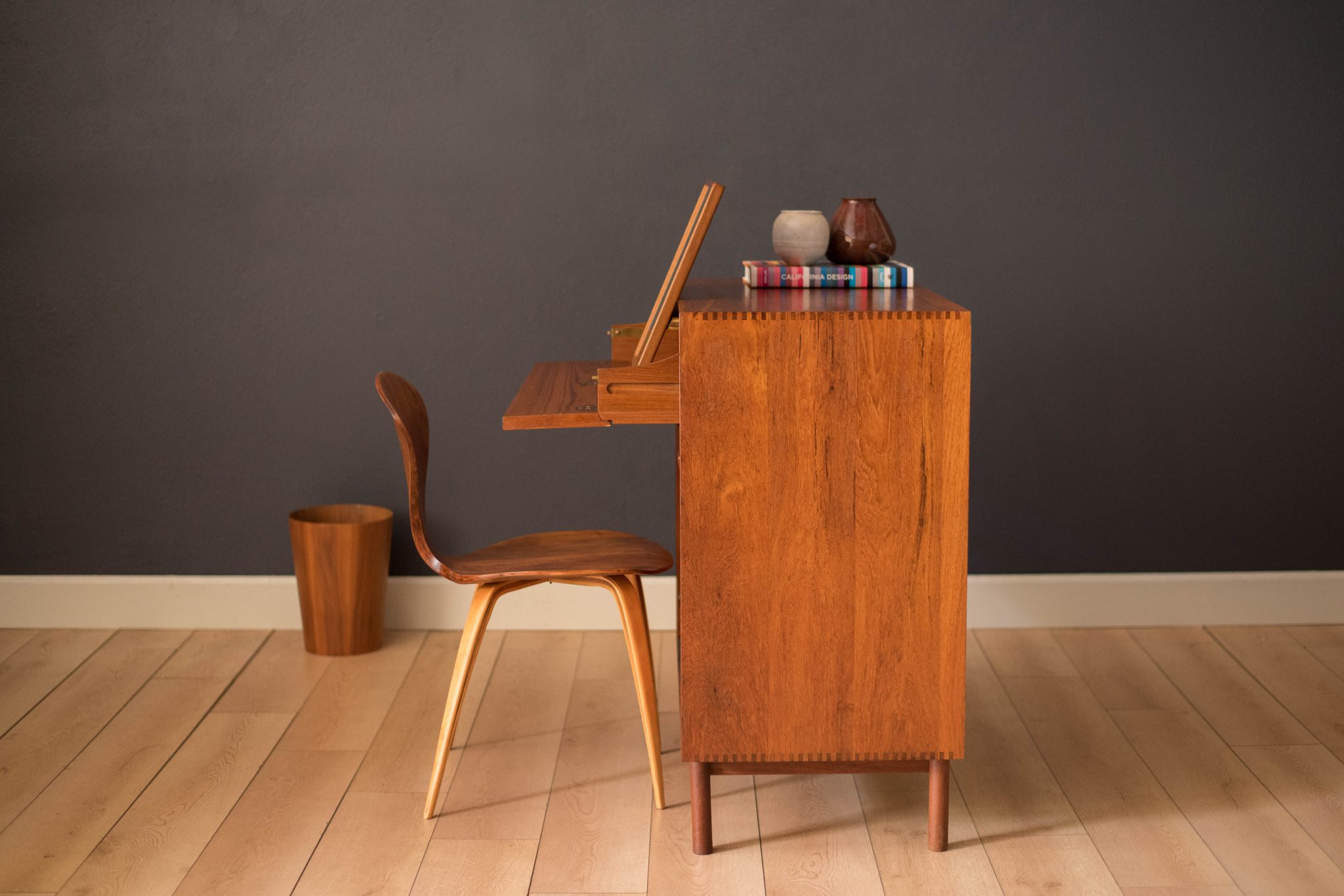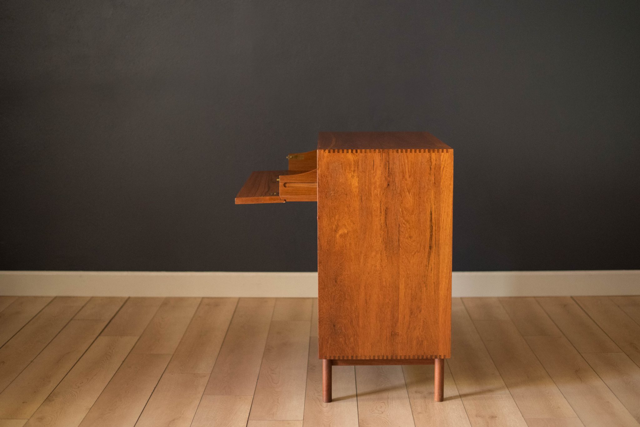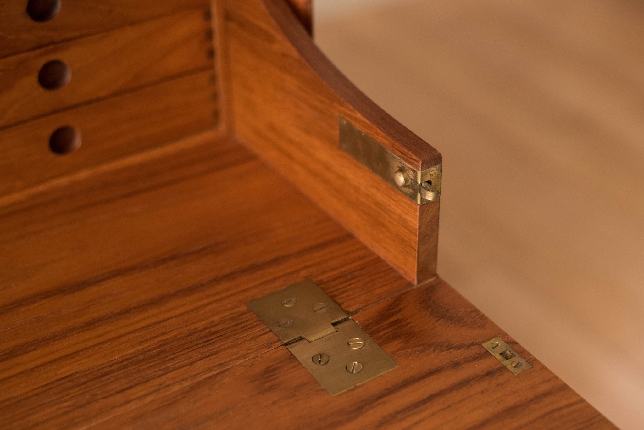Mid century modern teak dresser chest designed by Peter Hvidt and Orla Mølgaard-Nielsen for Søborg Møbler. This piece includes three storage drawers with signature sculpted handles. Features a hidden mirror vanity slide out desk that reveals six additional small drawers. Solid teak case is constructed with detailed finger joinery and brass hardware. Matching cabinets available in separate listing.