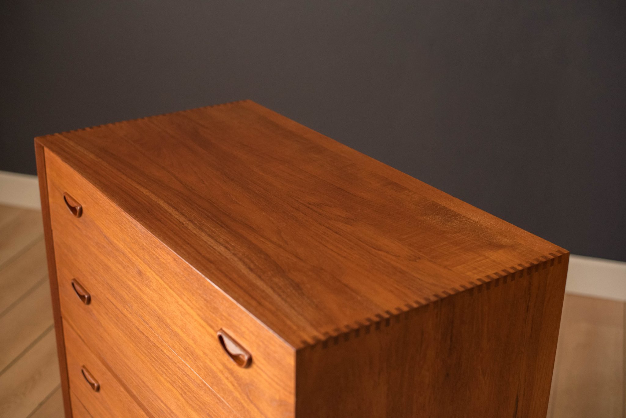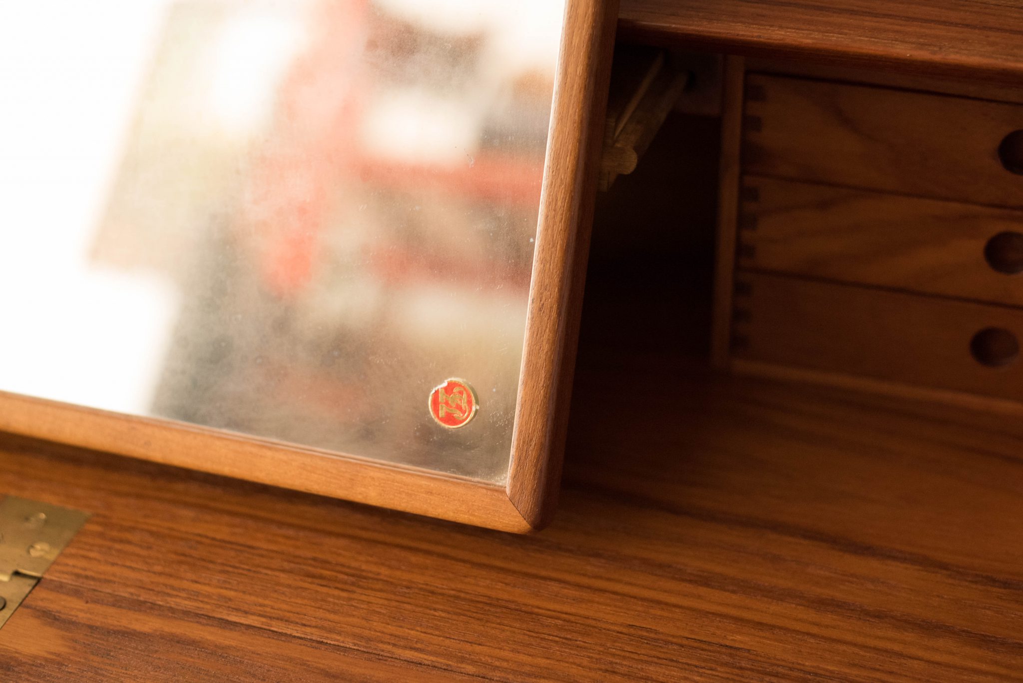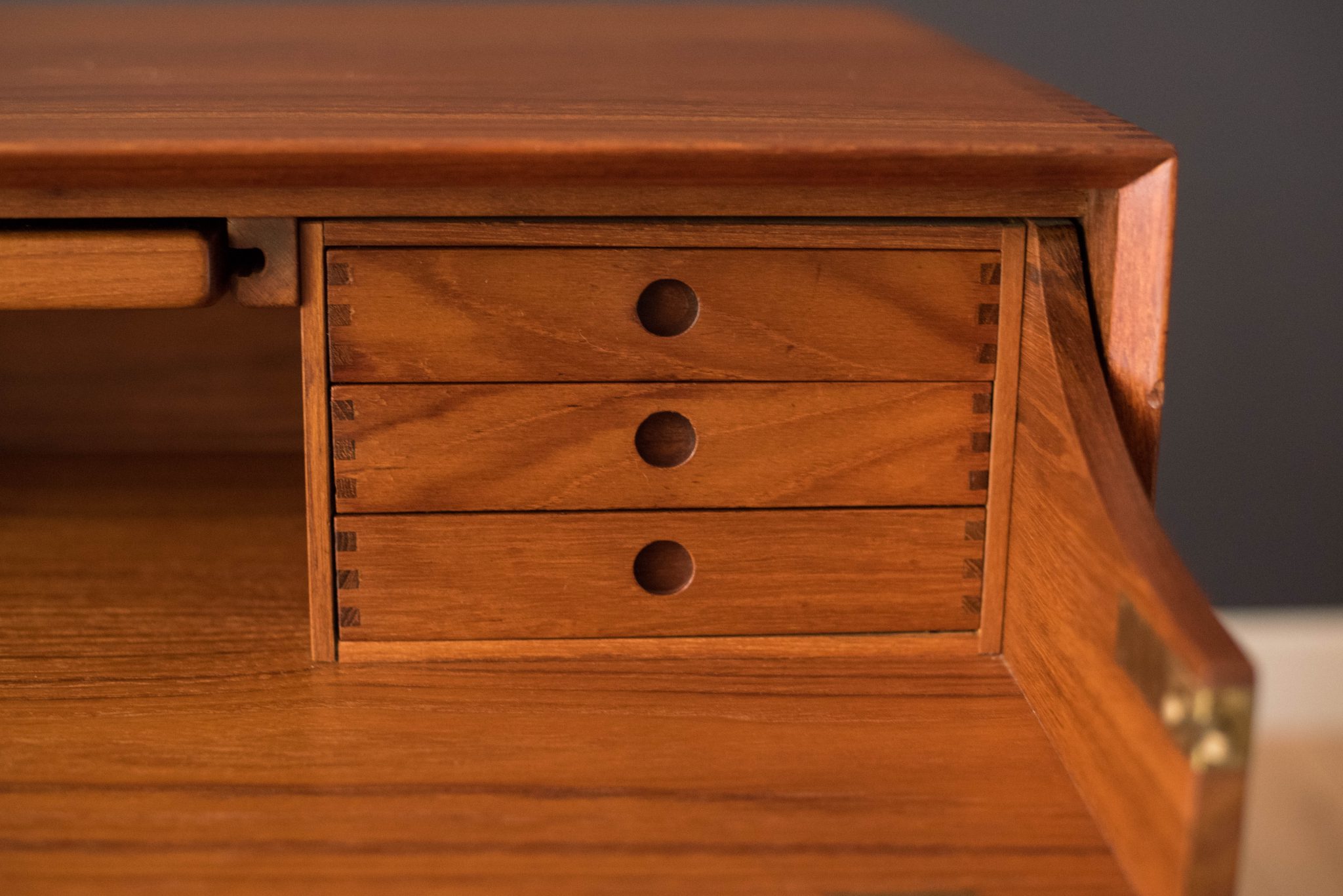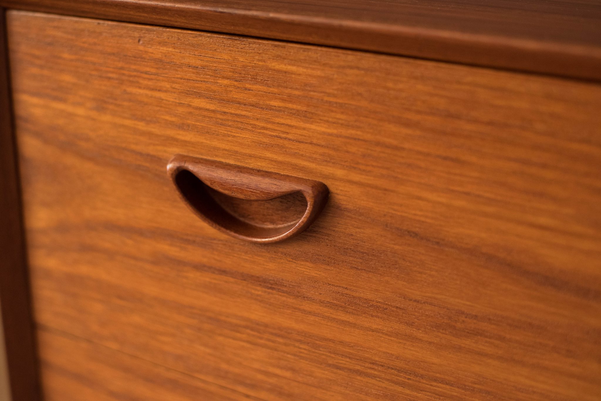 Mid century modern teak dresser chest designed by Peter Hvidt and Orla Mølgaard-Nielsen for Søborg Møbler. This piece includes three storage drawers with signature sculpted handles. Features a hidden mirror vanity slide out desk that reveals six additional small drawers. Solid teak case is constructed with detailed finger joinery and brass hardware. Matching cabinets available in separate listing.
