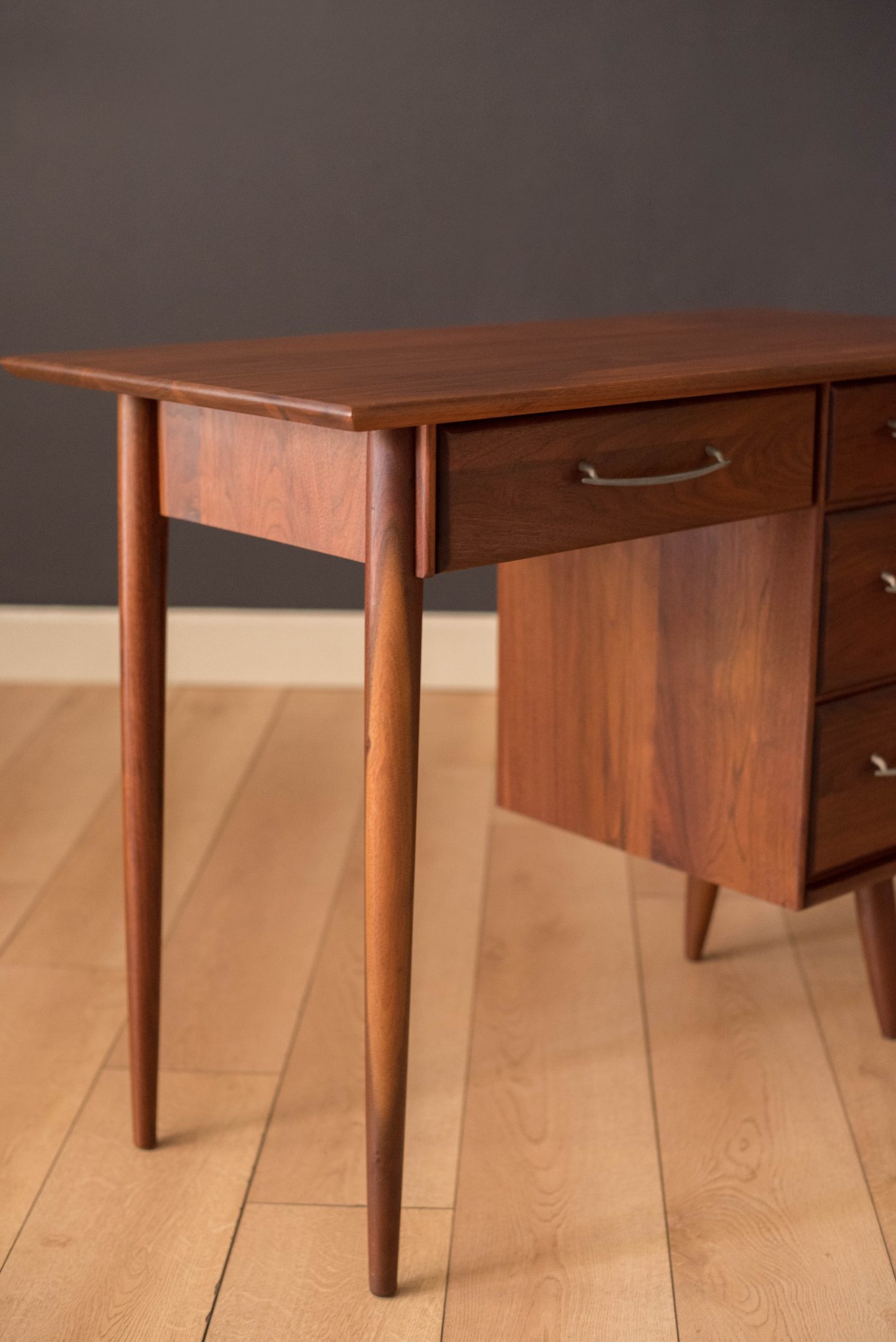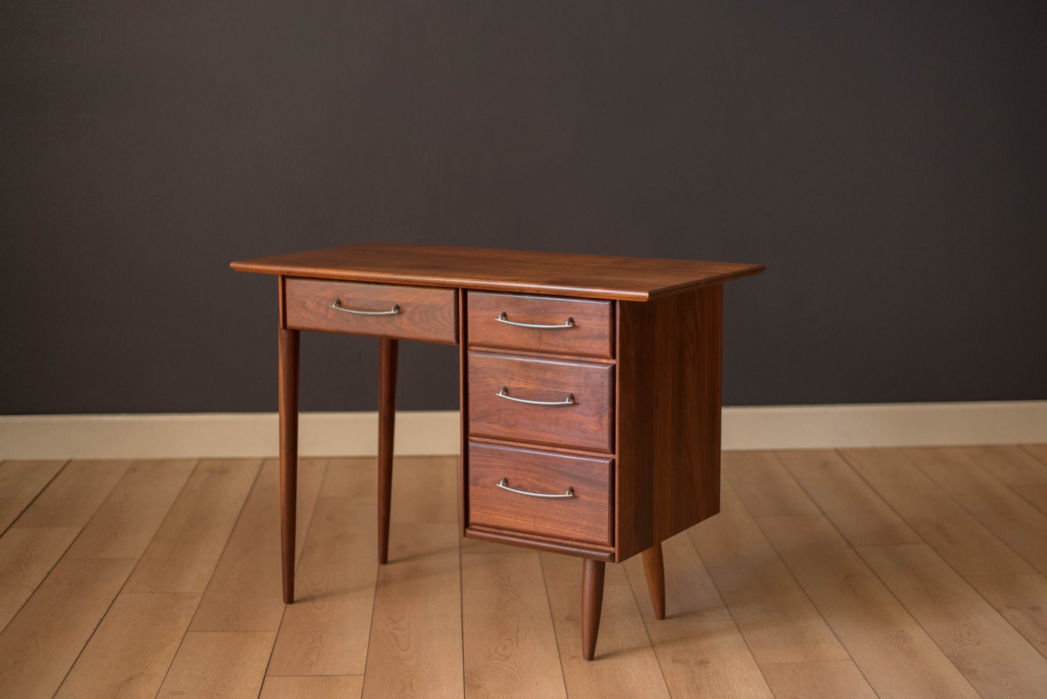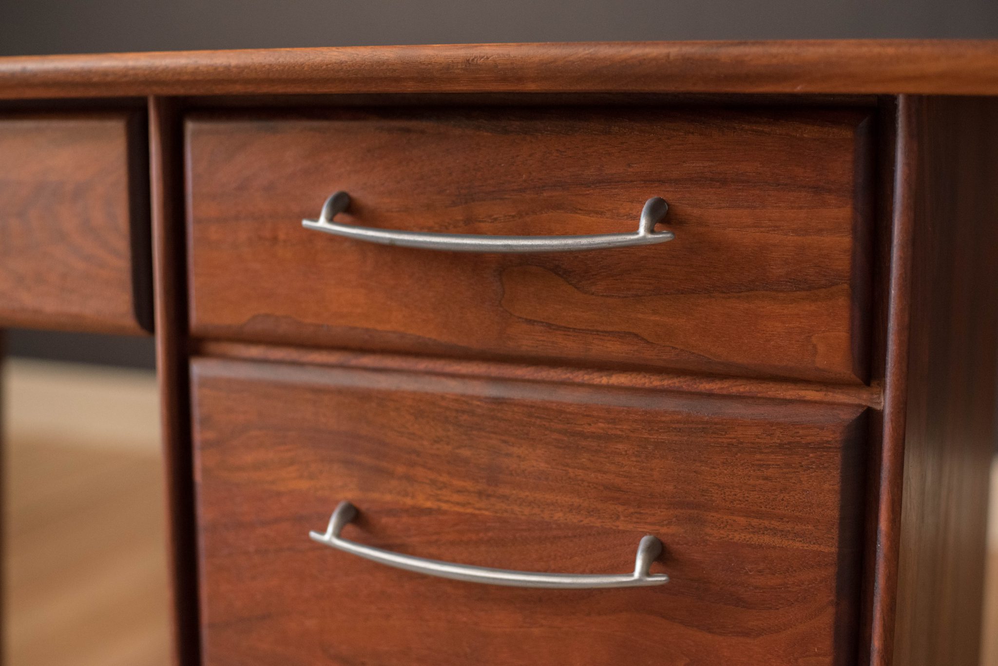 Mid century ACE-HI compact writing desk in solid planked walnut. This piece offers plenty of storage space complete with four drawers accessorized with pewter handles.