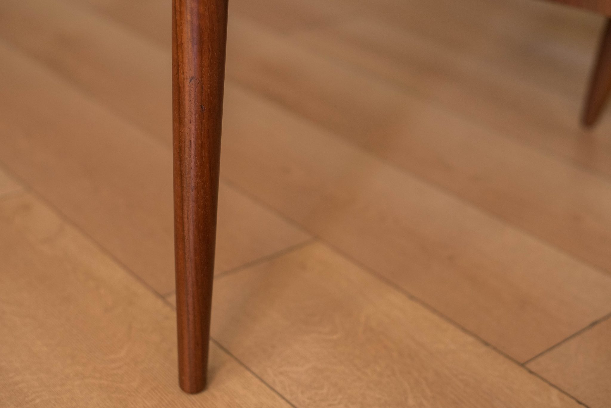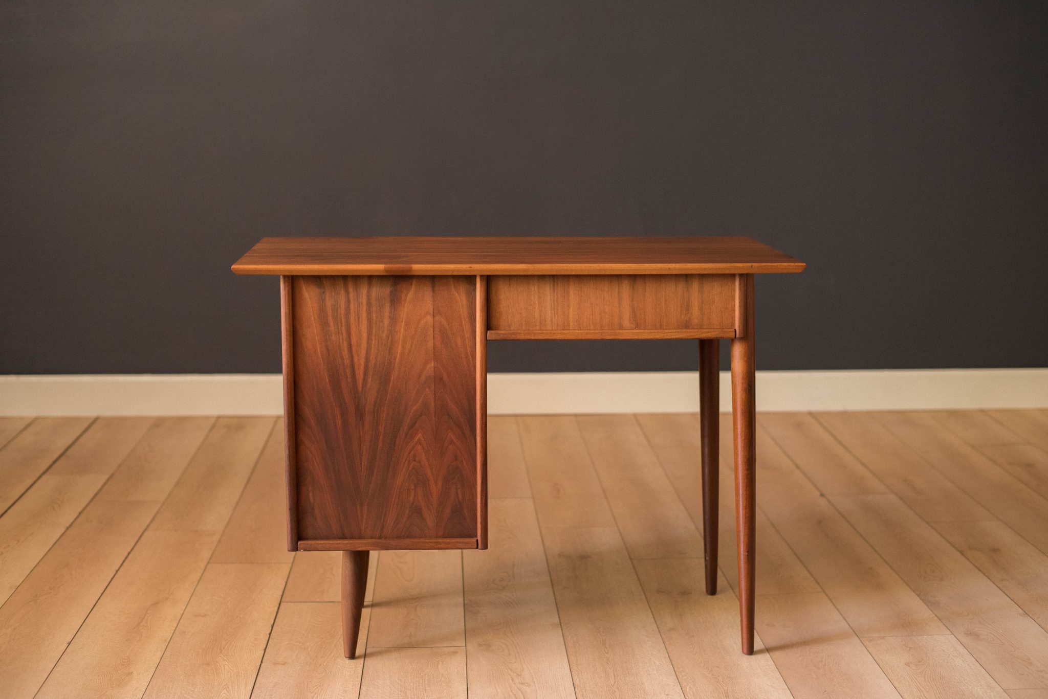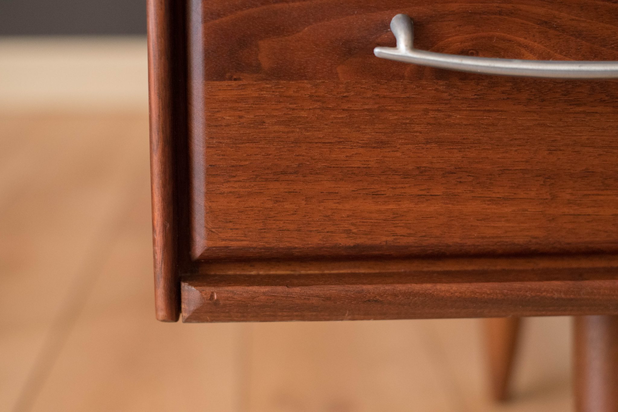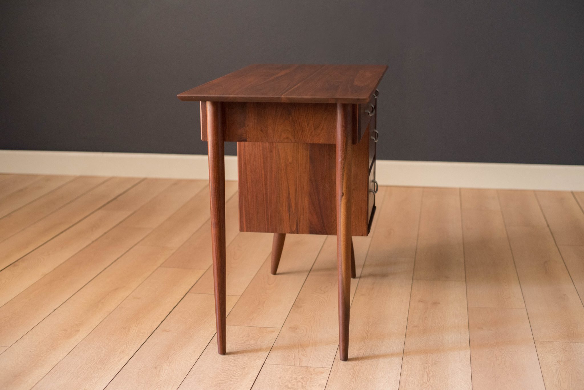 Mid century ACE-HI compact writing desk in solid planked walnut. This piece offers plenty of storage space complete with four drawers accessorized with pewter handles.