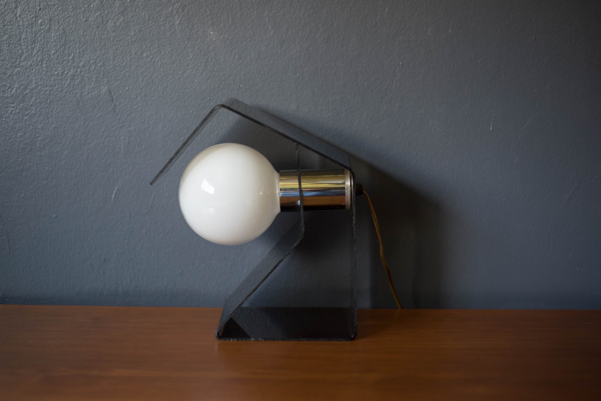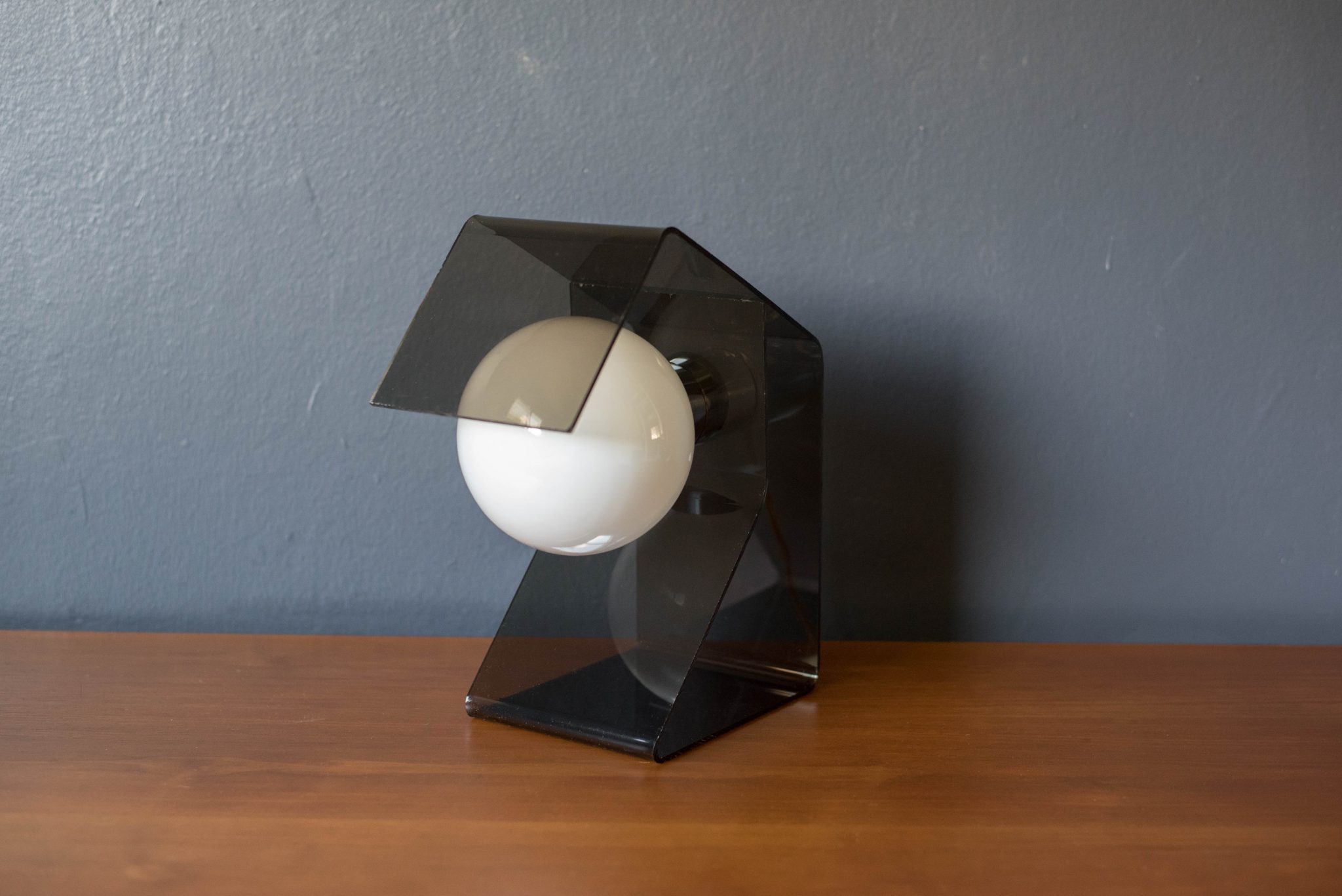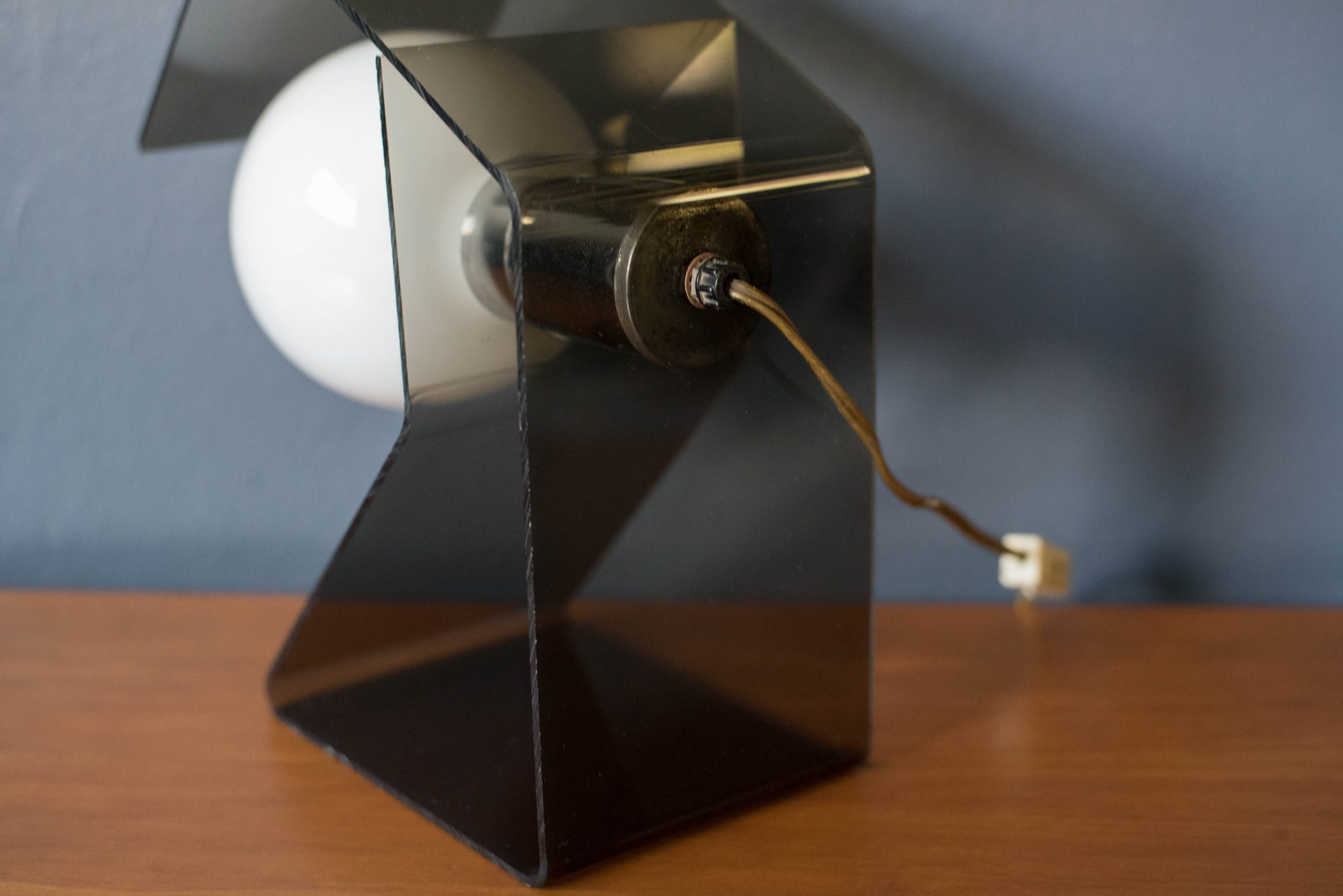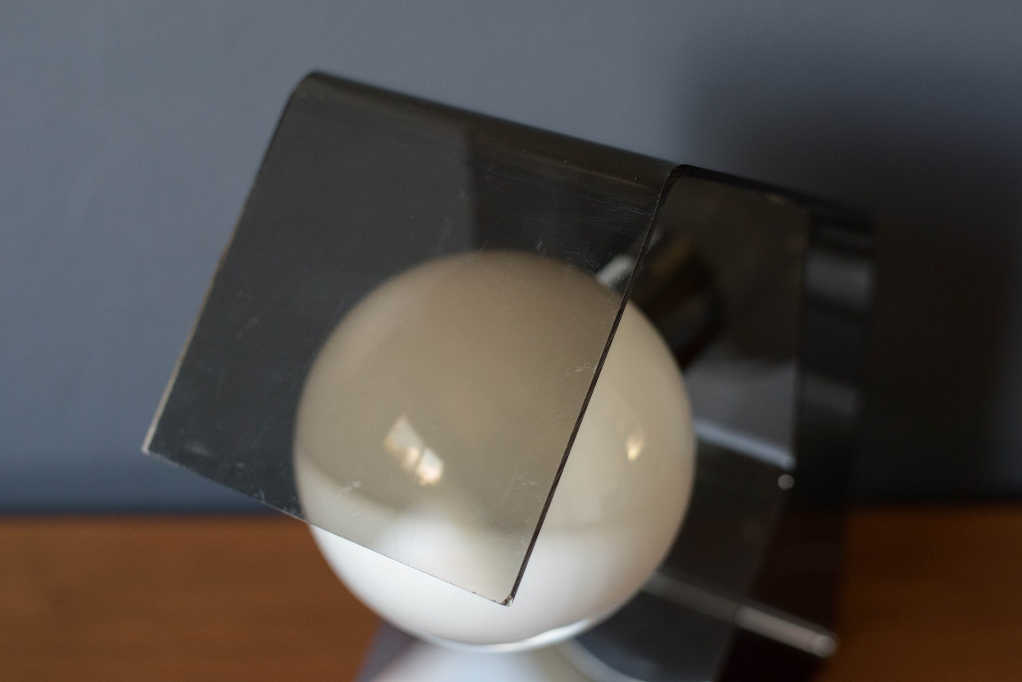 Mid-Century Modern accent globe table lamp, circa 1970s. This piece displays an angular smoked acrylic frame and chrome accents. Globe light bulb not included.