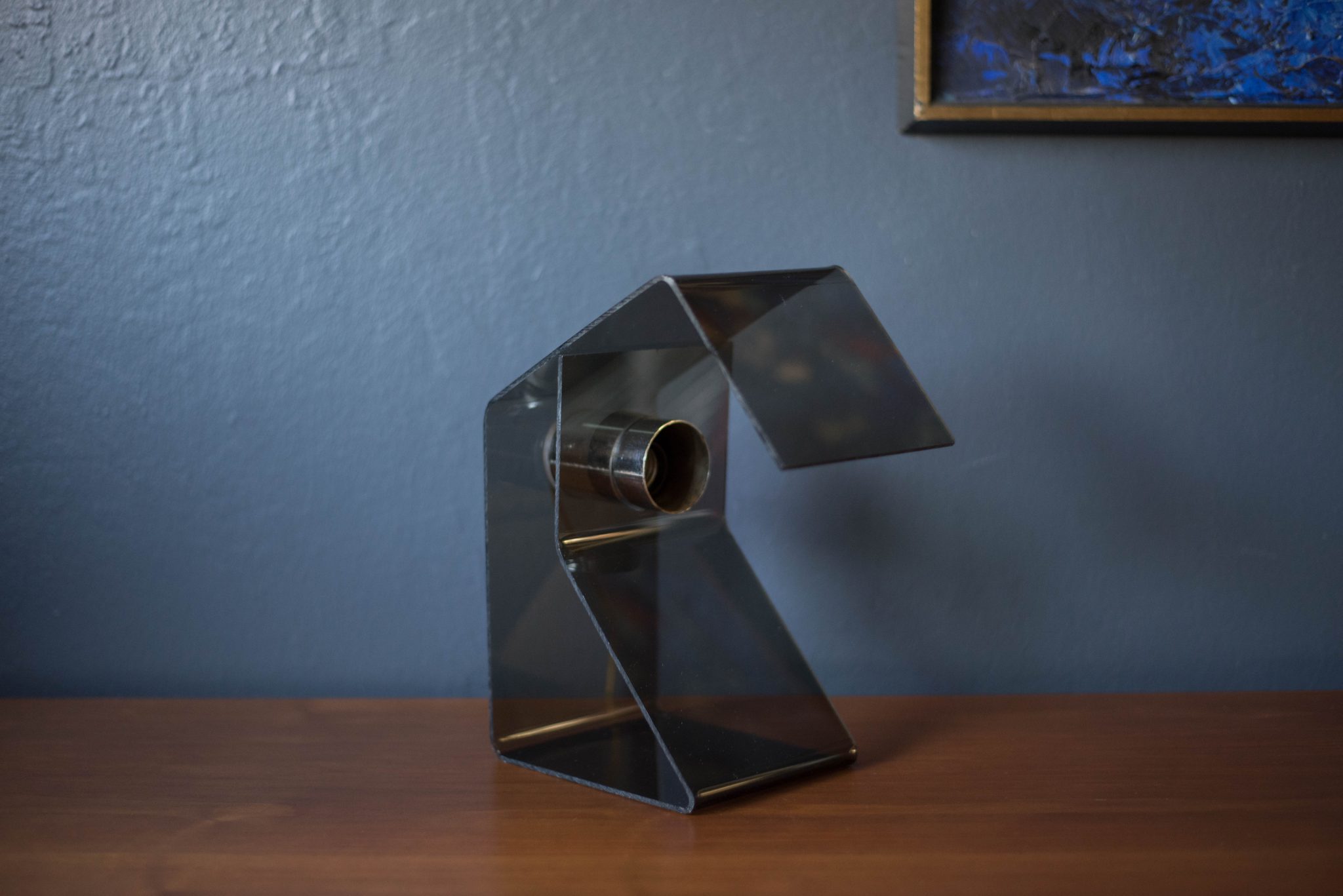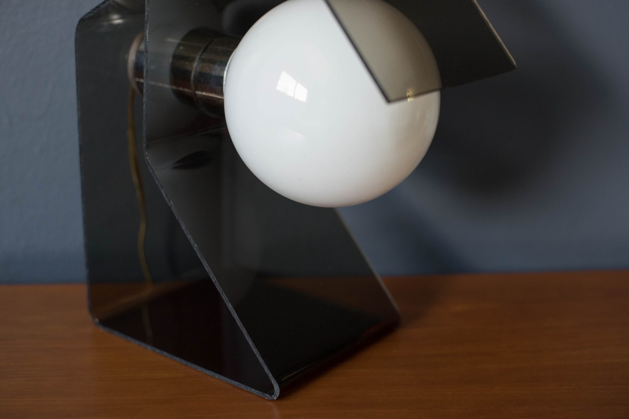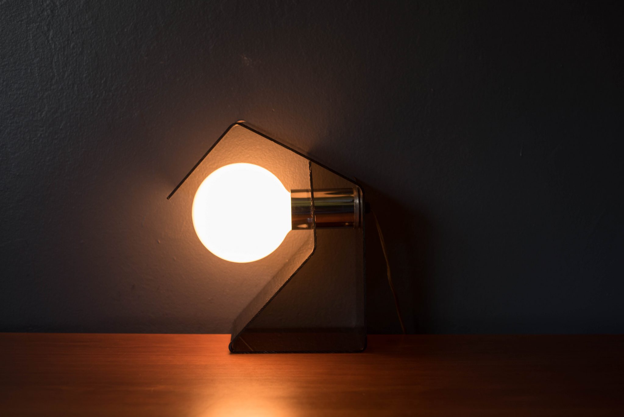 Mid-Century Modern accent globe table lamp, circa 1970s. This piece displays an angular smoked acrylic frame and chrome accents. Globe light bulb not included.