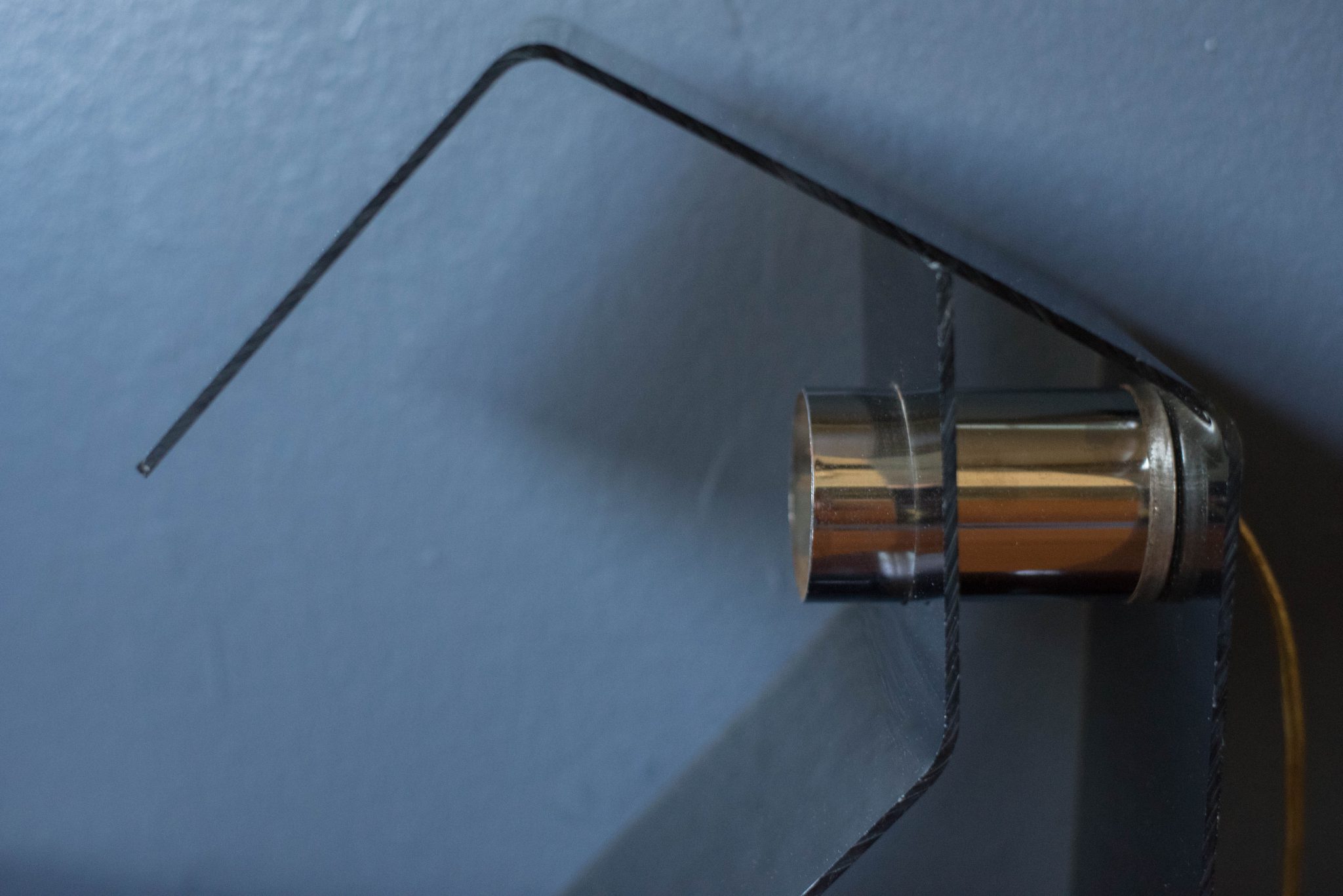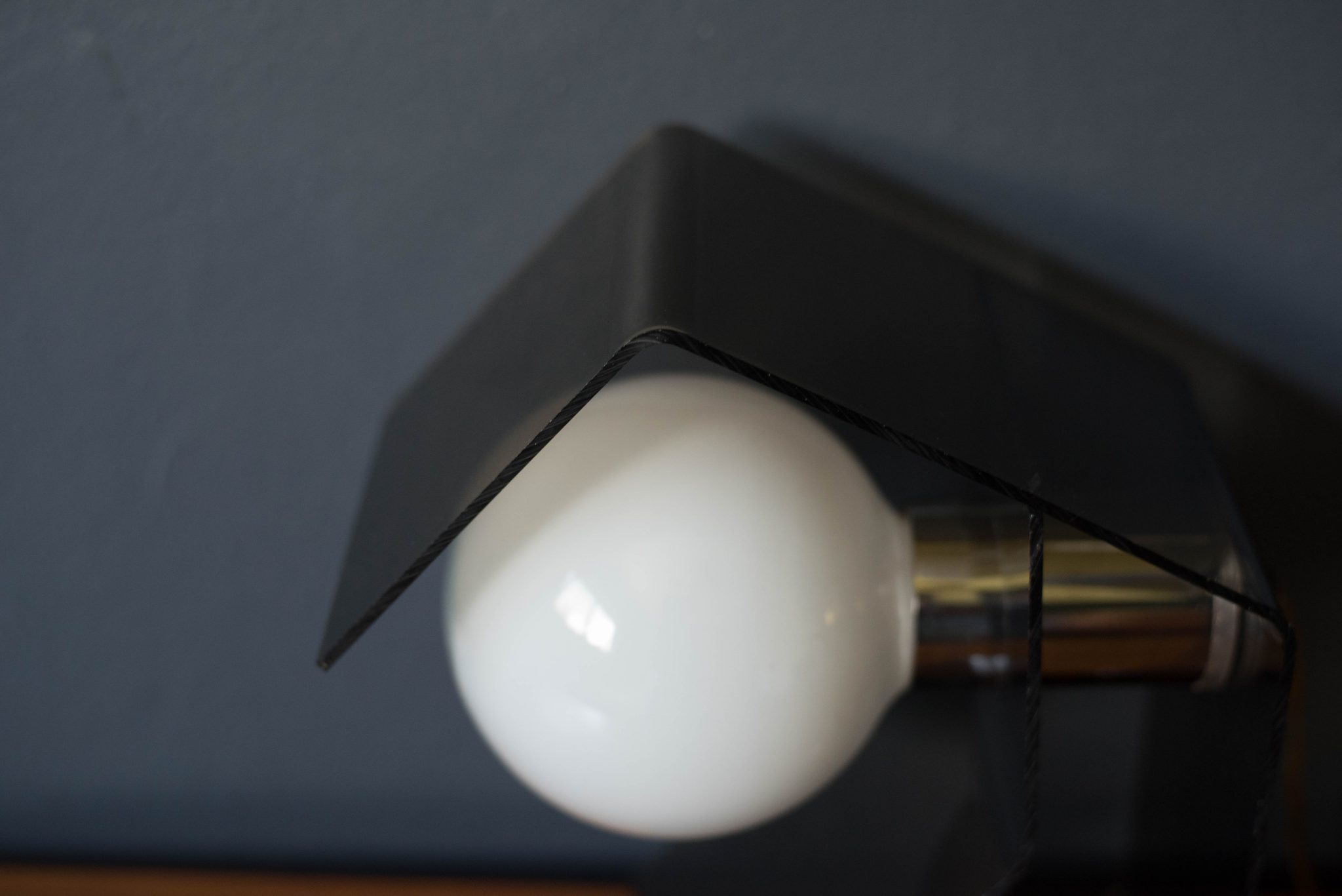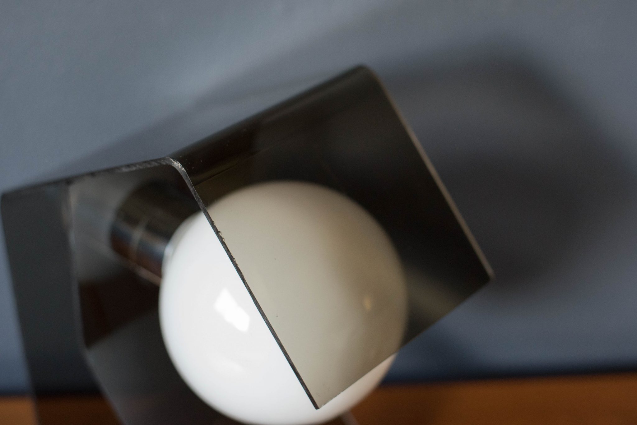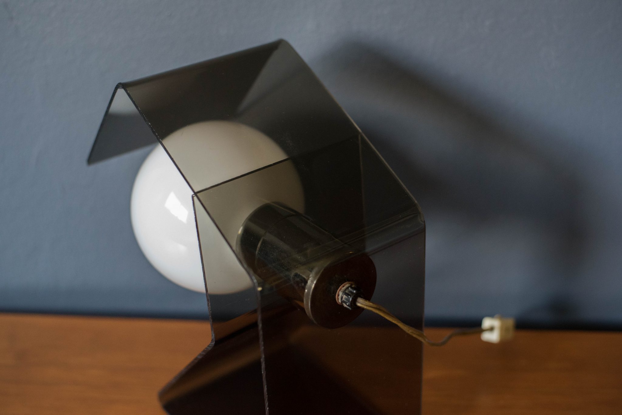 Mid-Century Modern accent globe table lamp, circa 1970s. This piece displays an angular smoked acrylic frame and chrome accents. Globe light bulb not included.