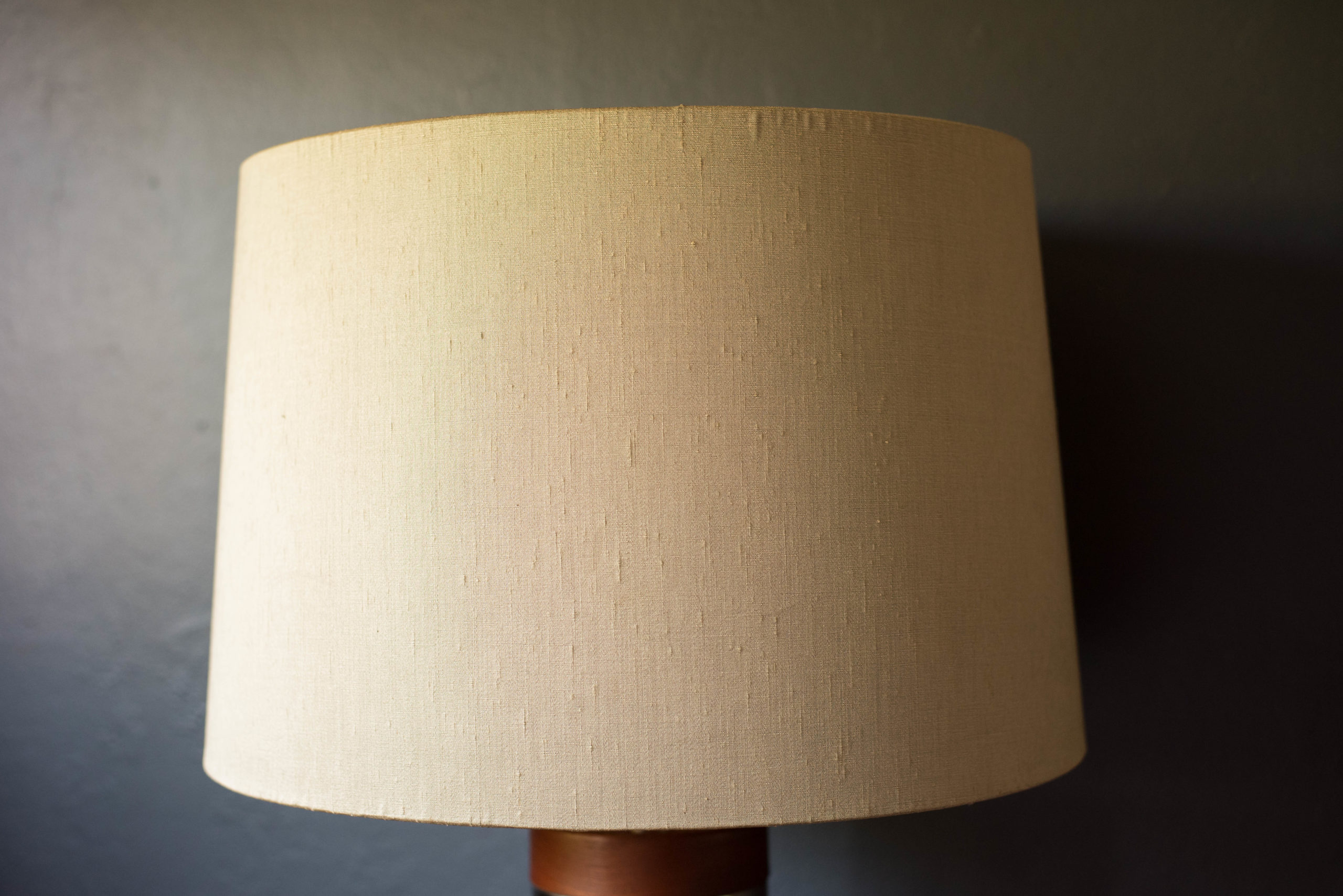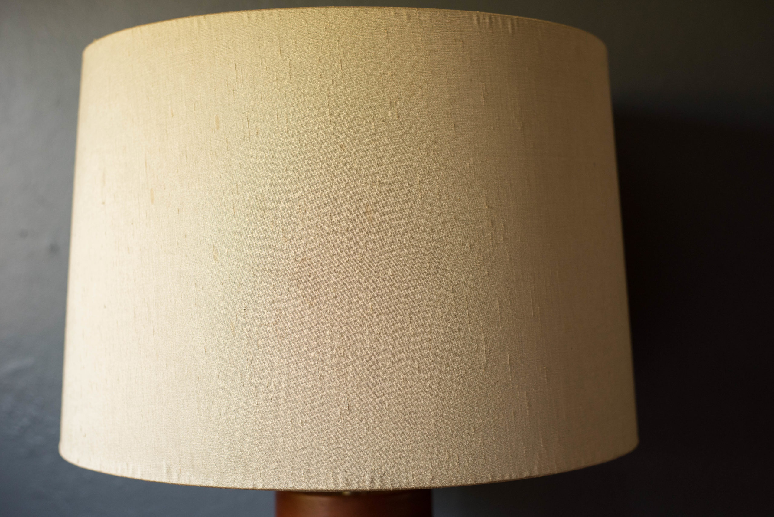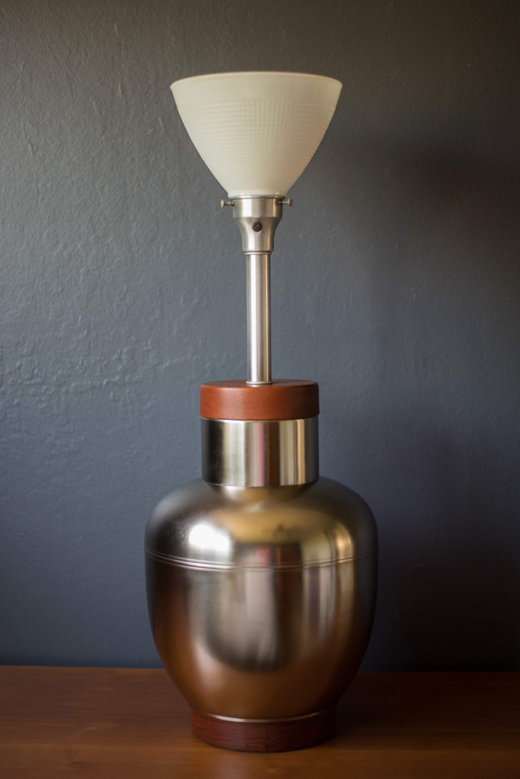 Mid-Century Modern table lamp in stainless steel circa 1960’s. This Classic decorative piece features teak accents and includes a milk glass diffuser. The original linen shade is included.