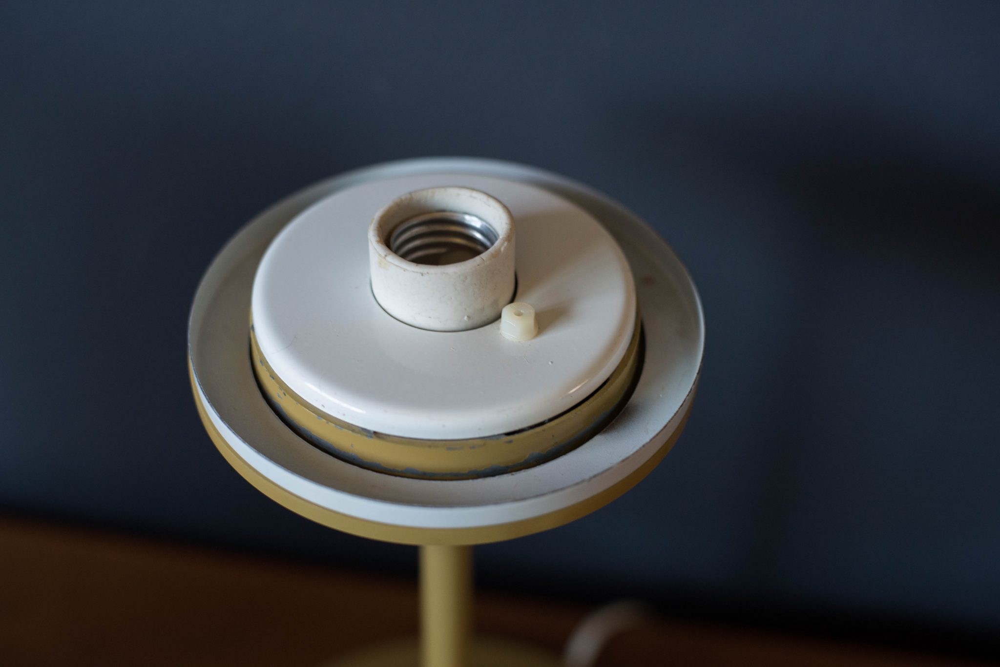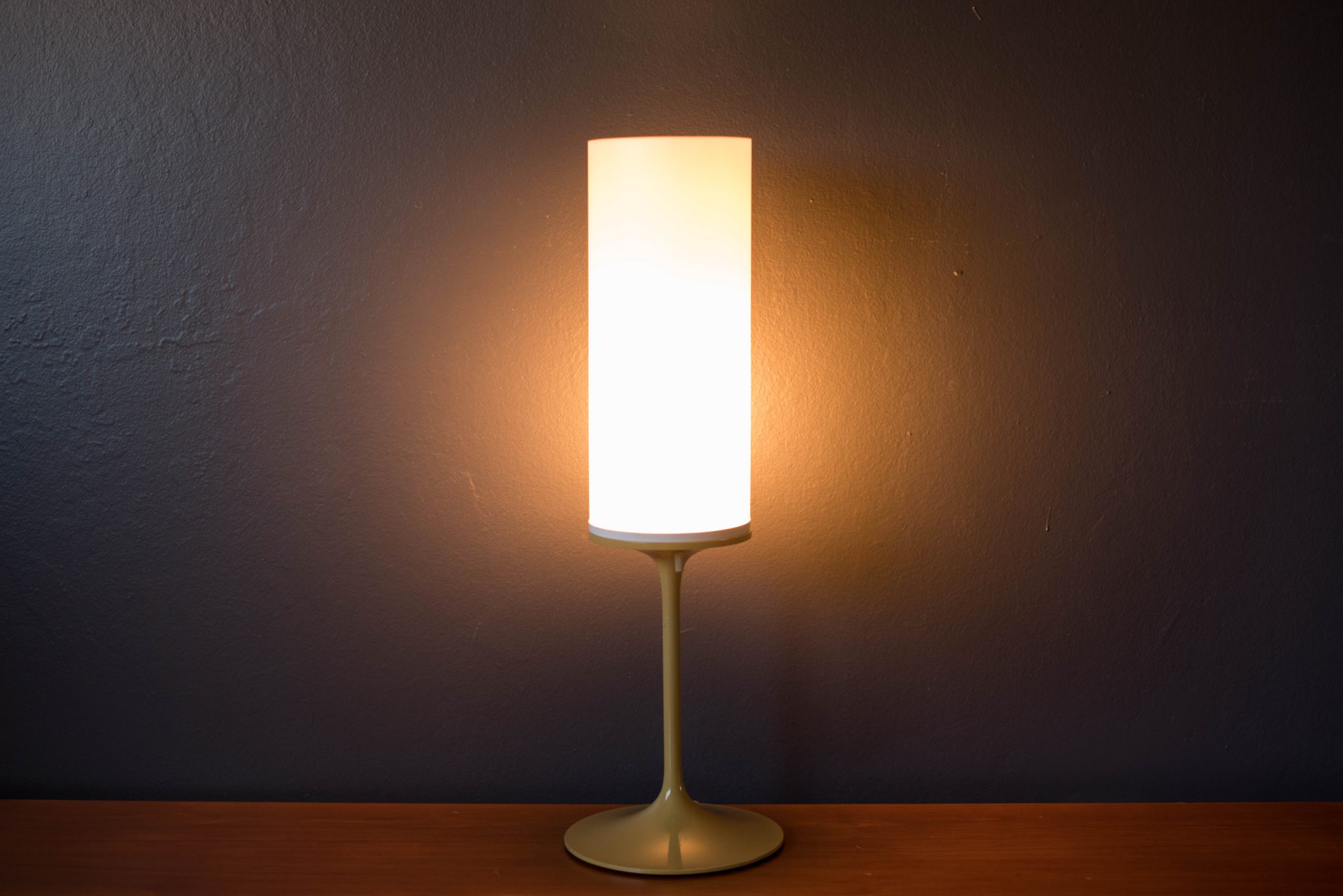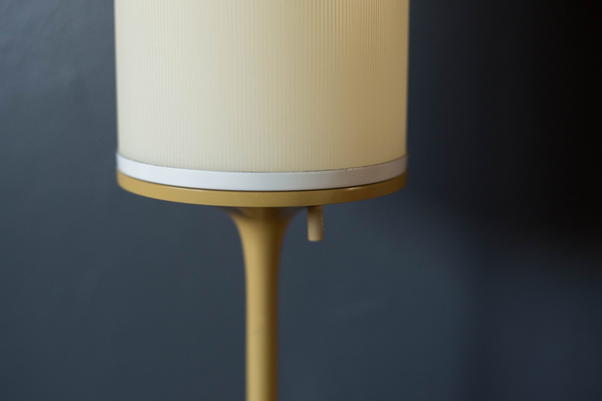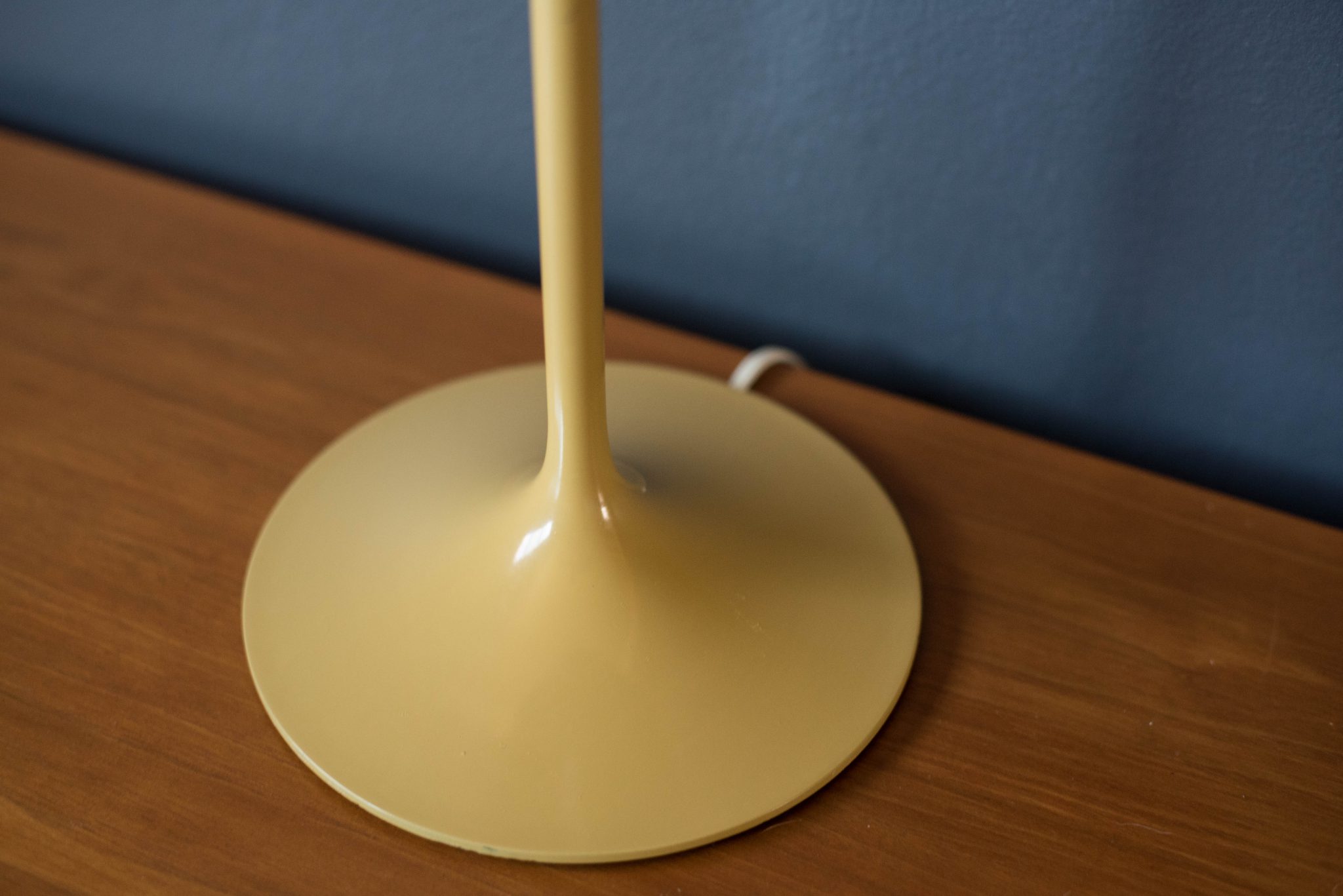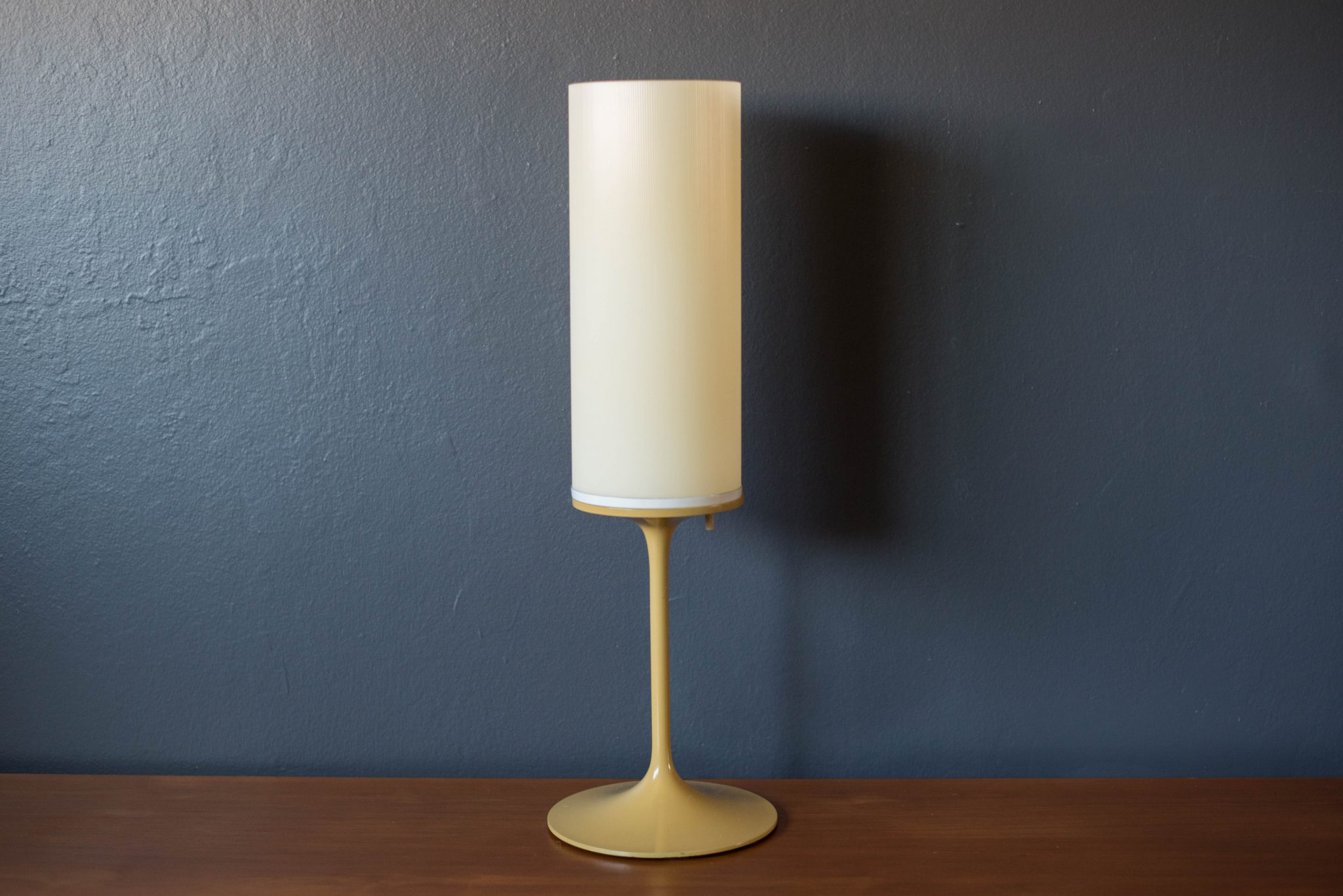 Mid century Bill Curry stemlite lamp for Design Line. This piece features the line’s signature tulip base with a mustard enamel finish and column shade.