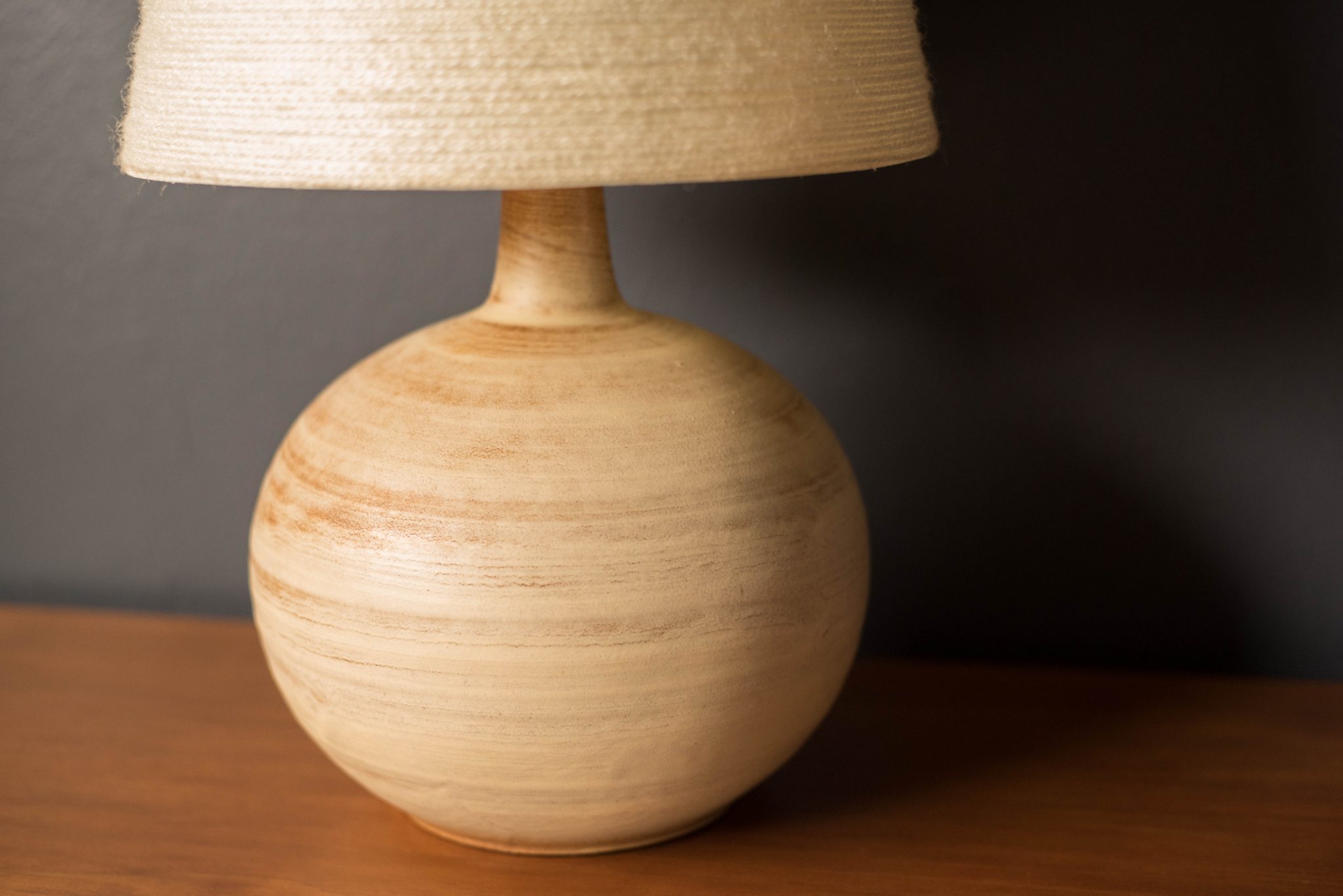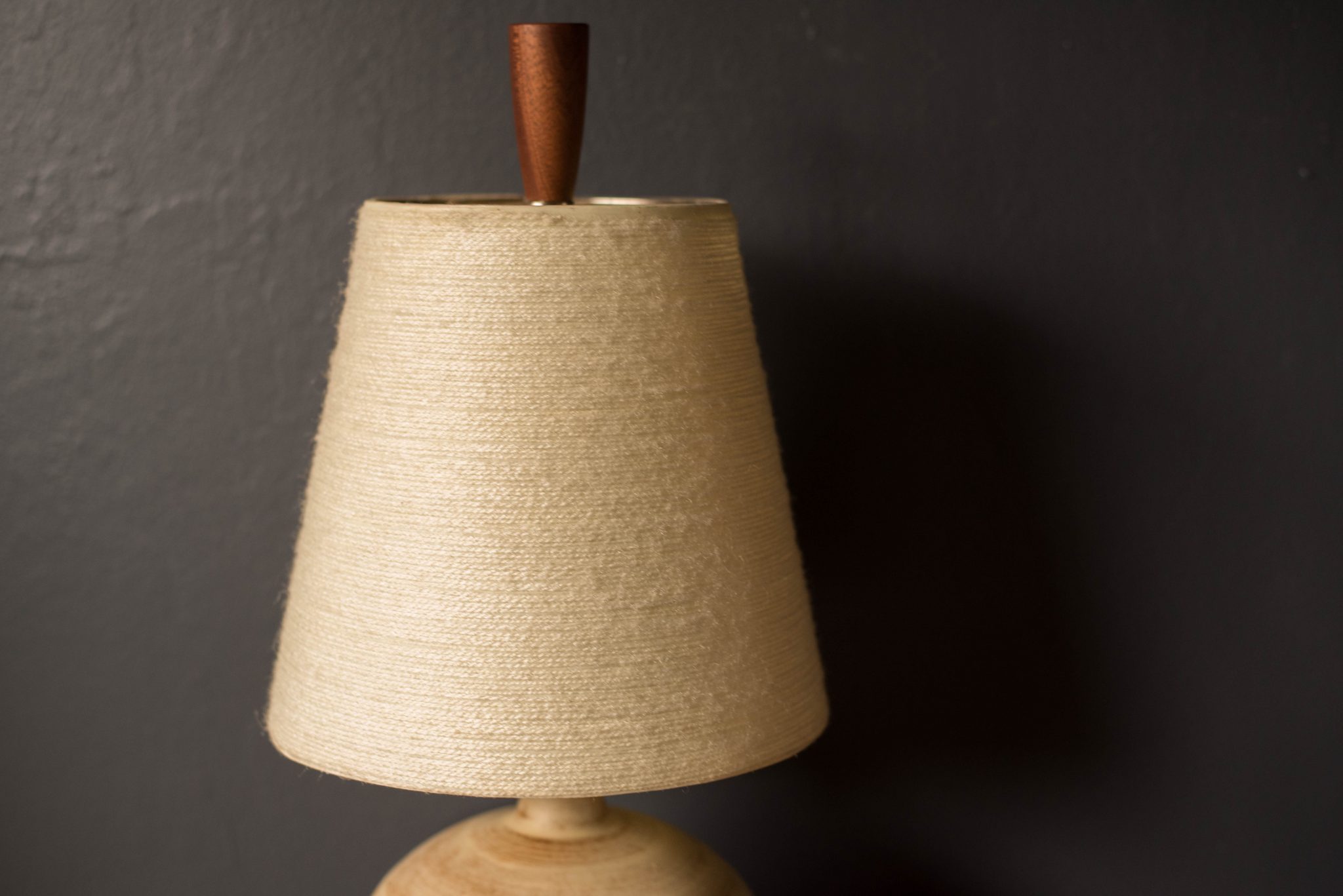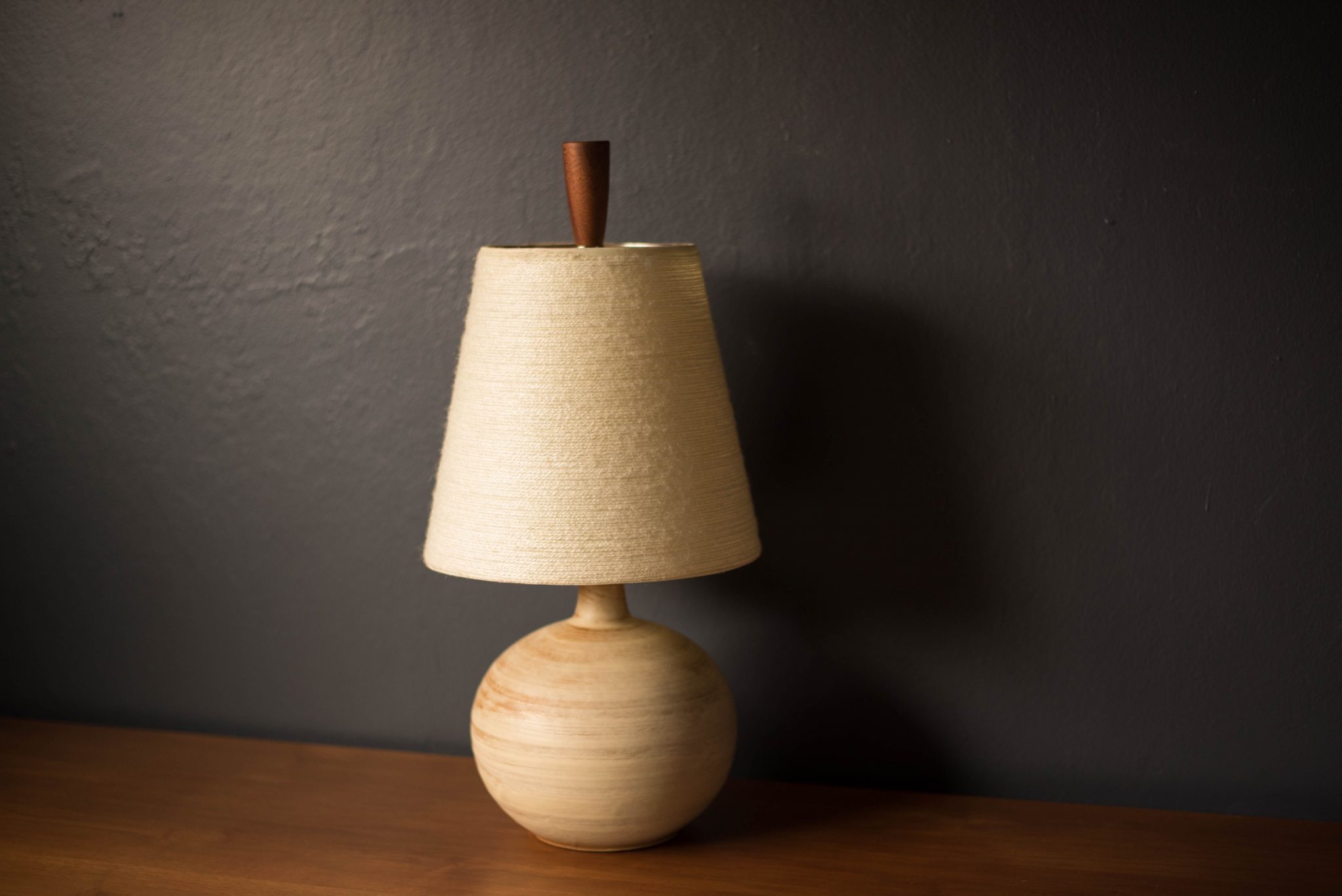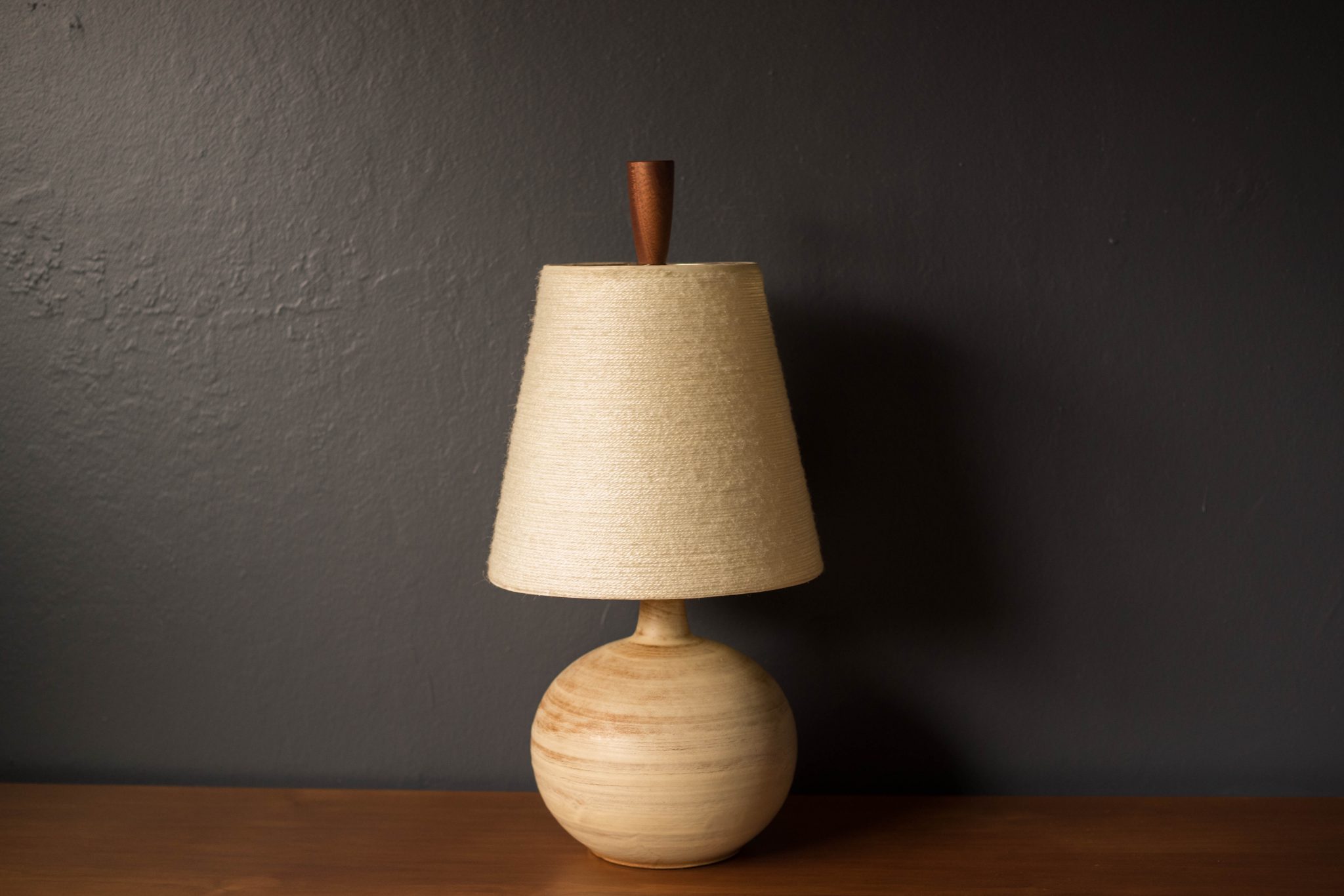Mid-Century Modern ceramic table lamp, circa 1960s. This piece displays a neutral tone matte finish and is accessorized with a walnut finial. Includes a fiberglass tapered shade and functions with a three-way switch.