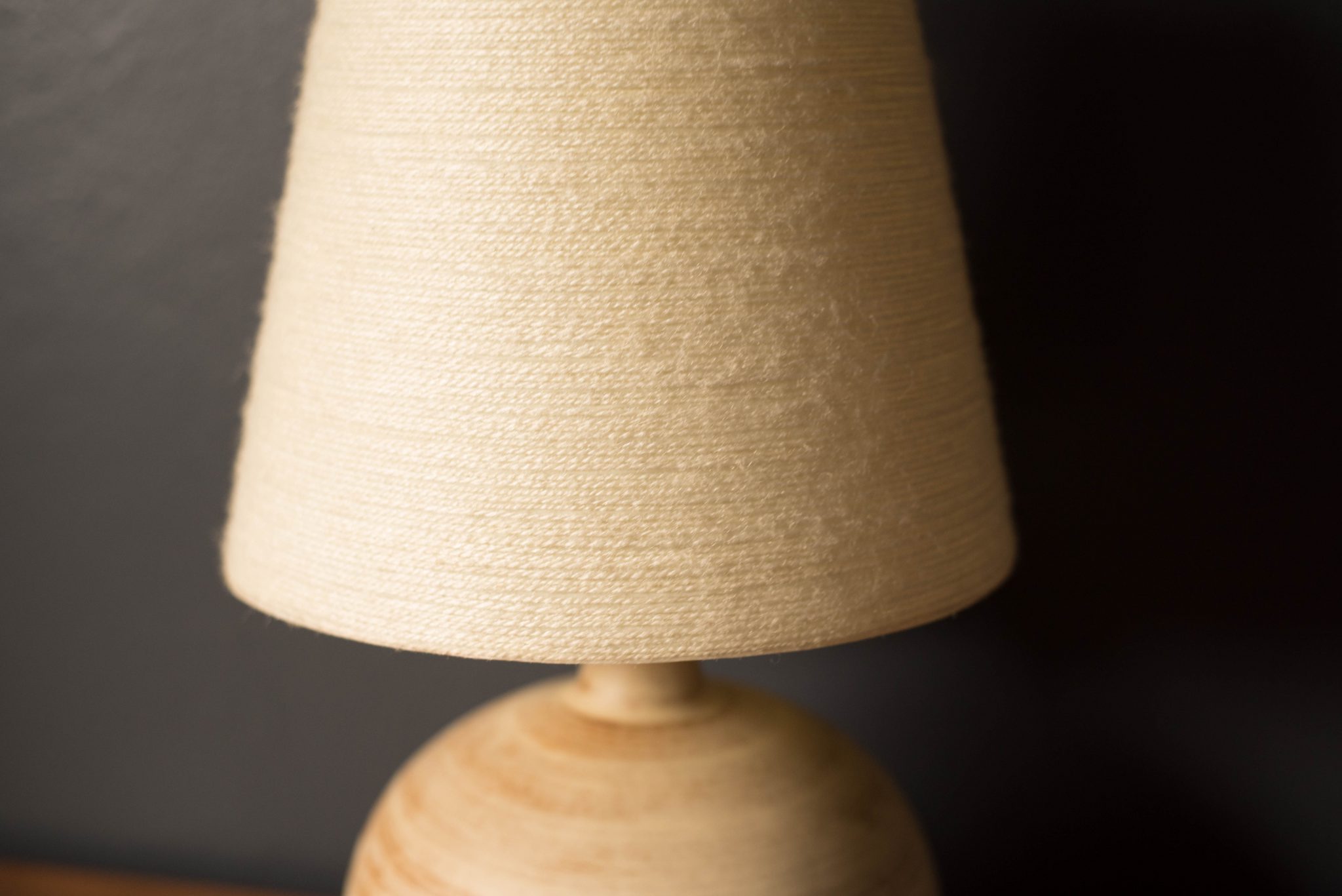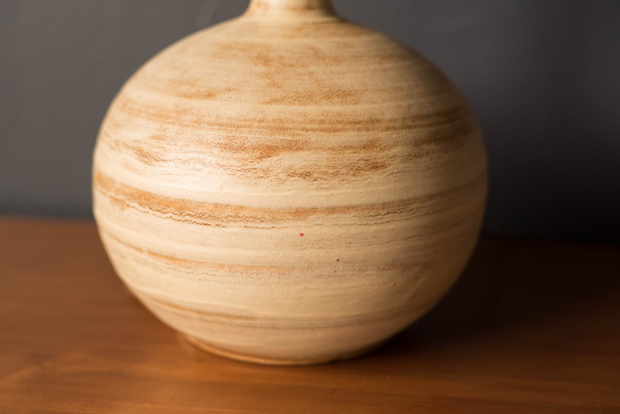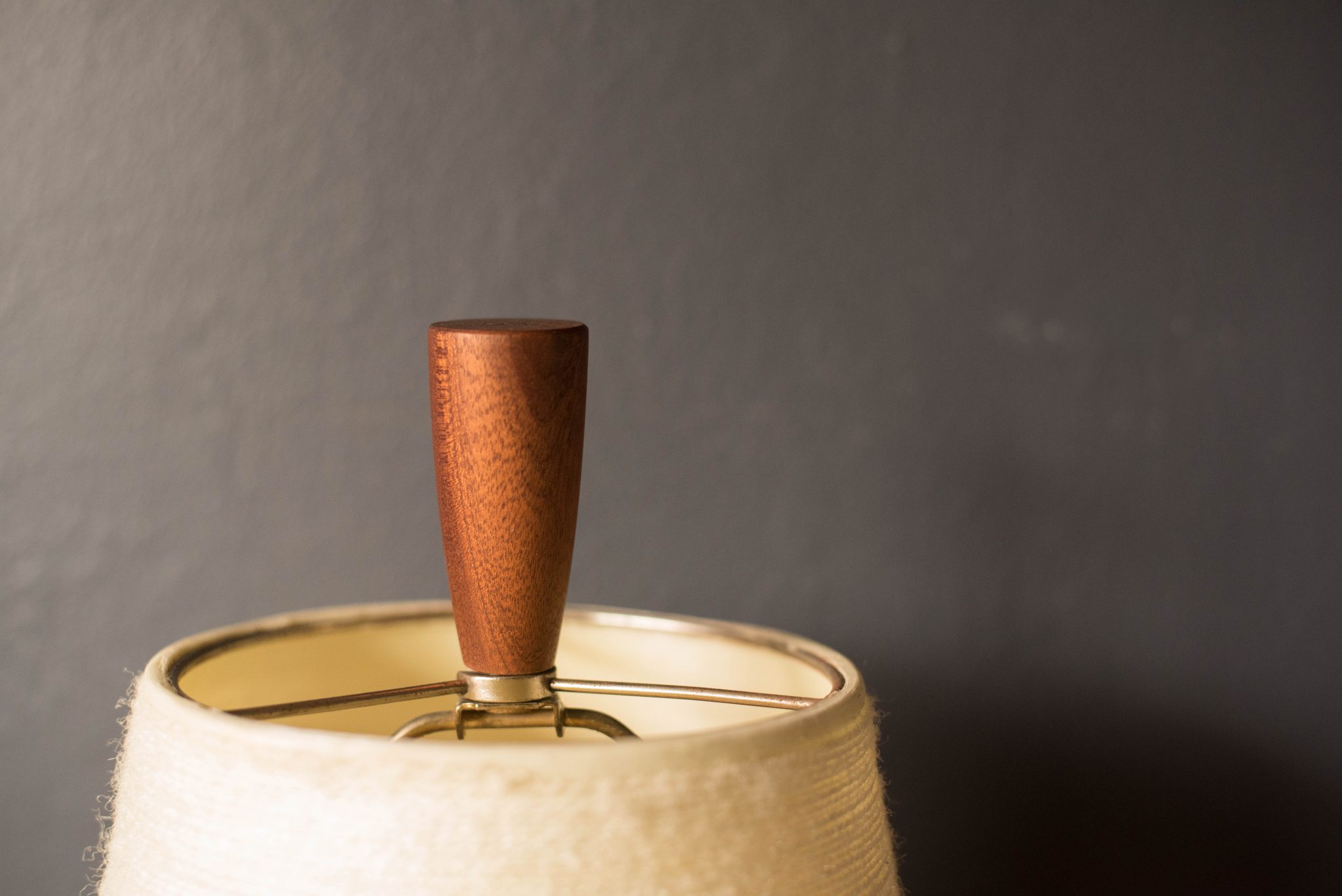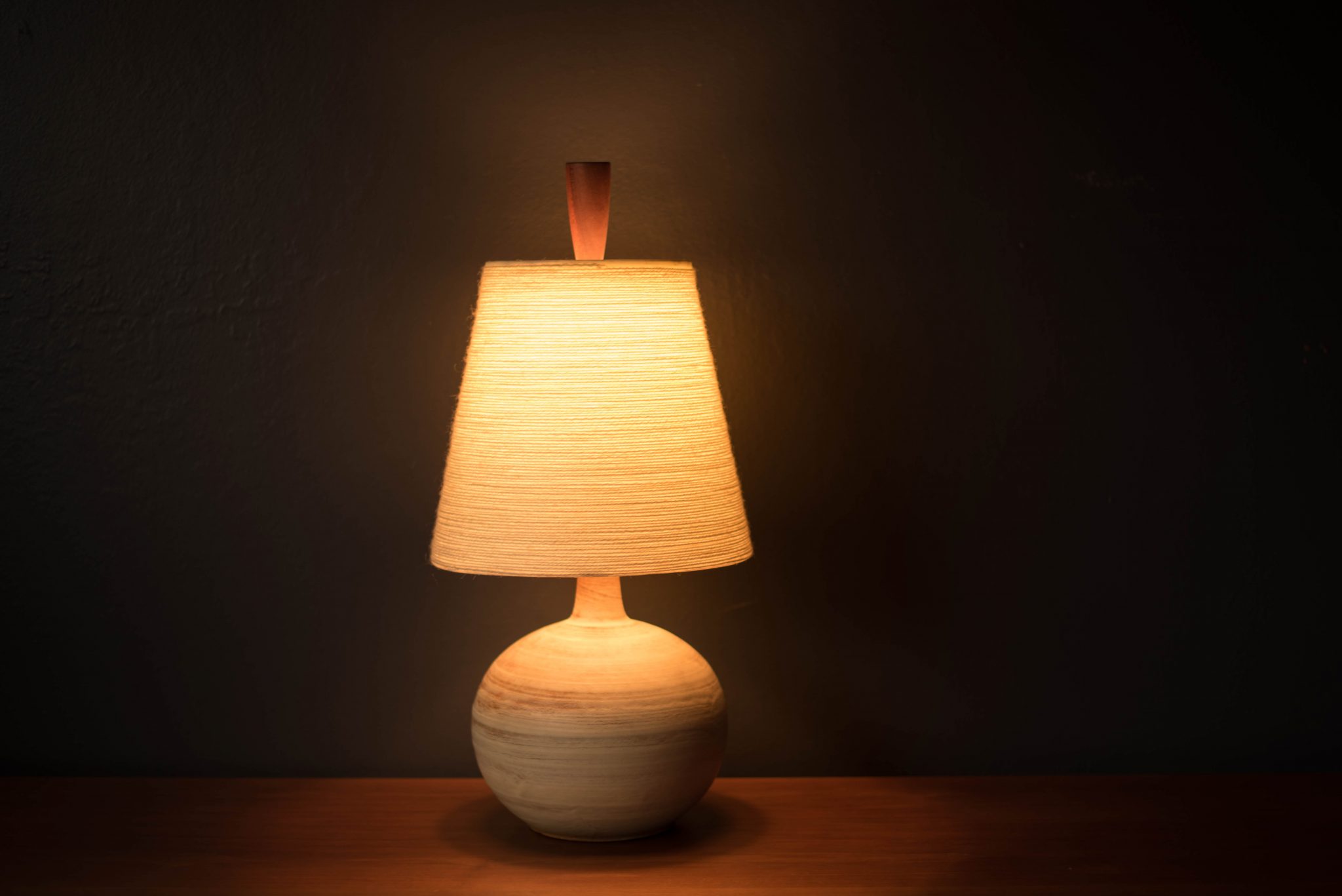 Mid-Century Modern ceramic table lamp, circa 1960s. This piece displays a neutral tone matte finish and is accessorized with a walnut finial. Includes a fiberglass tapered shade and functions with a three-way switch.