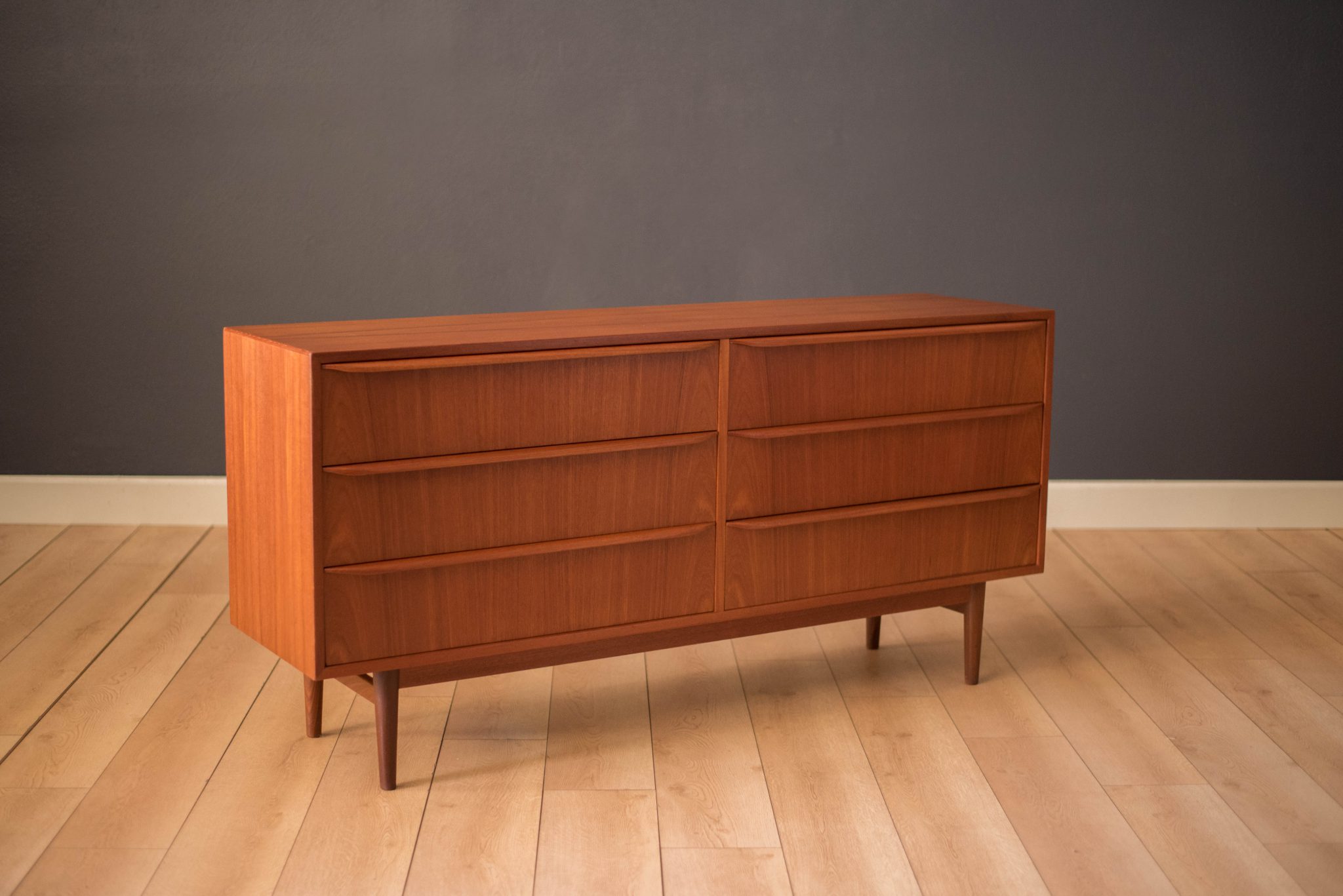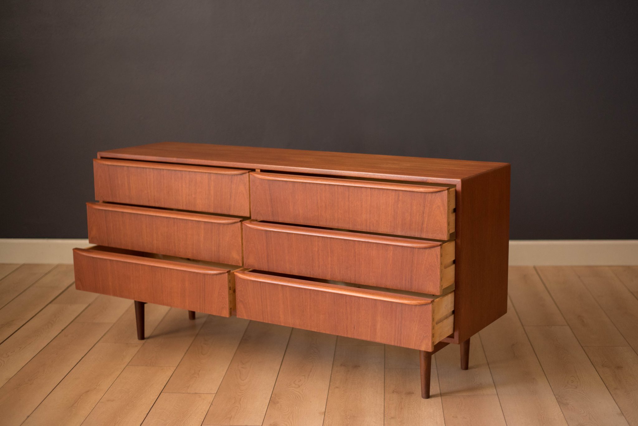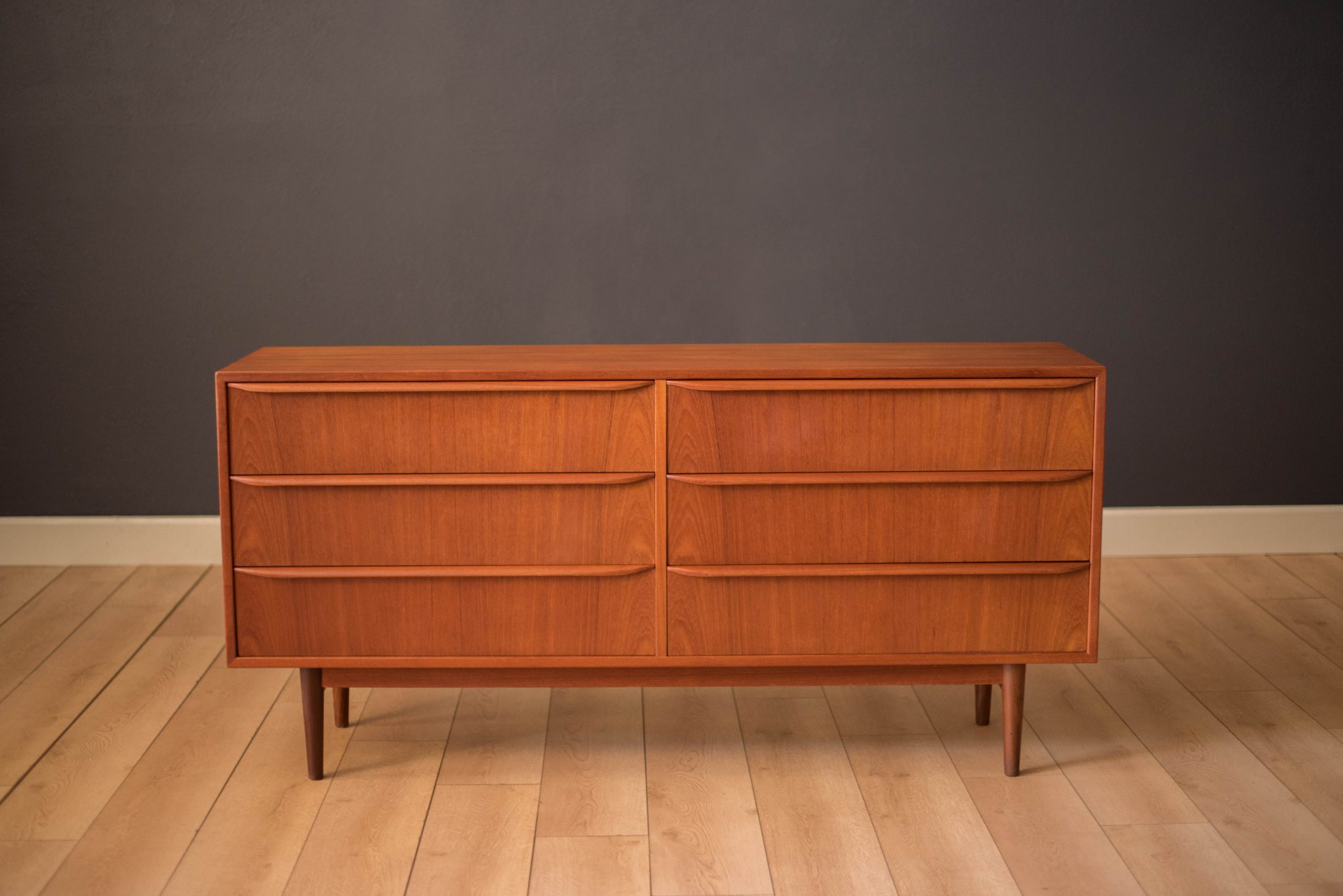 Mid-Century Modern dresser in teak circa 1960s, Denmark. This piece features six dovetailed drawers with sculpted wood handles. Matching highboy dresser available in separate listing.