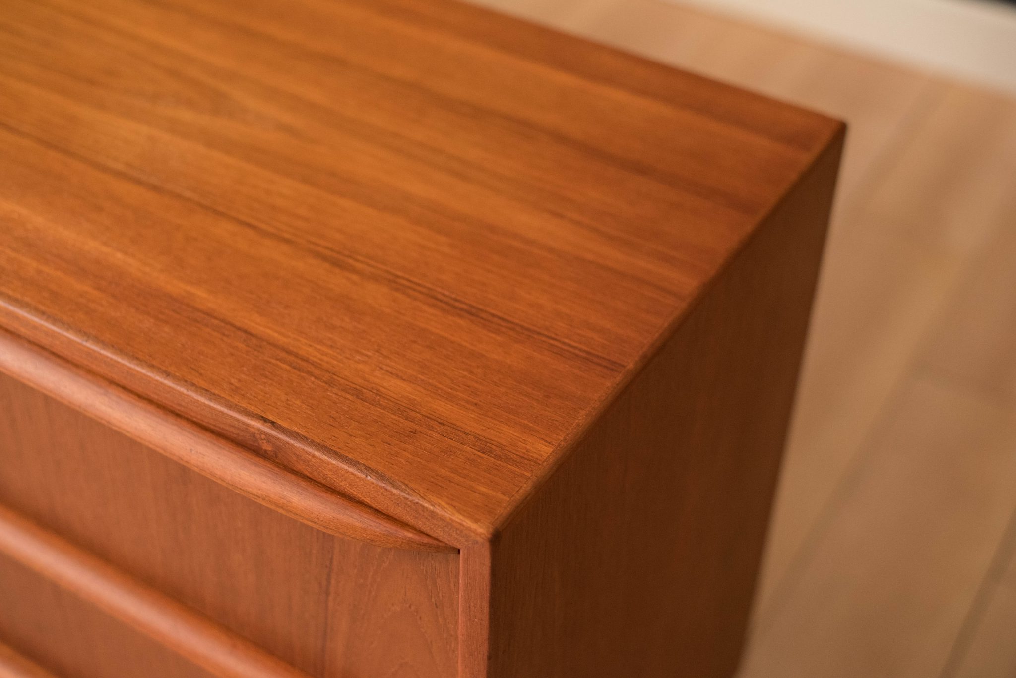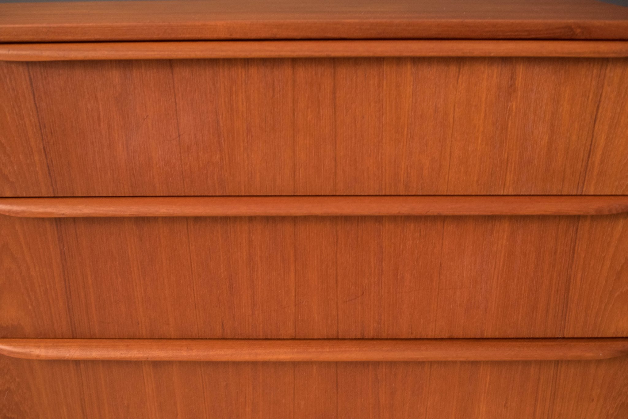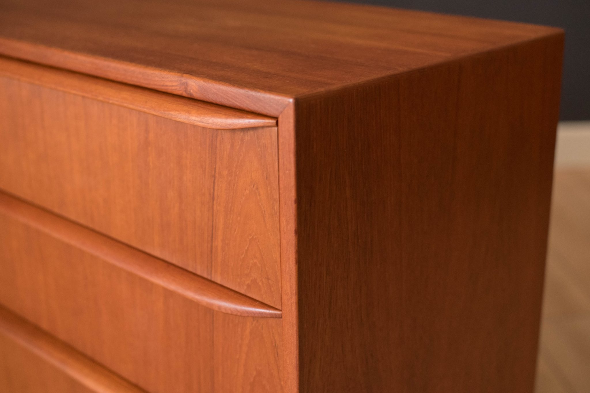 Mid-Century Modern dresser in teak circa 1960s, Denmark. This piece features six dovetailed drawers with sculpted wood handles. Matching highboy dresser available in separate listing.