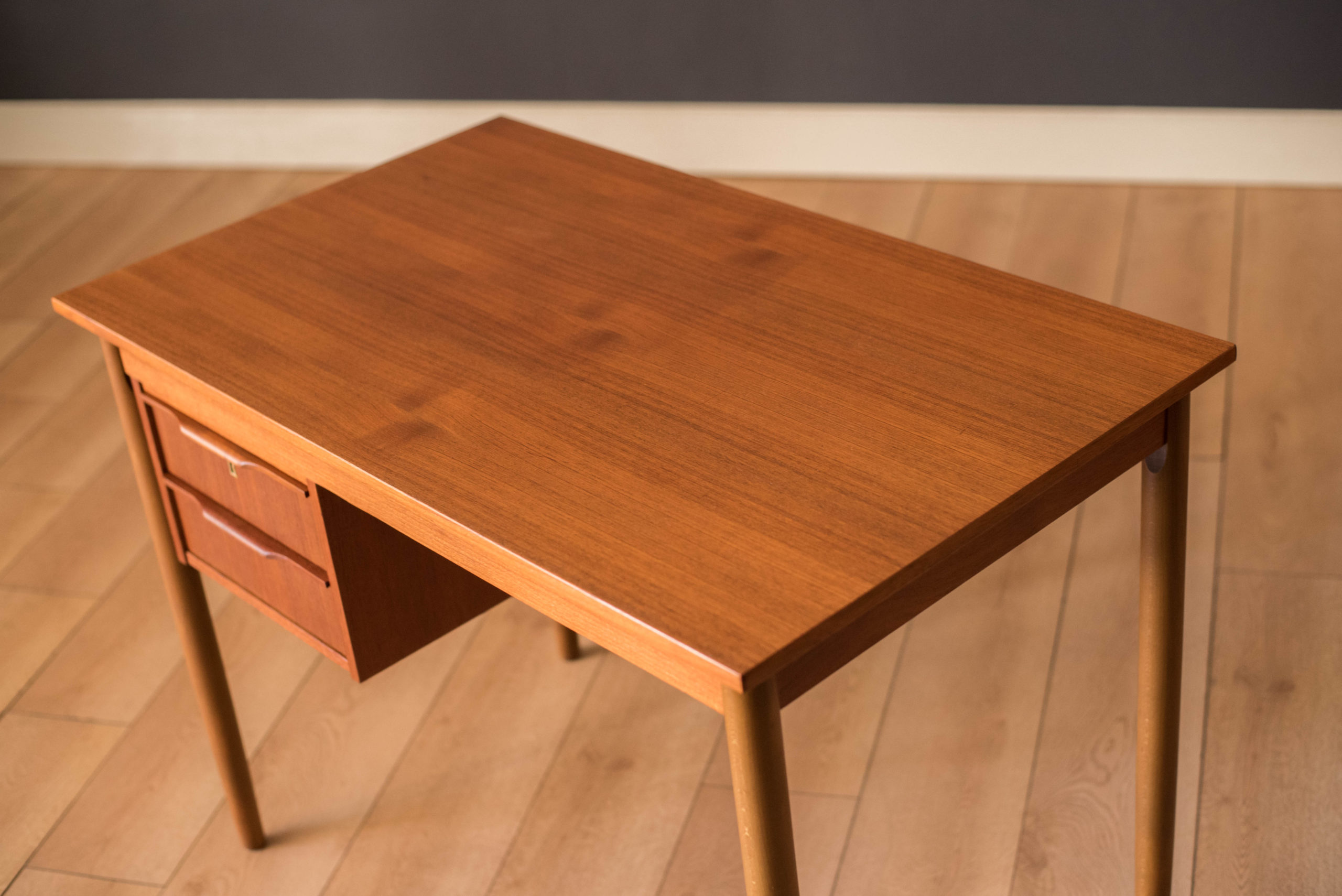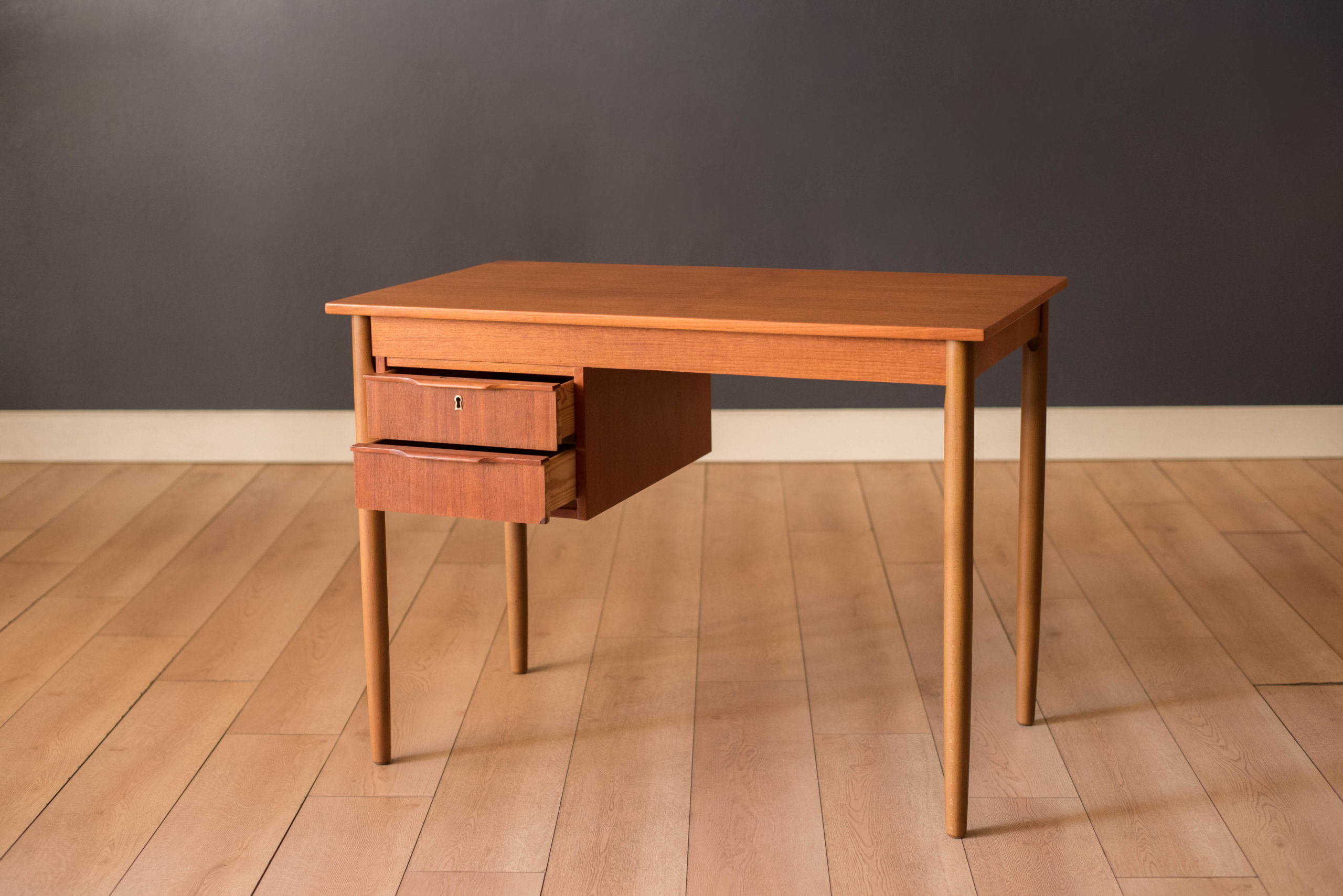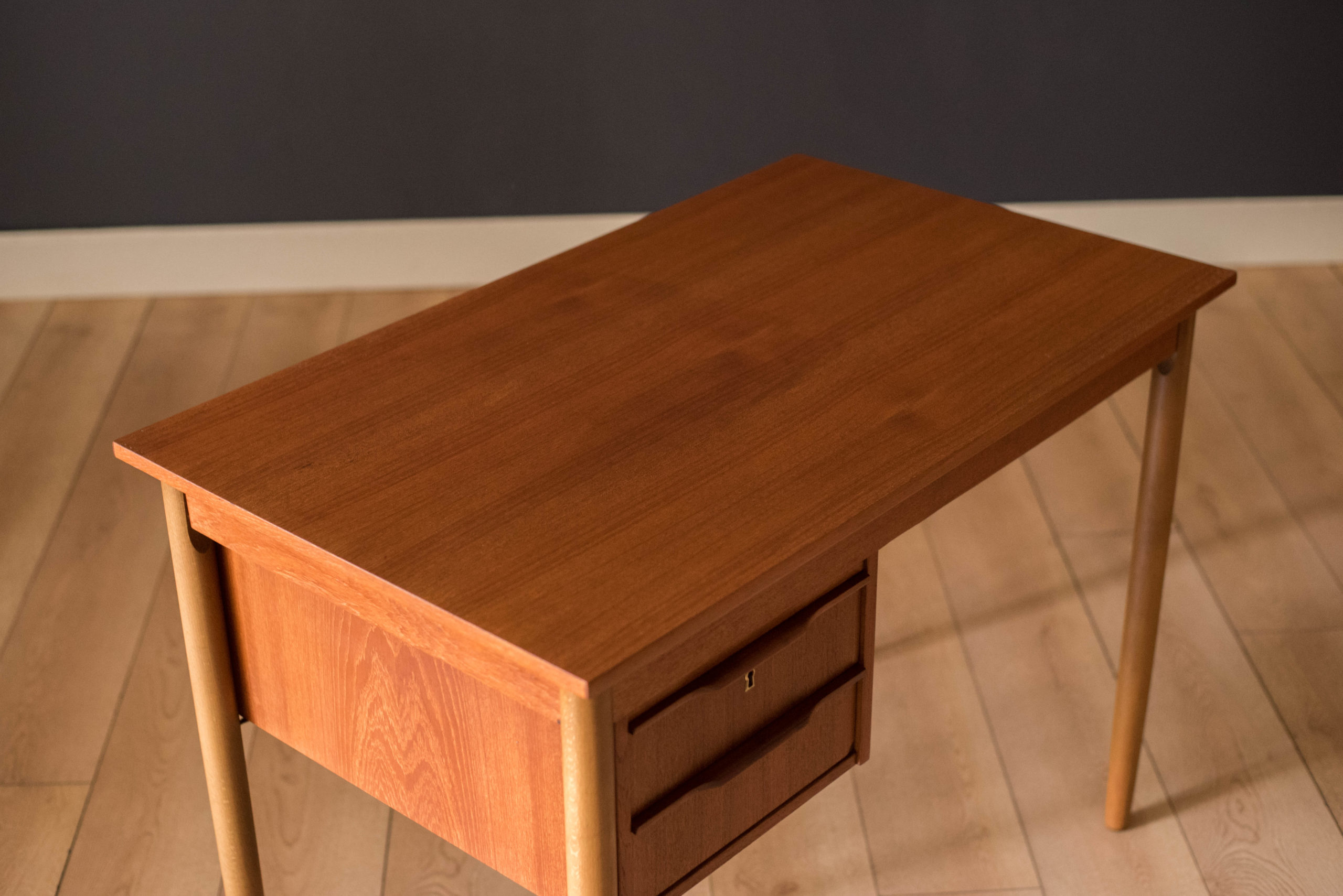 Mid-Century Modern compact writing desk in teak and birch manufactured by Ejsing Møbelfabrik, Denmark. This contrasting piece includes two dovetailed drawers with sculpted handles and tapered pencil legs. The perfect fit for small spaces and can be displayed from any angle with a finished backside. Skeleton key is not included.
