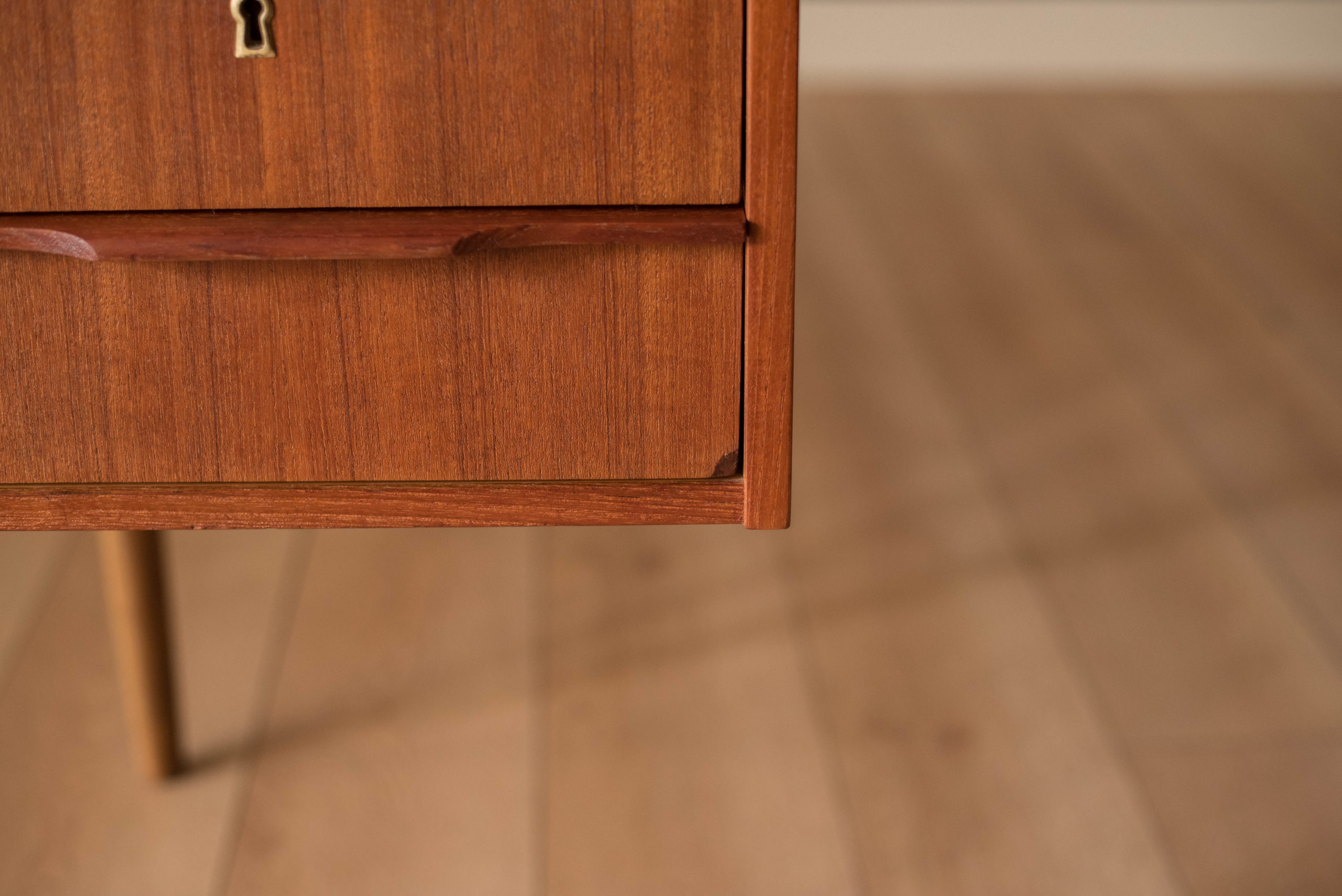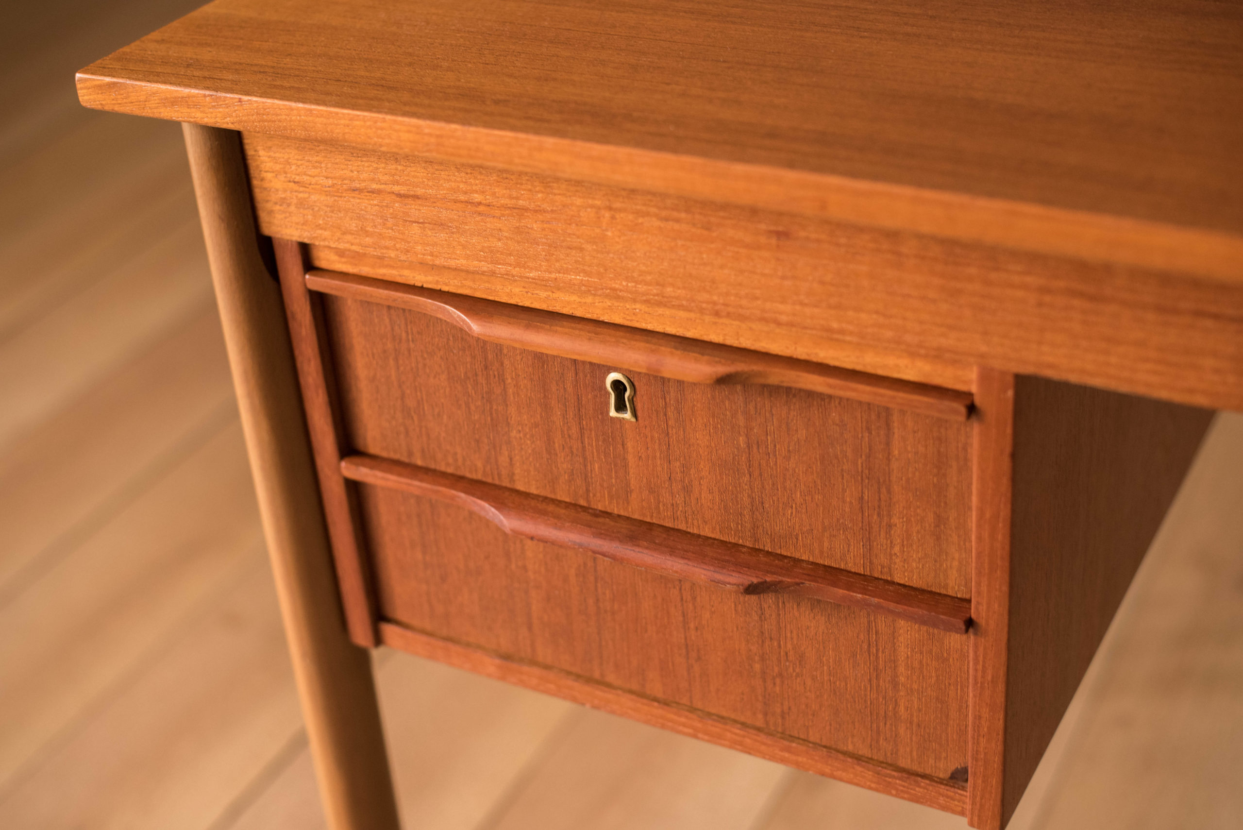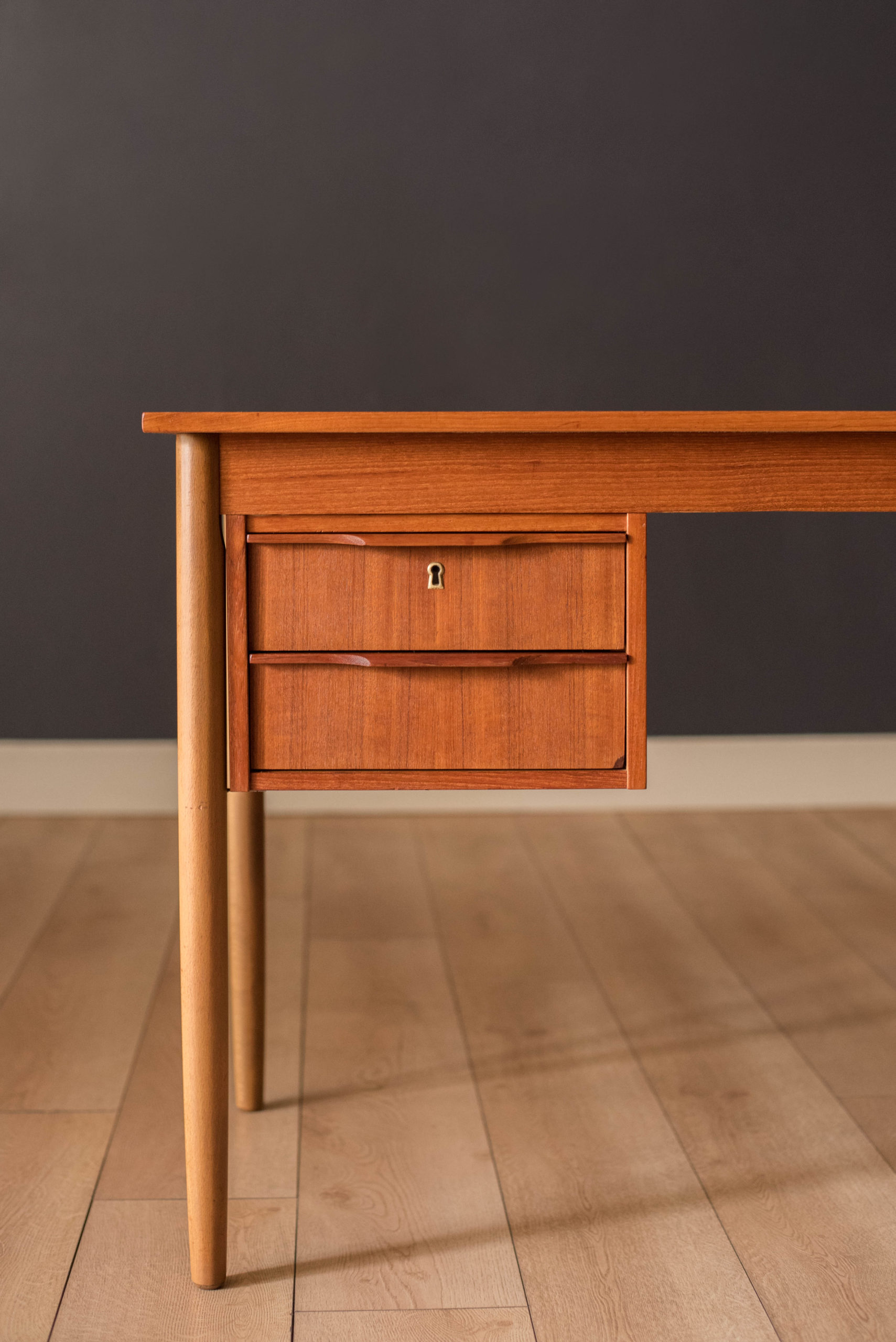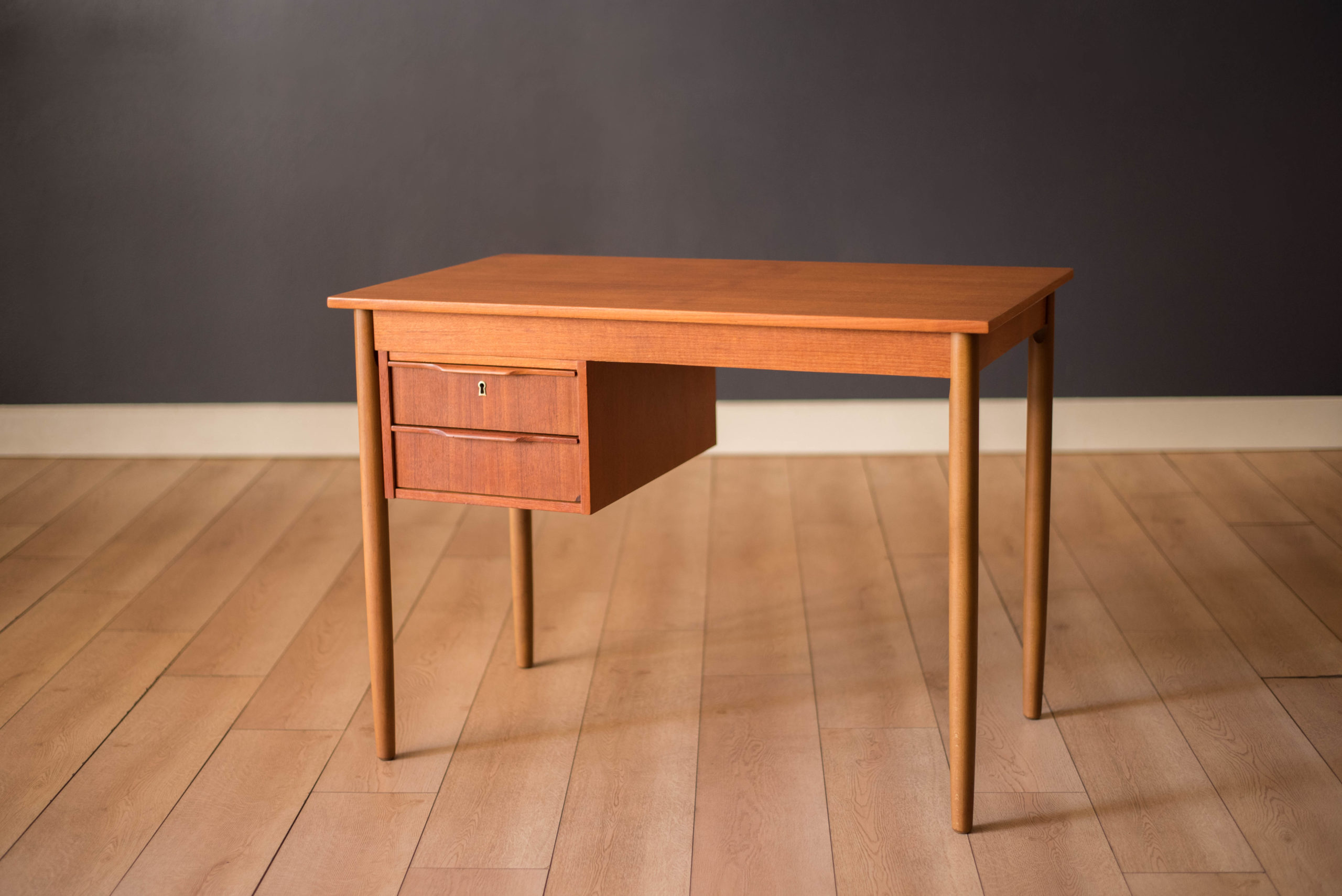 Mid-Century Modern compact writing desk in teak and birch manufactured by Ejsing Møbelfabrik, Denmark. This contrasting piece includes two dovetailed drawers with sculpted handles and tapered pencil legs. The perfect fit for small spaces and can be displayed from any angle with a finished backside. Skeleton key is not included.