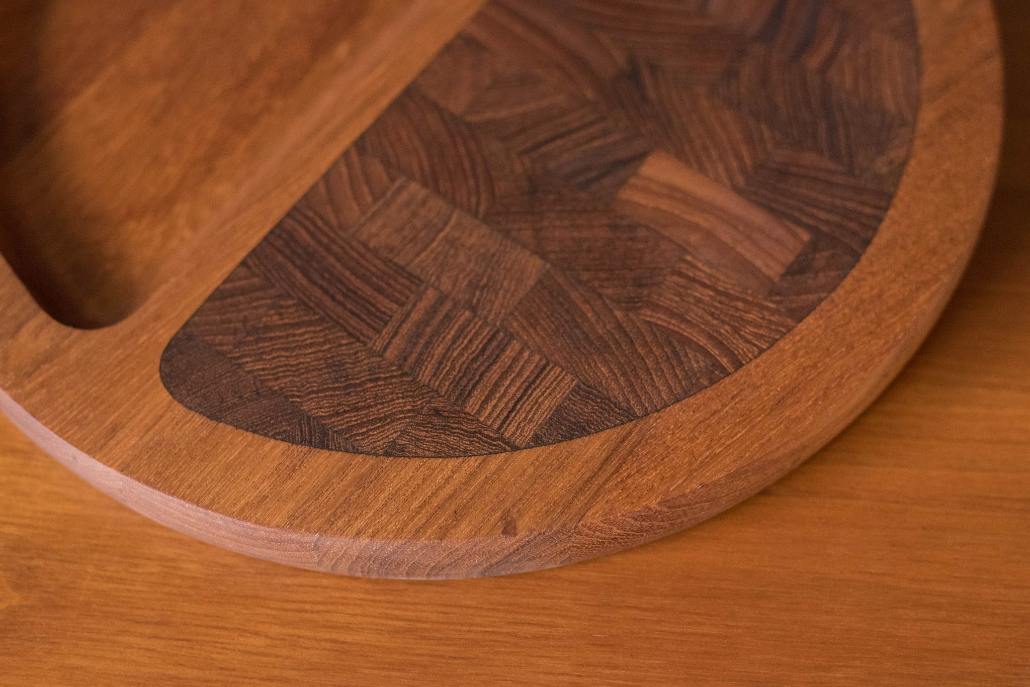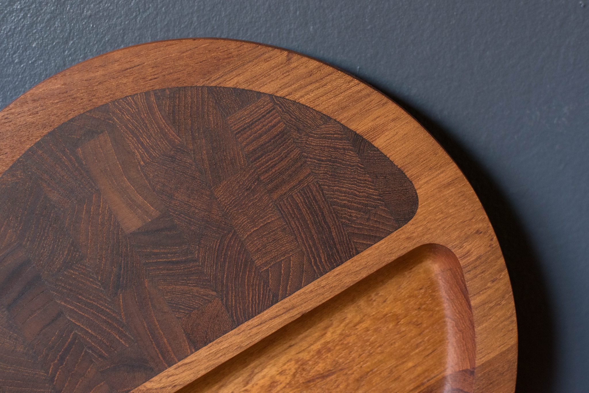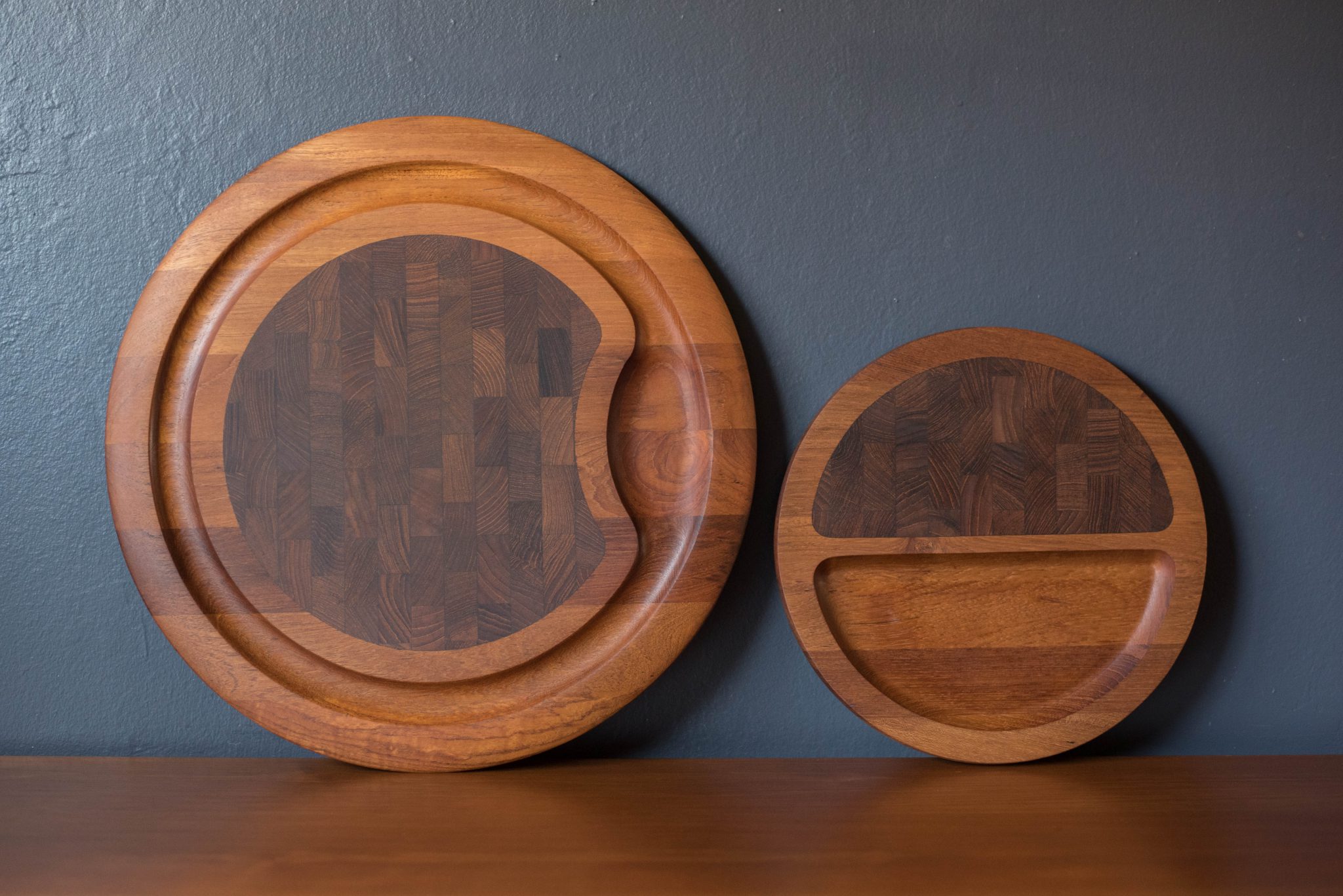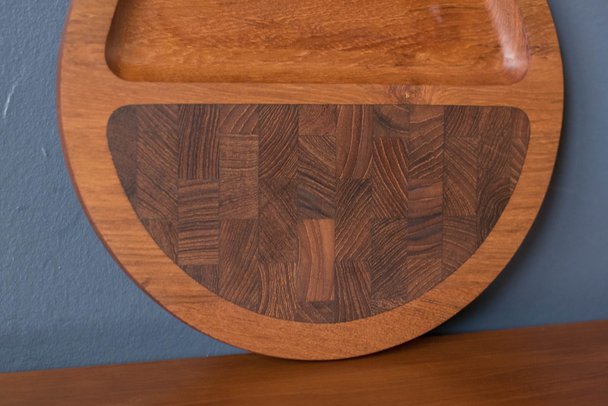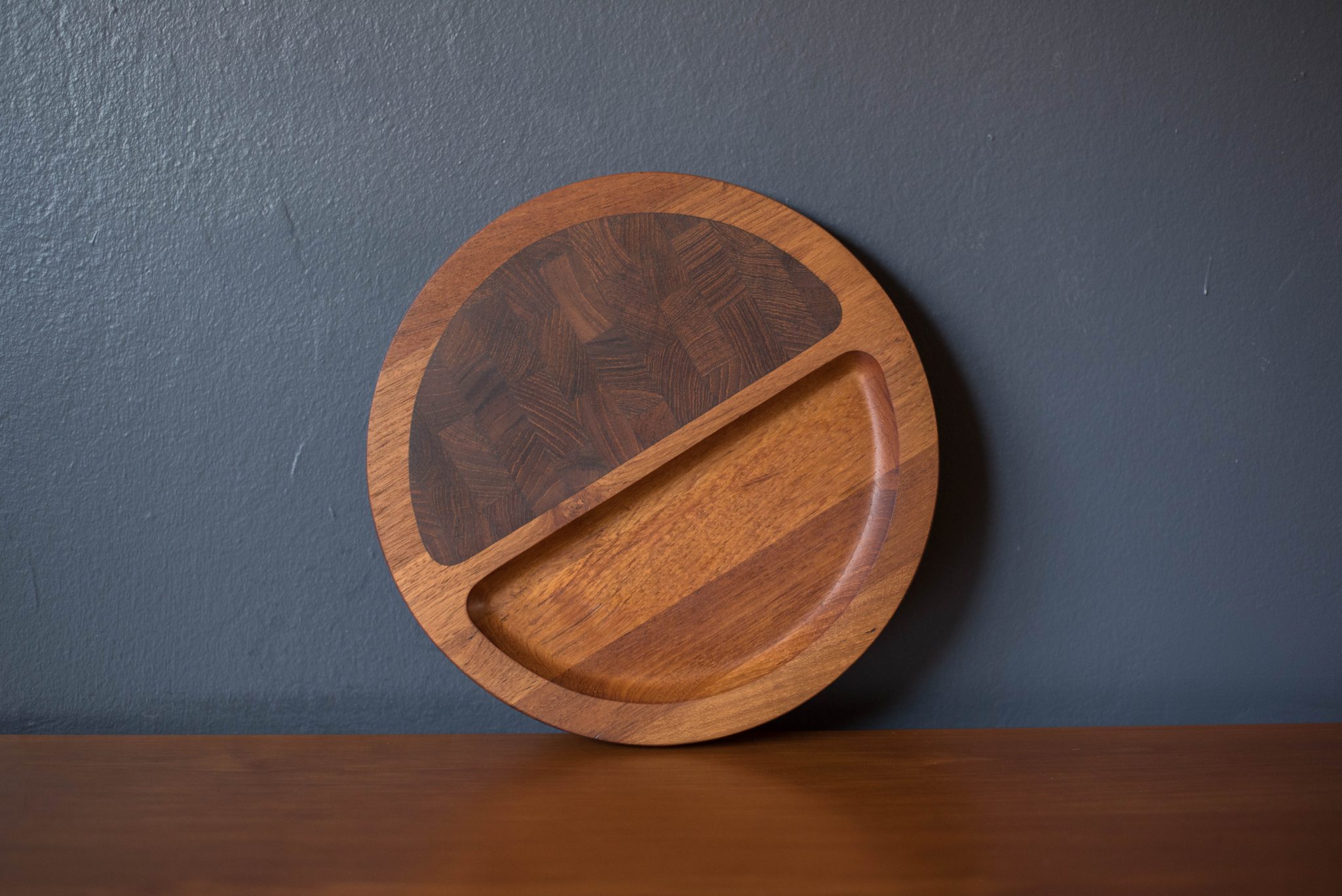 Mid-Century Modern charcuterie board designed by Jens Quistgaard for Dansk, Denmark. This piece is crafted of solid planked teak with a hardwood end grain section perfect for cutting. Functions as a serving dish or home decor accent.