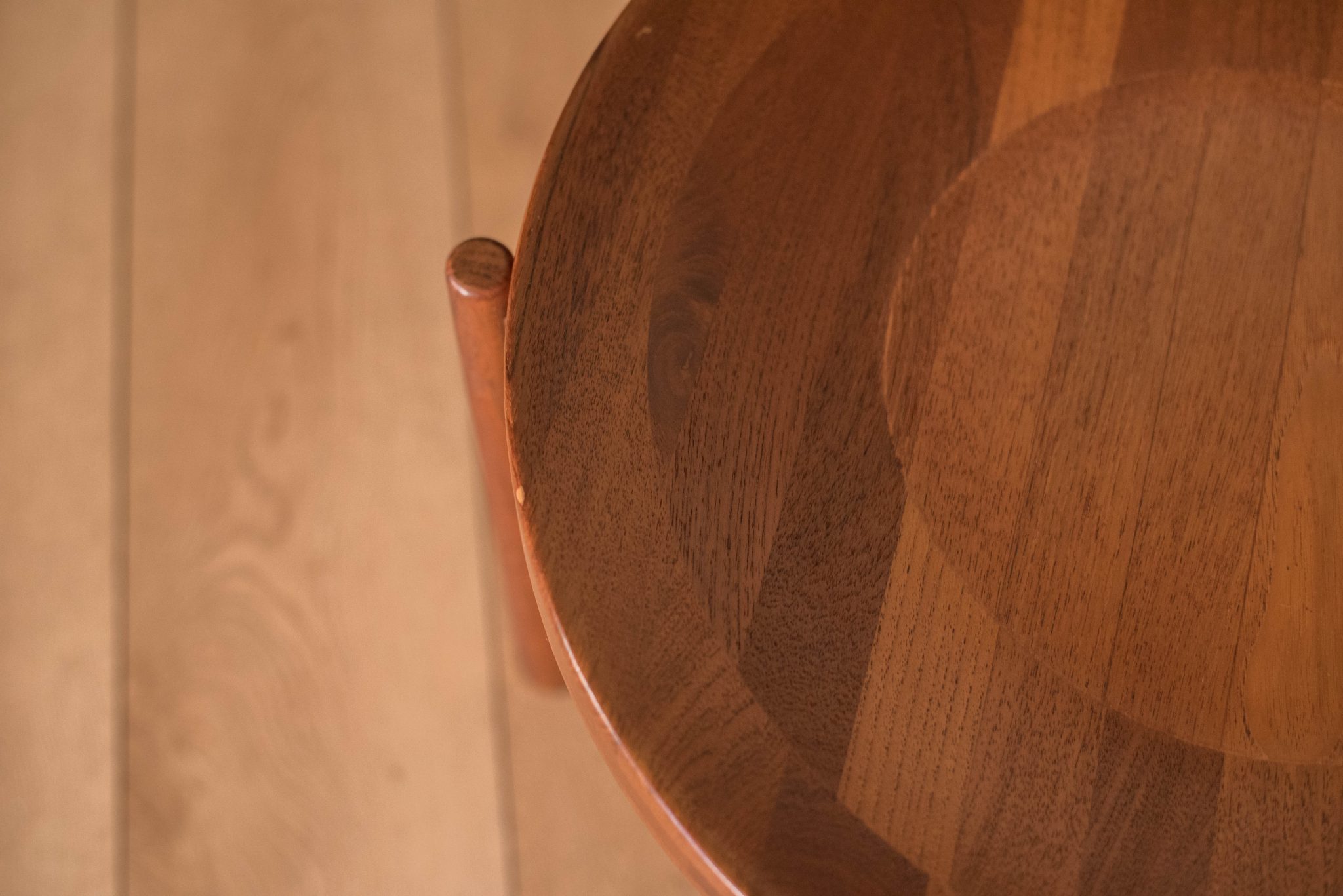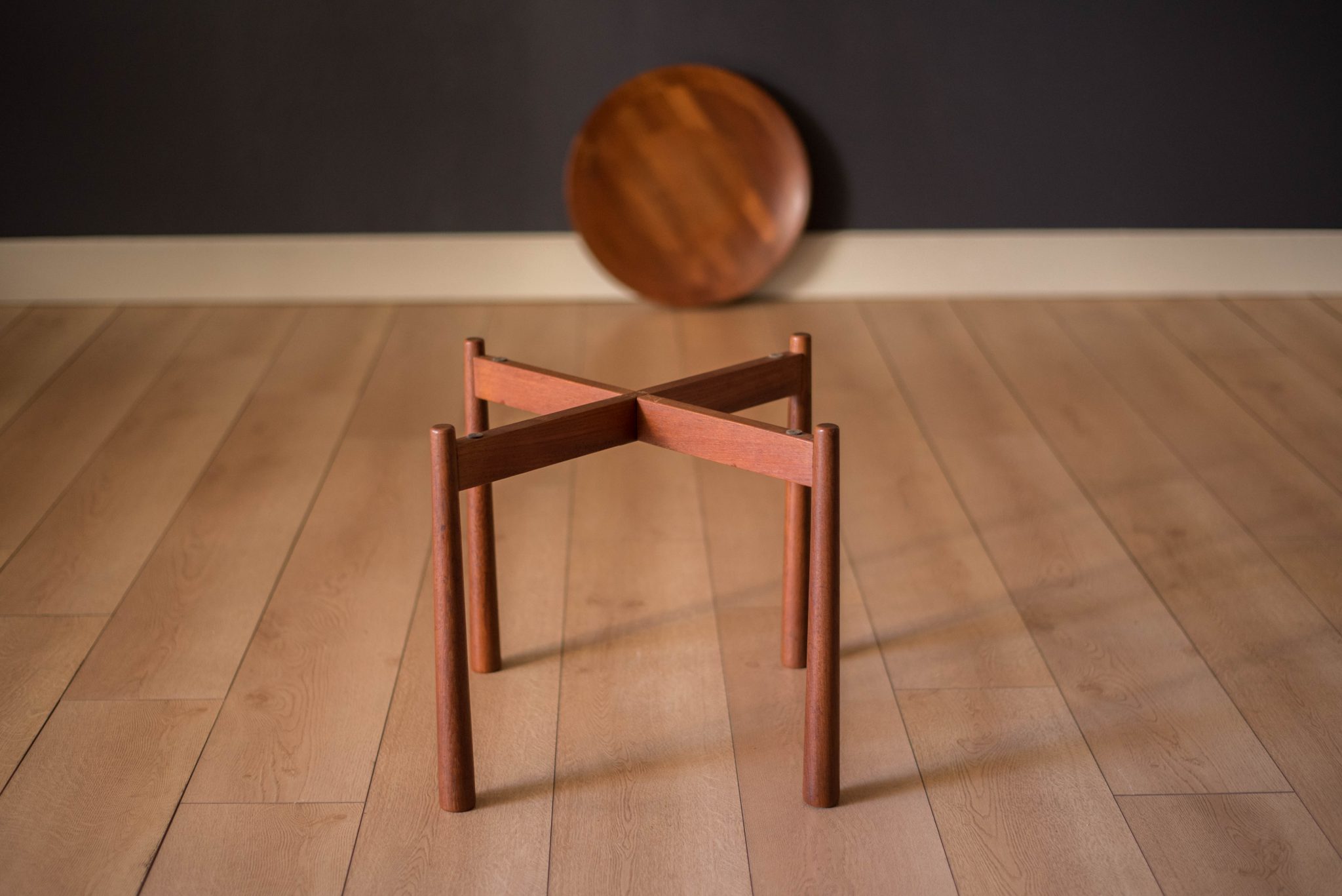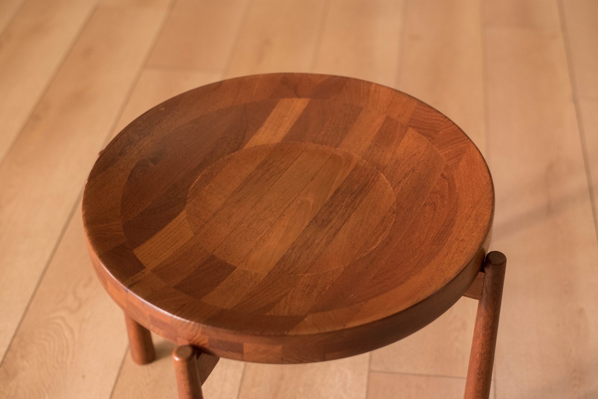 Mid-Century Modern round tray table manufactured by Dux of Sweden. This side table is made of solid planked teak that features a reversible concave and flat top.