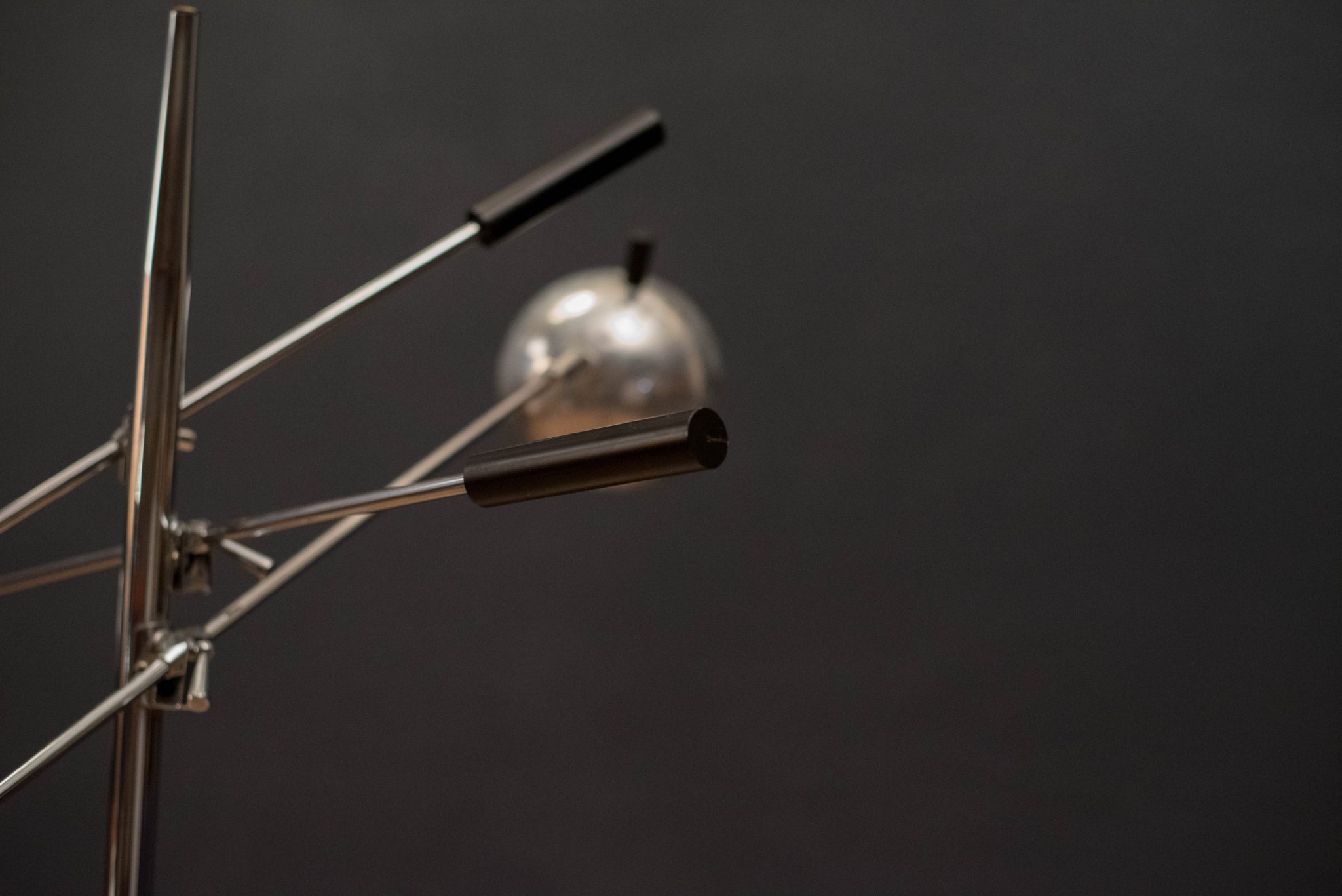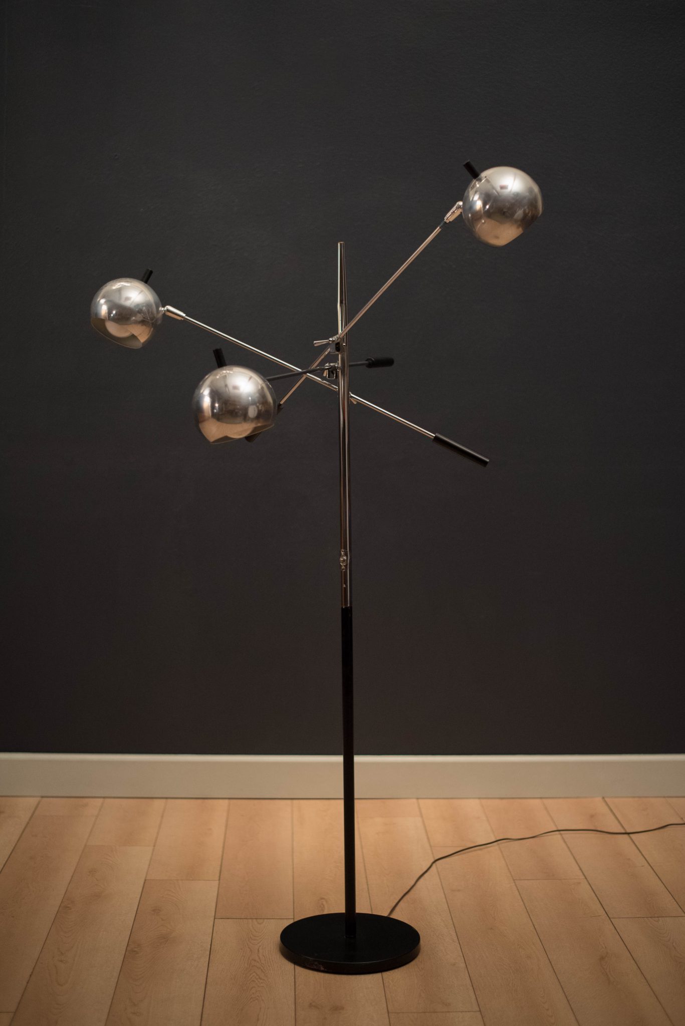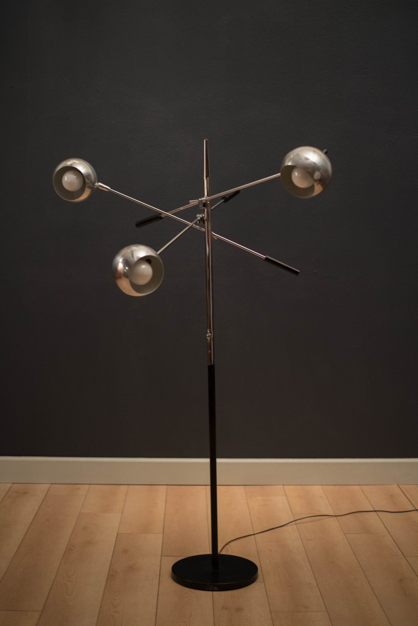 Mid-Century Modern Triennale floor lamp designed by Robert Sonneman. This versatile piece features three adjustable chrome globe lights that pivot on balancing lever arms.