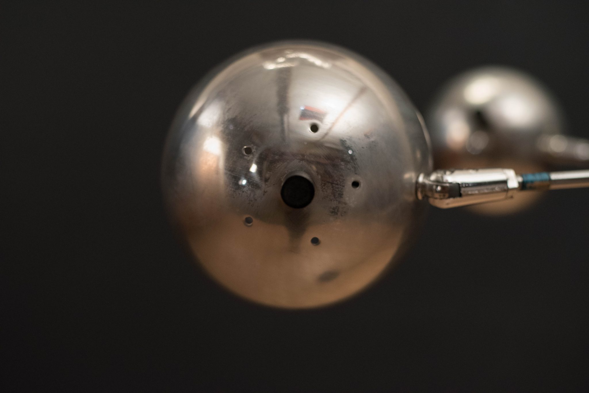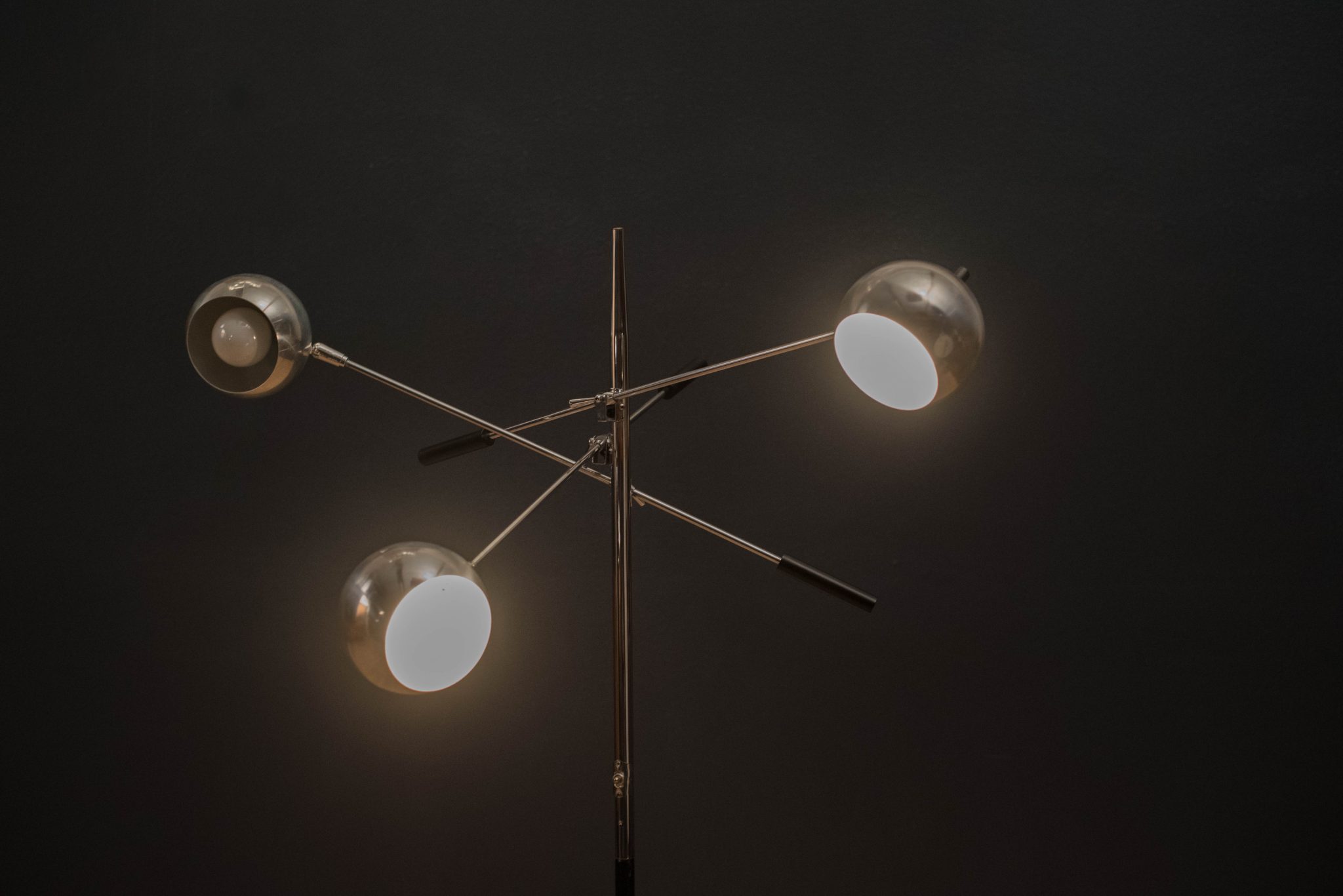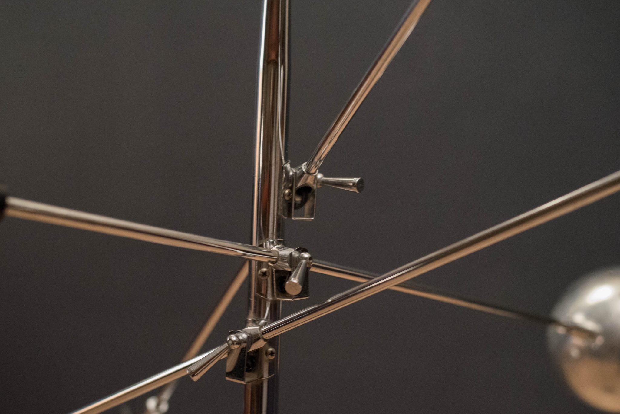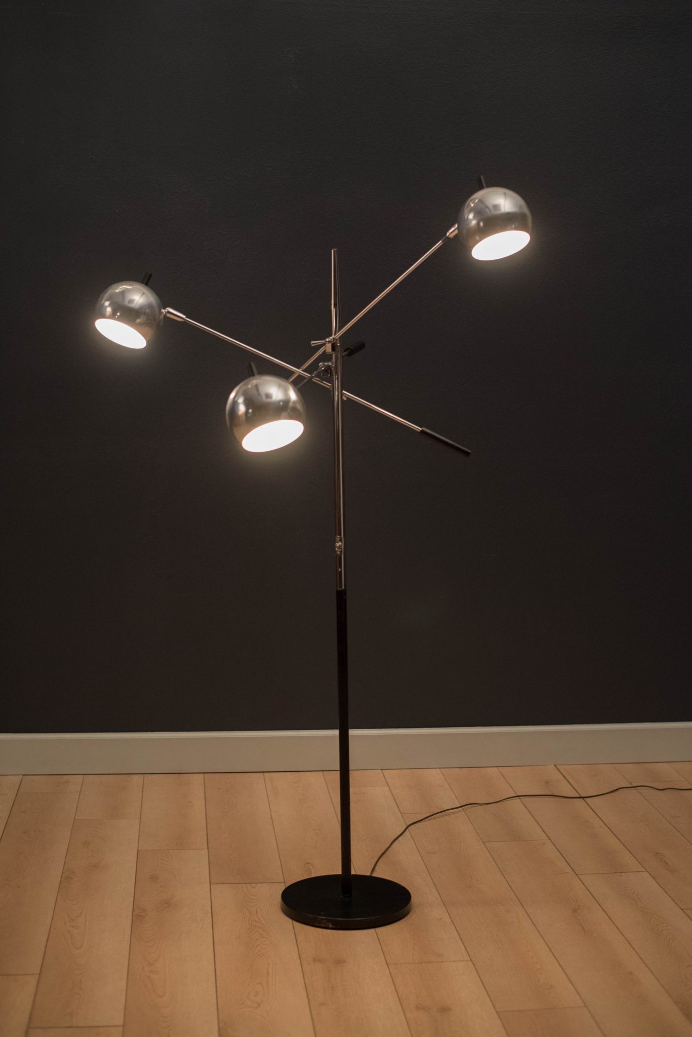 Mid-Century Modern Triennale floor lamp designed by Robert Sonneman. This versatile piece features three adjustable chrome globe lights that pivot on balancing lever arms.