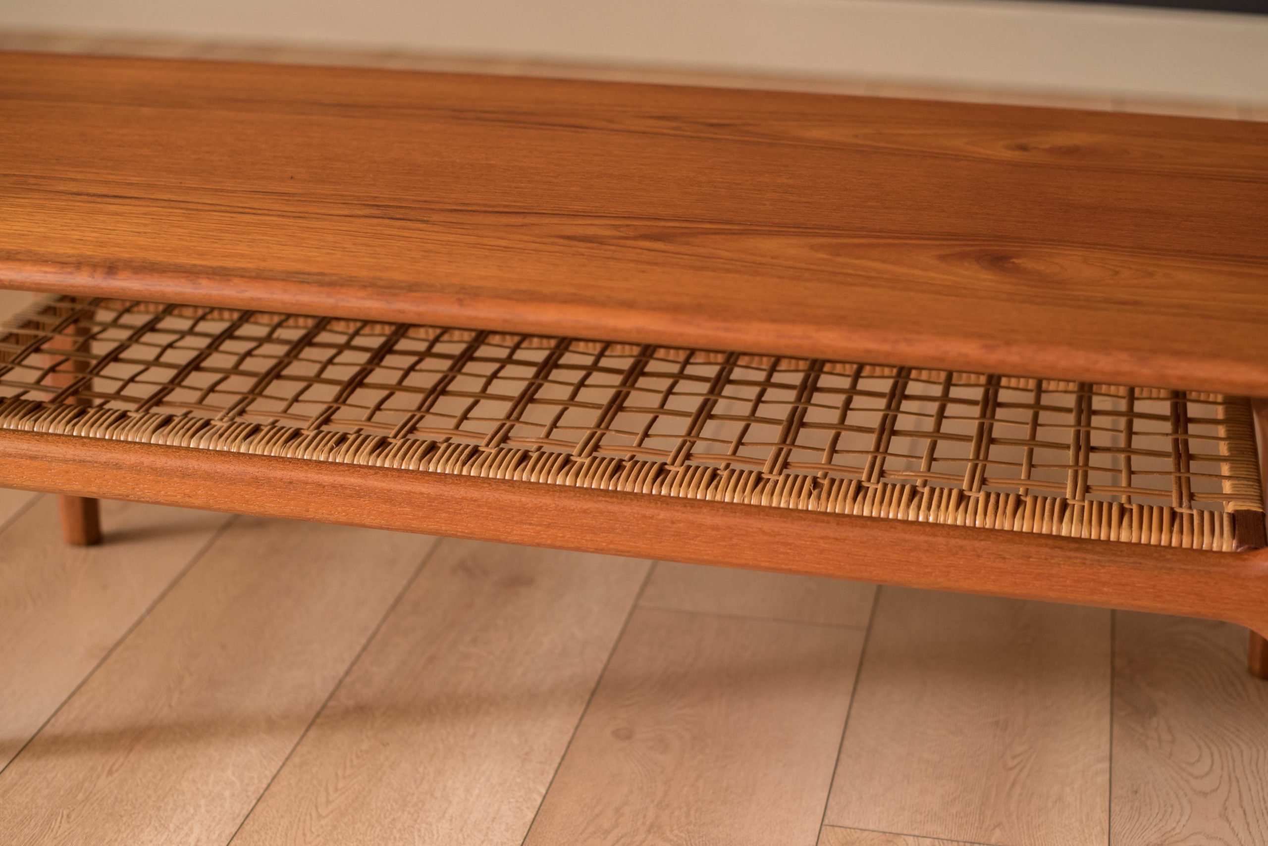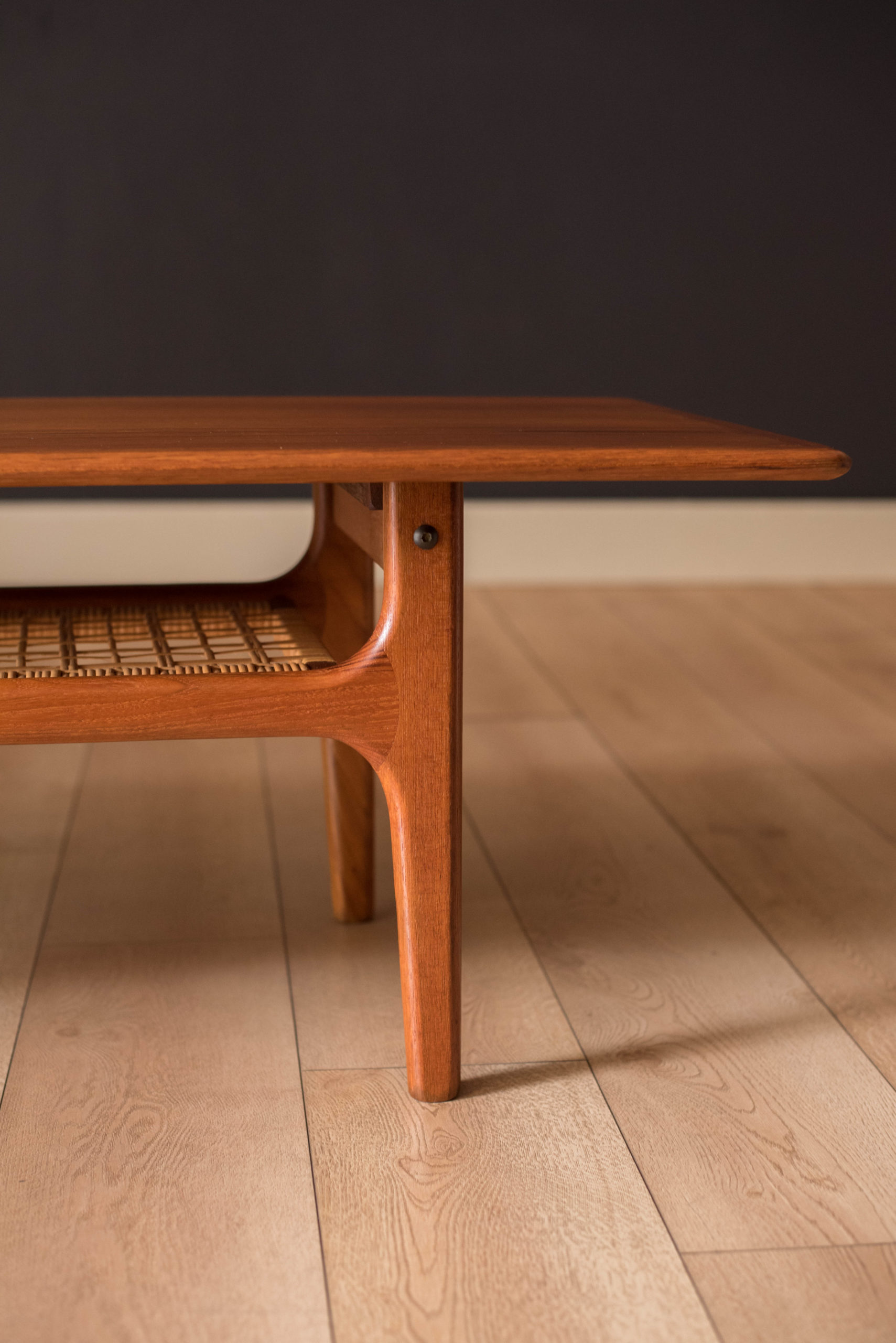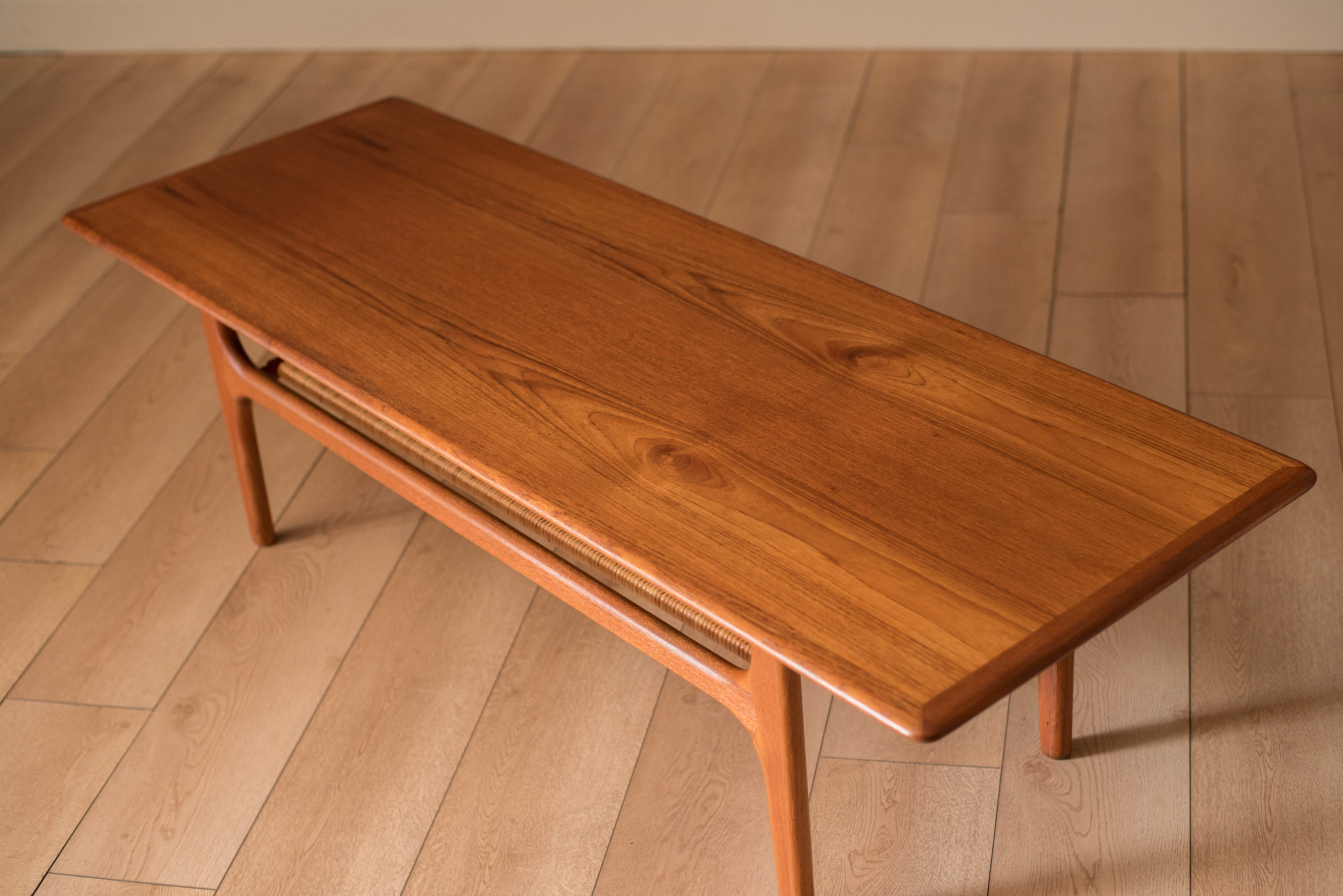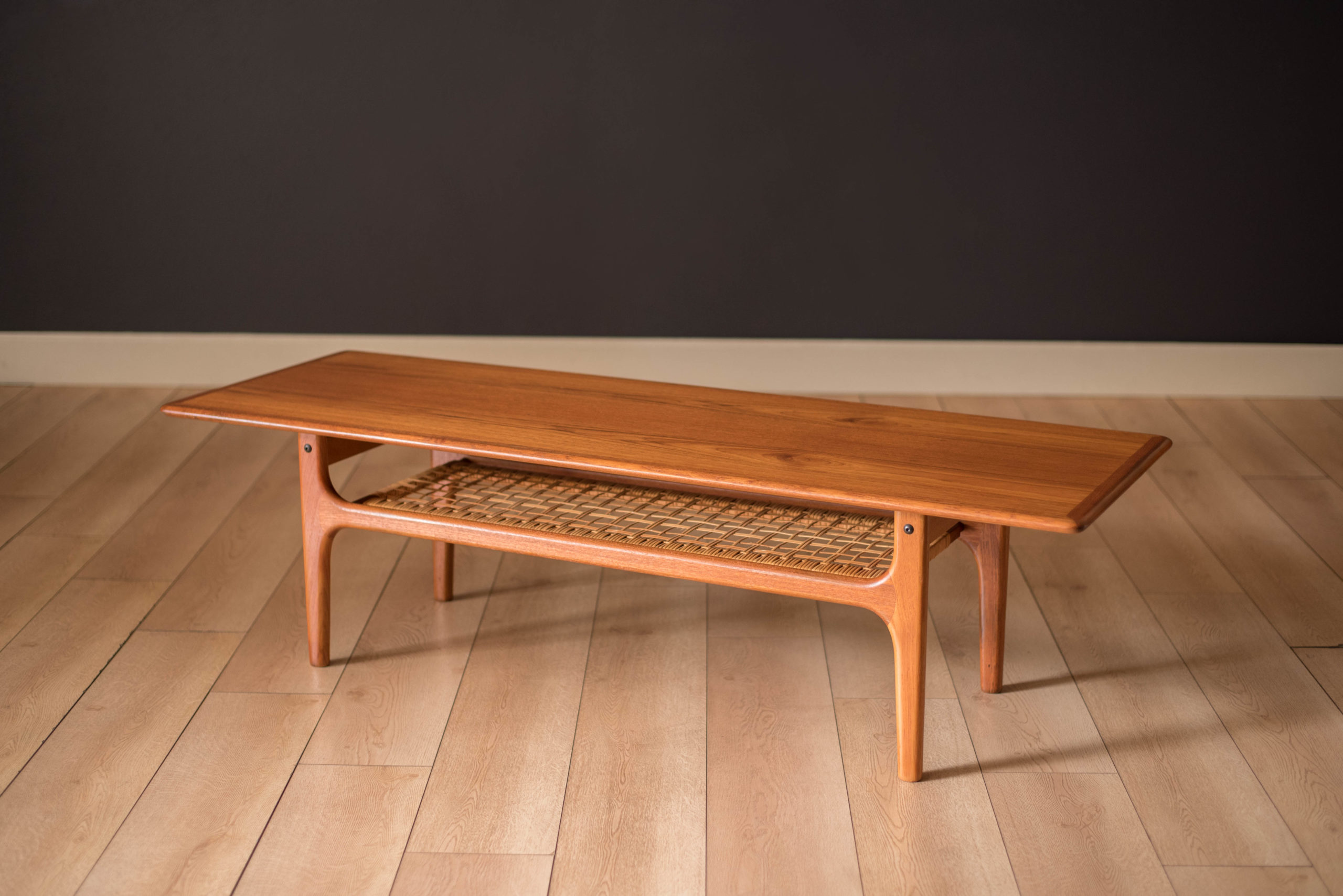 Mid century modern coffee table manufactured by Trioh, Denmark. This piece features sculpted edge banding and natural teak wood grains. Includes a lower tier magazine shelf for extra storage display made of hand woven cane kept intact.