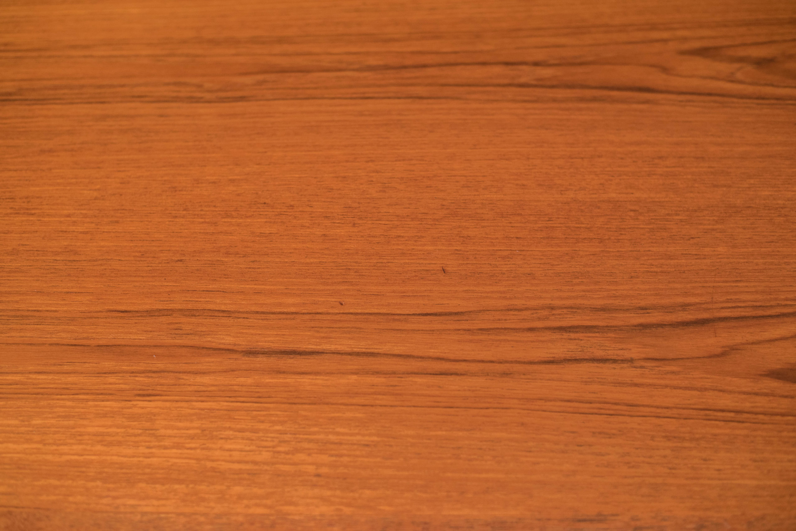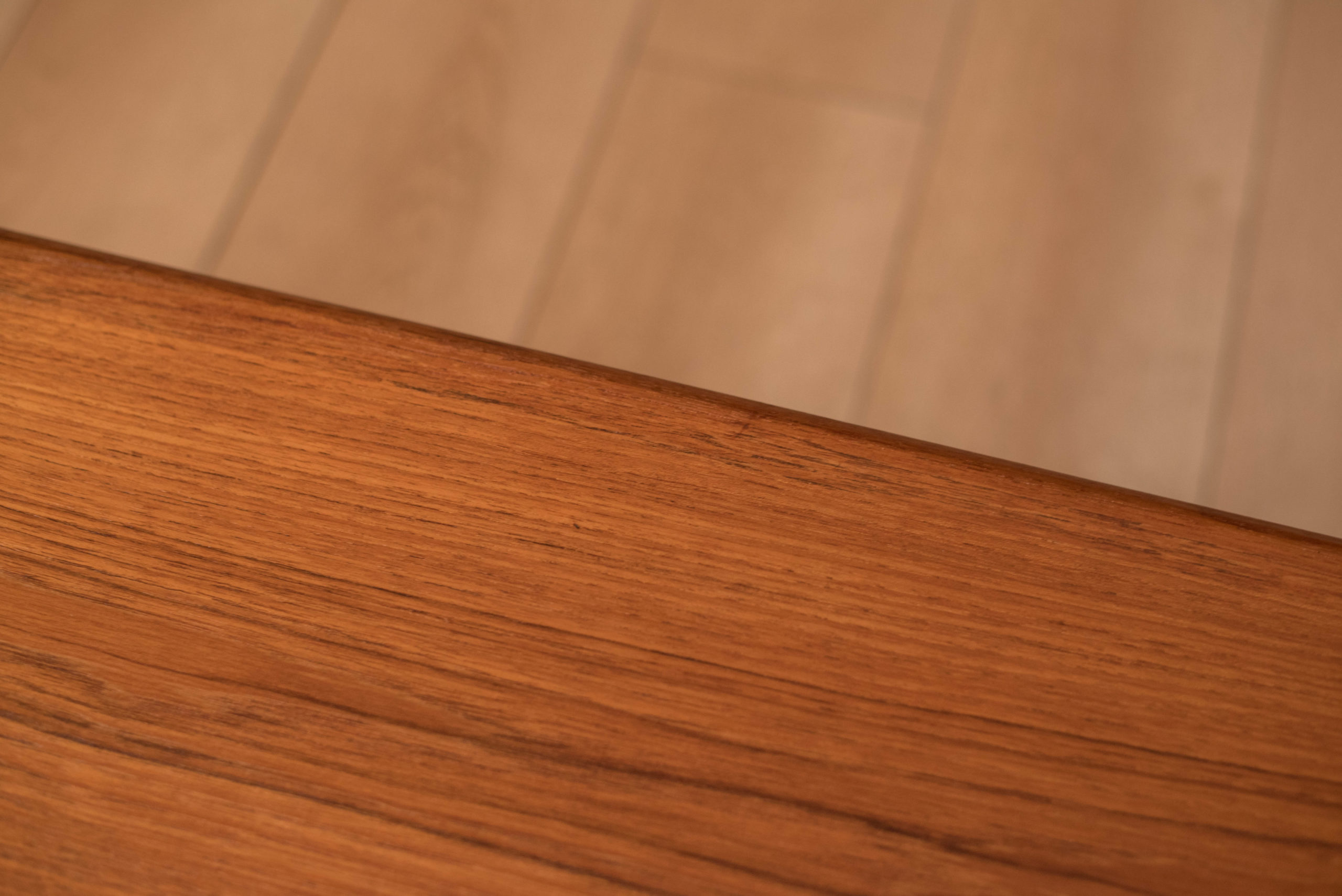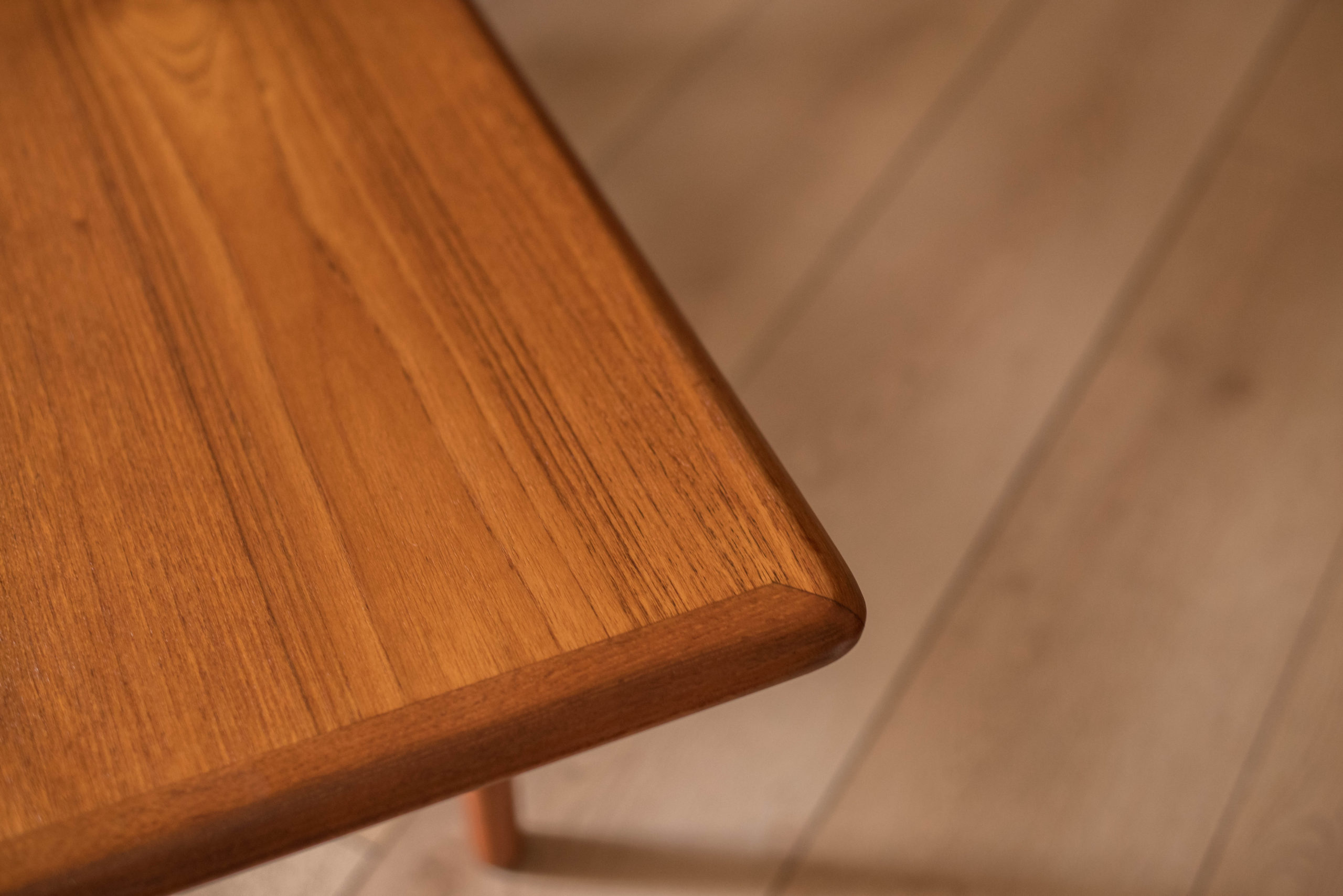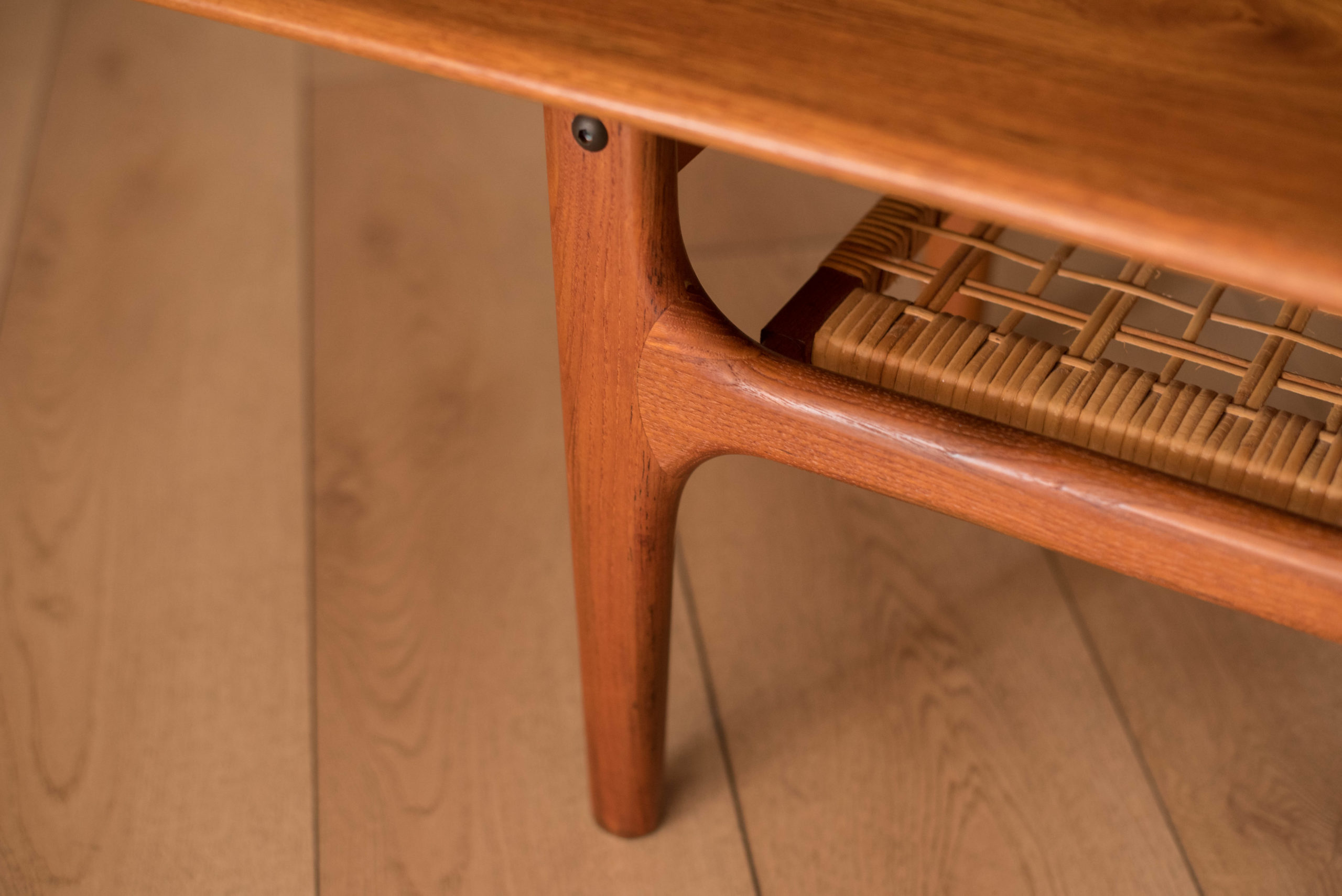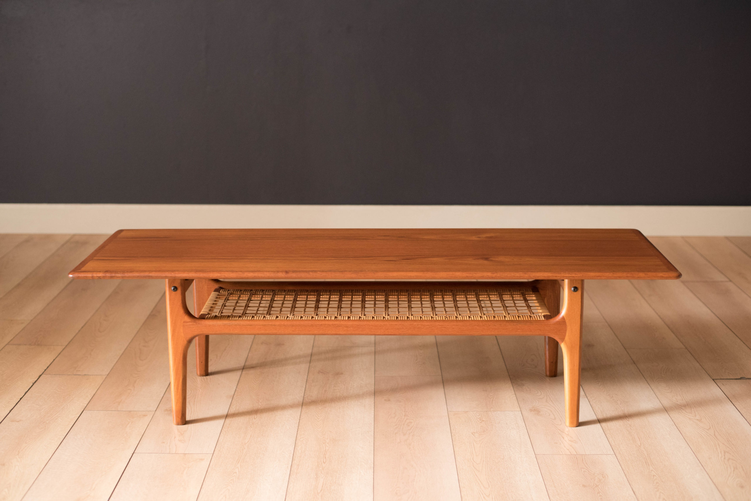 Mid century modern coffee table manufactured by Trioh, Denmark. This piece features sculpted edge banding and natural teak wood grains. Includes a lower tier magazine shelf for extra storage display made of hand woven cane kept intact.