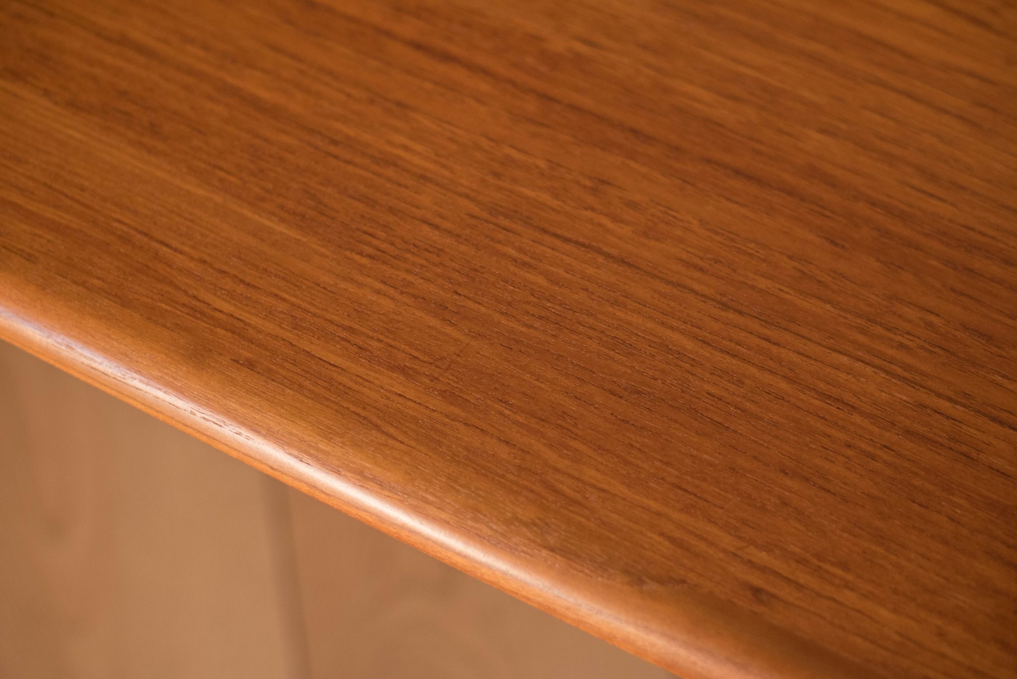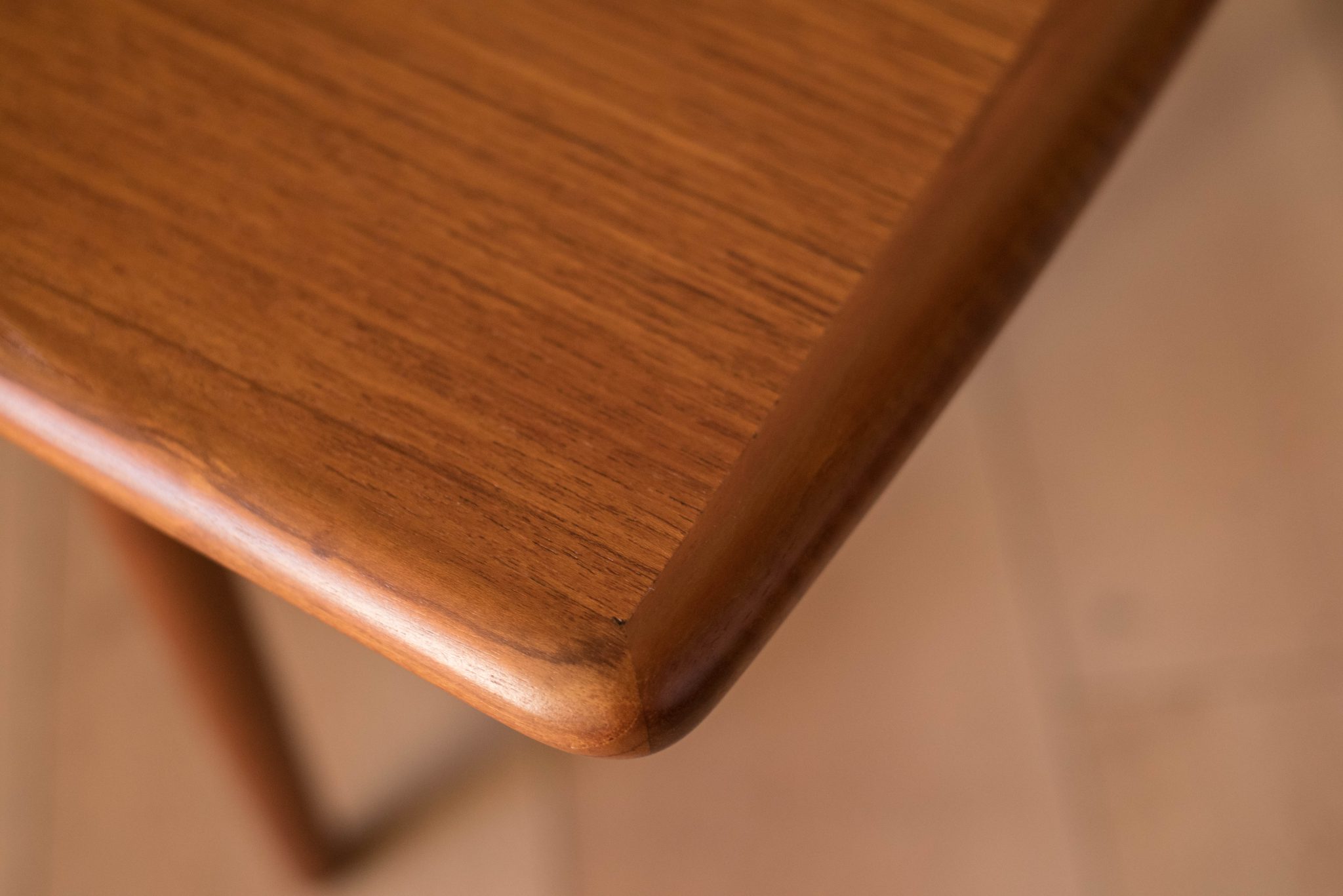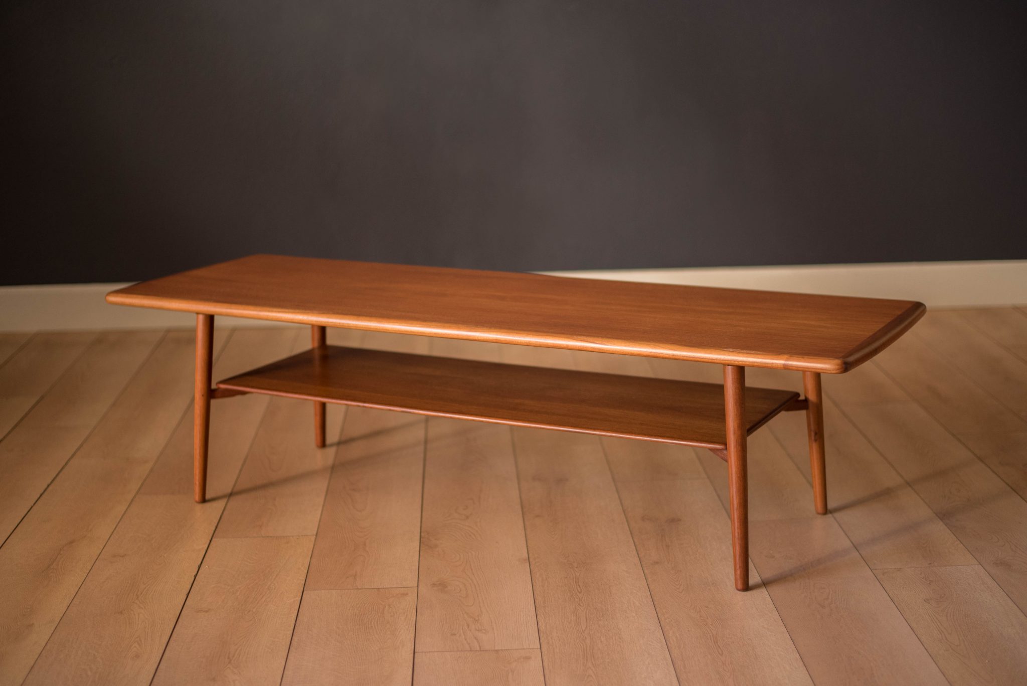Mid-Century Modern surfboard coffee table, circa 1960s. This piece features a two-tier display providing additional storage space. Finished with splayed legs and contrasting aged solid teak edge banding.
