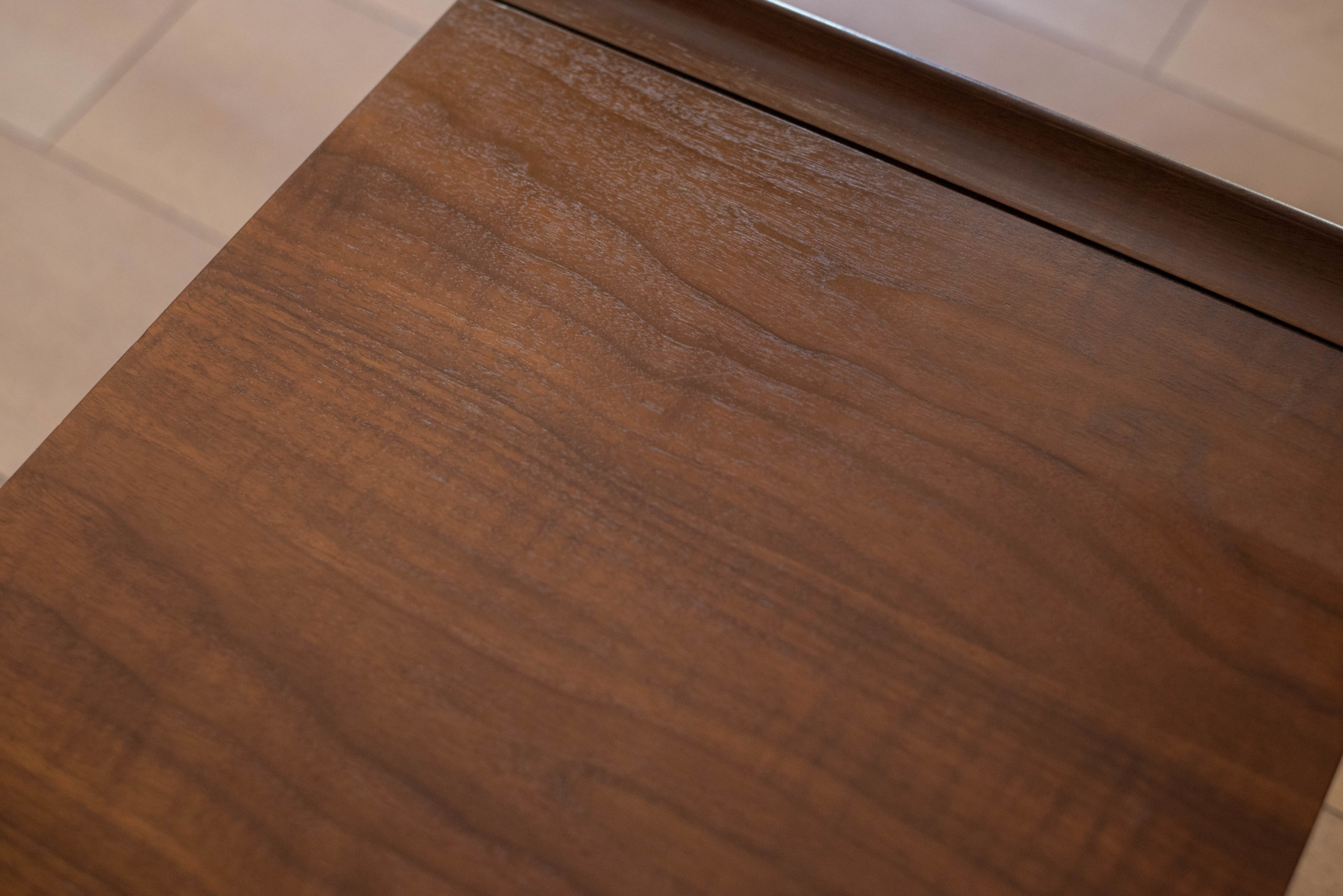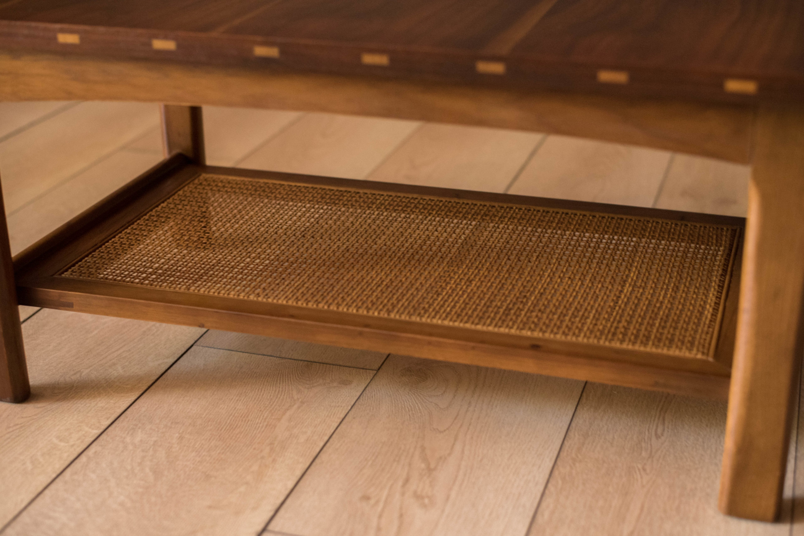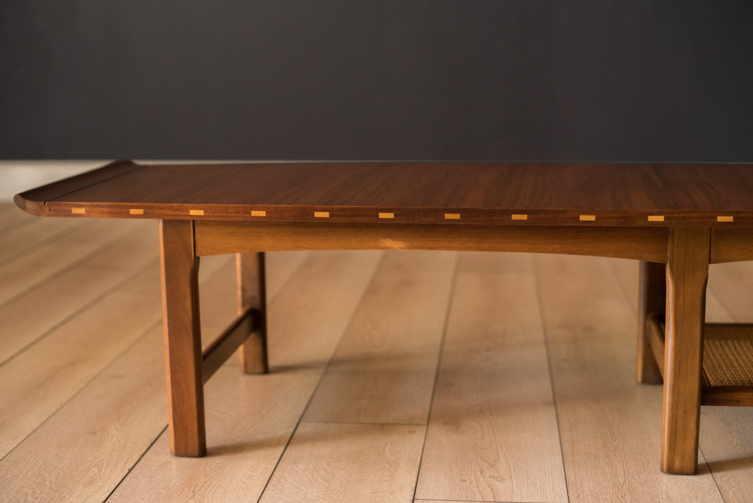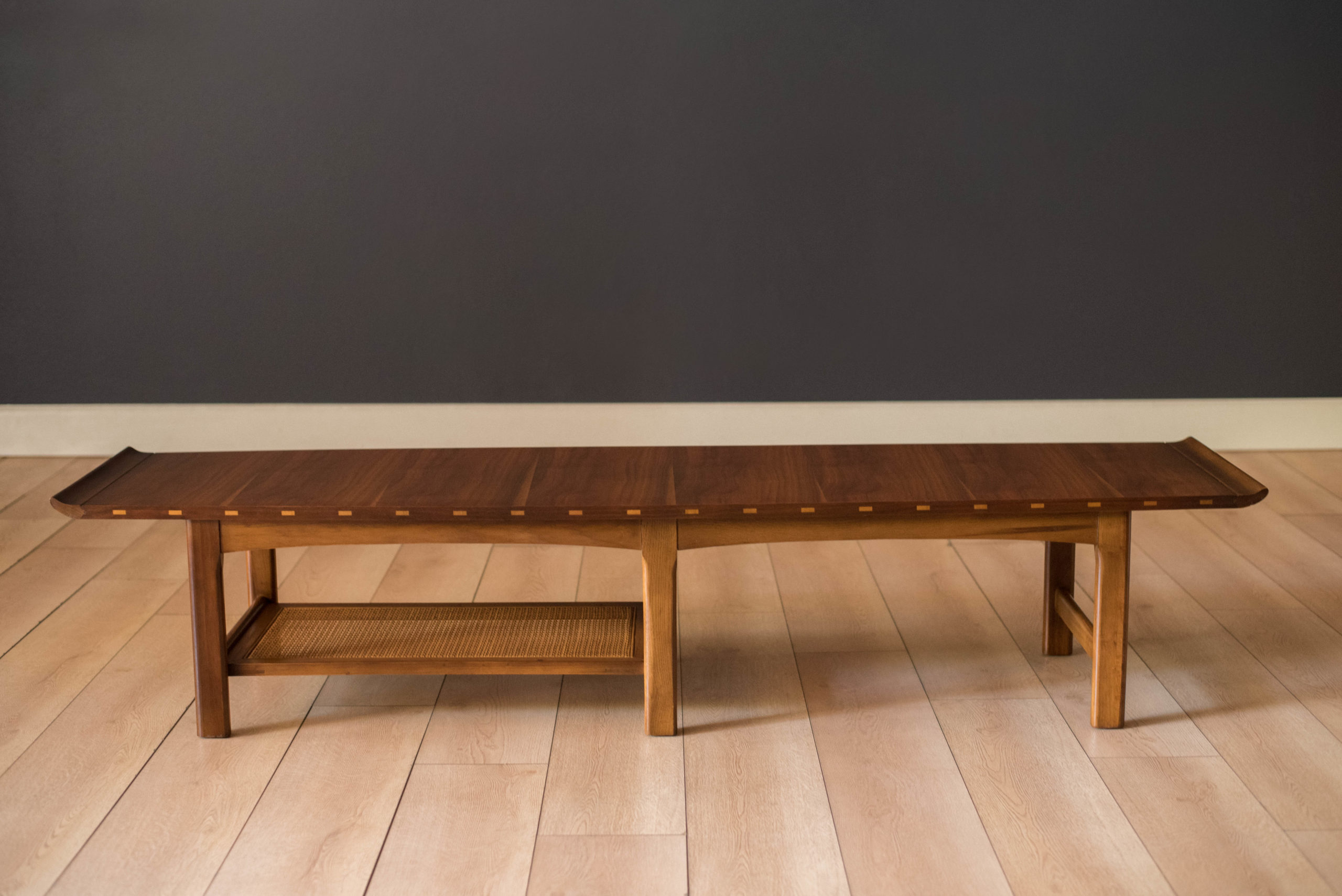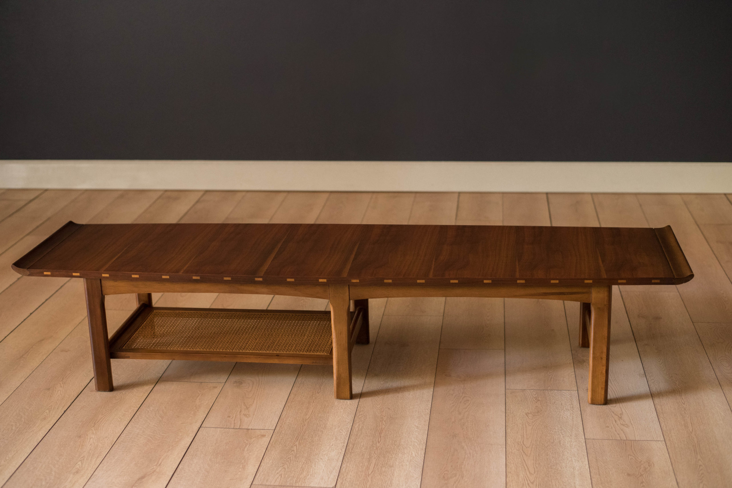 Mid-Century Modern coffee table in walnut manufactured by Lane Furniture Company circa 1960’s. Features a surfboard shaped top with exposed contrasting oak joinery and raised lip edges. Includes a second tier lower shelf made of cane for extra storage display. This versatile table is sturdy enough to be used as an entryway or hallway bench.
