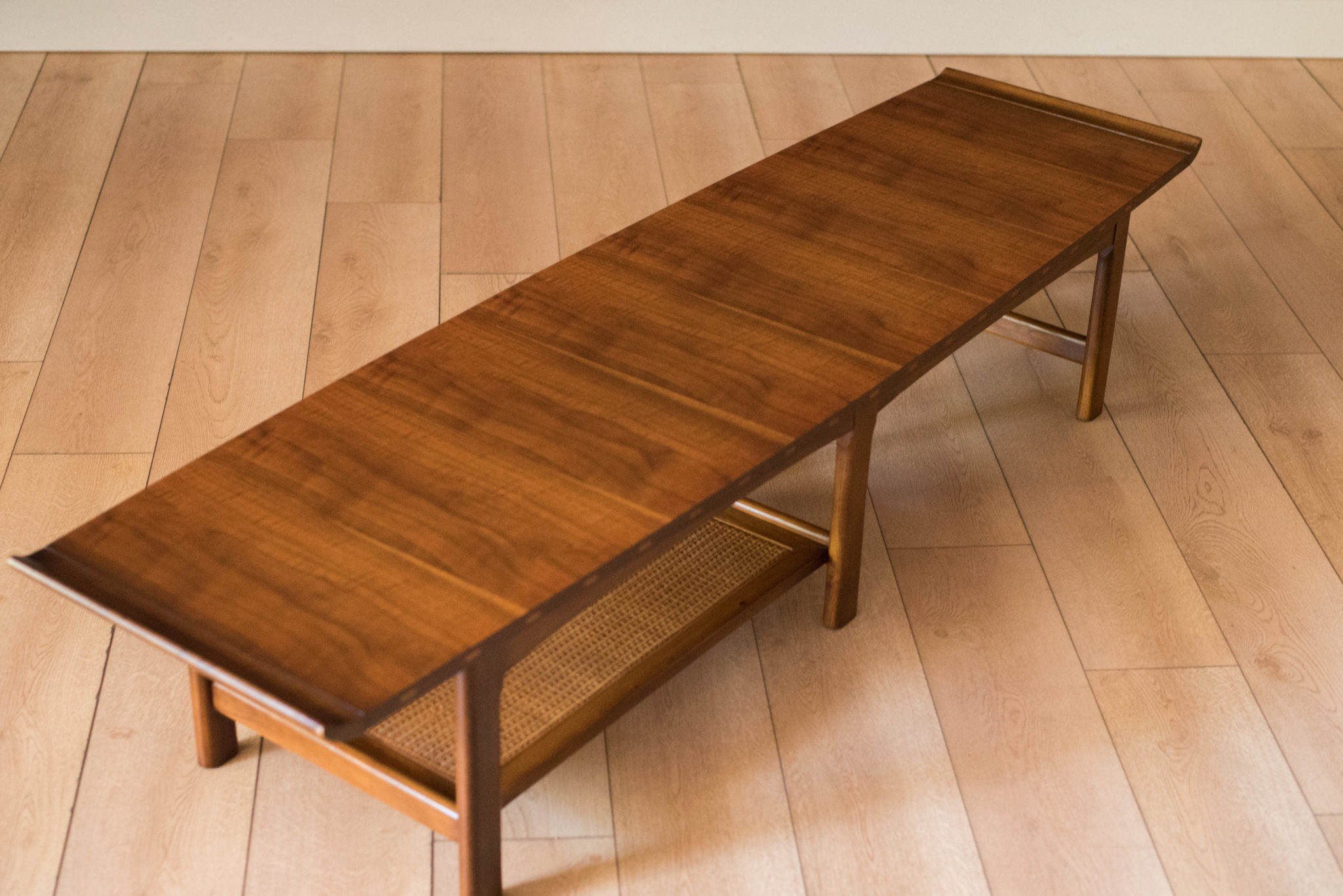 Mid-Century Modern coffee table in walnut manufactured by Lane Furniture Company circa 1960’s. Features a surfboard shaped top with exposed contrasting oak joinery and raised lip edges. Includes a second tier lower shelf made of cane for extra storage display. This versatile table is sturdy enough to be used as an entryway or hallway bench.