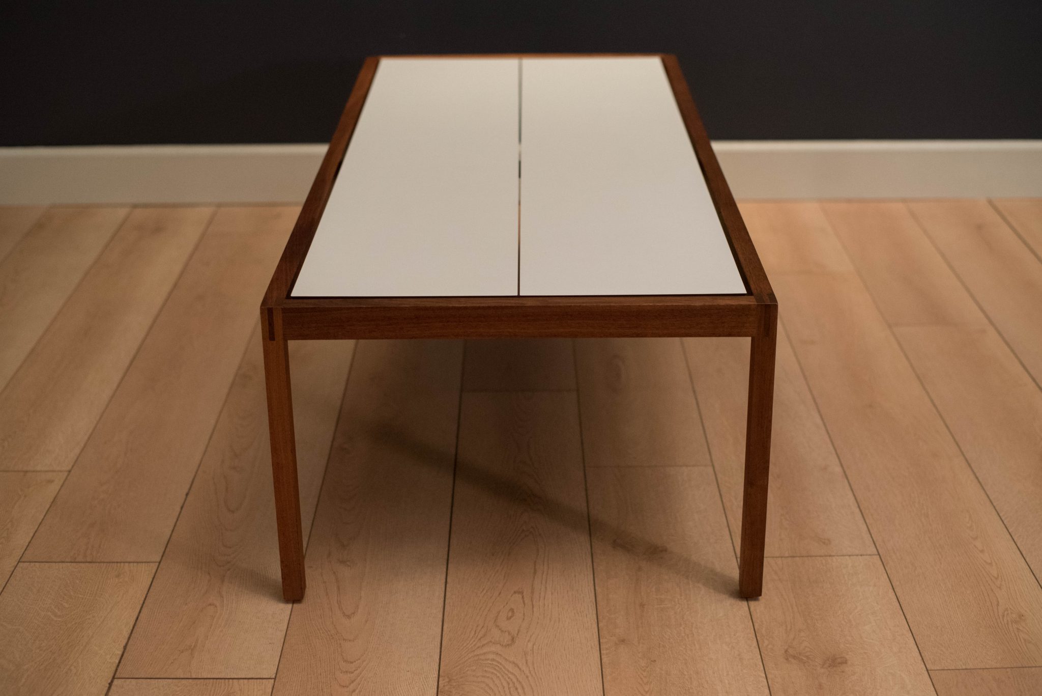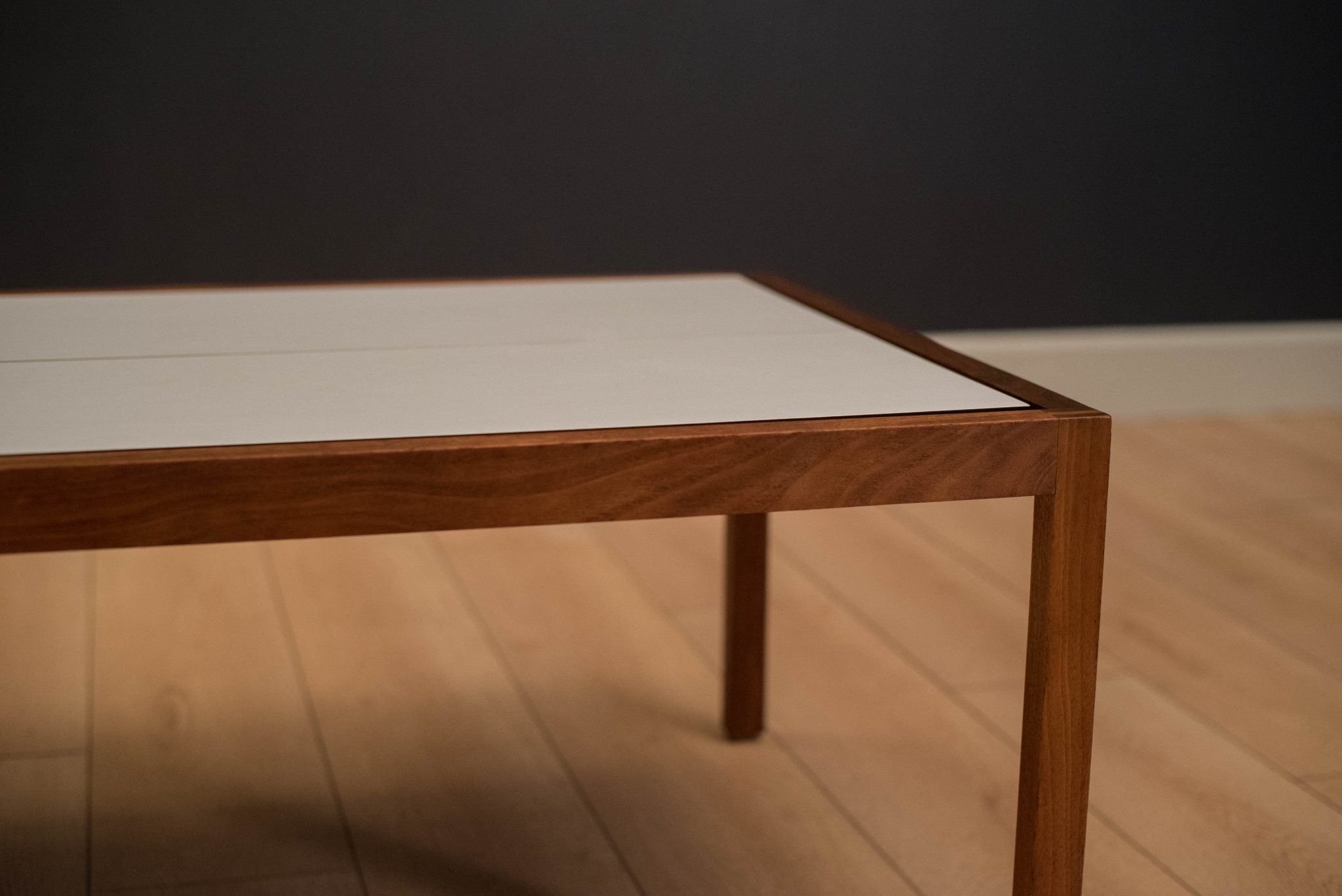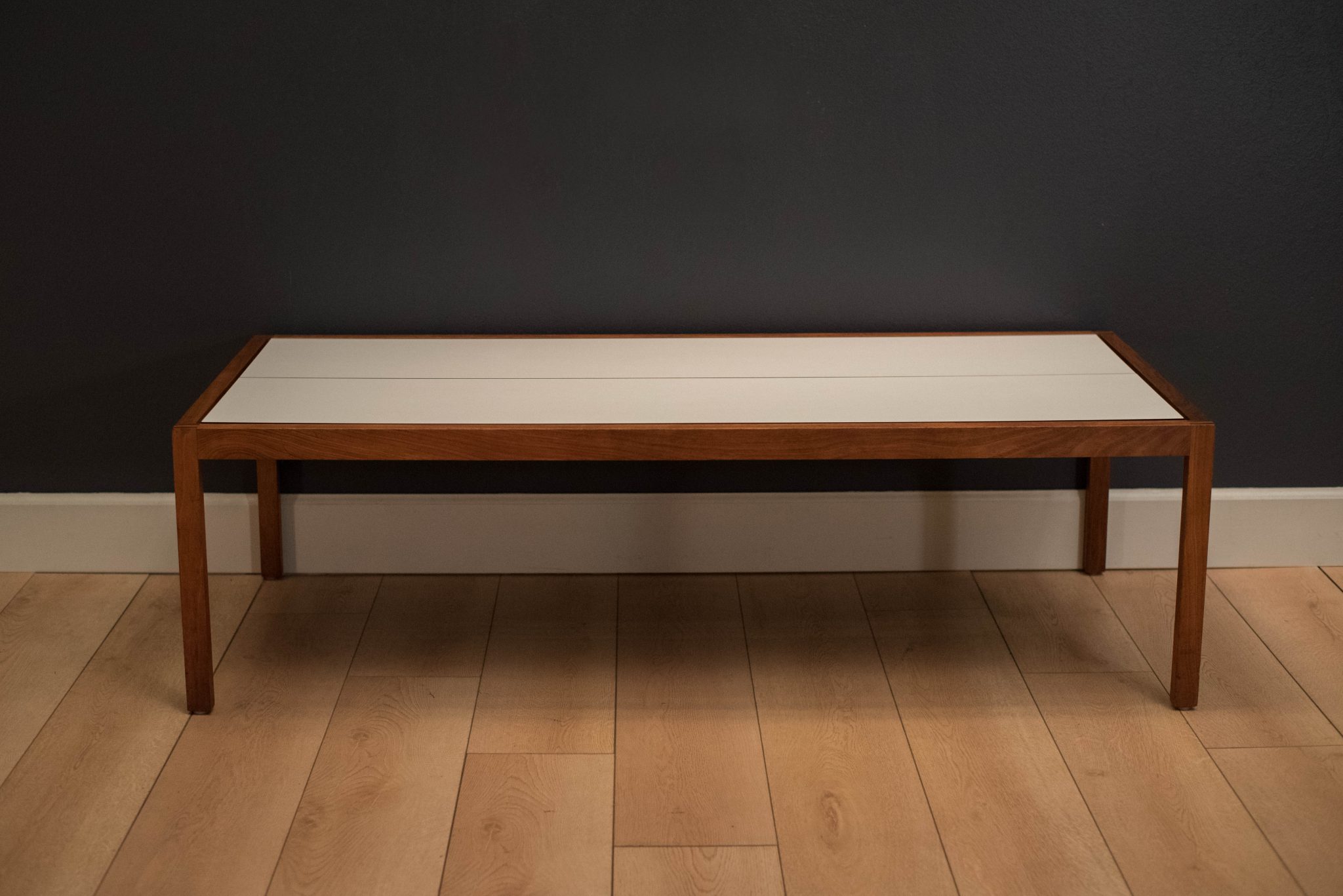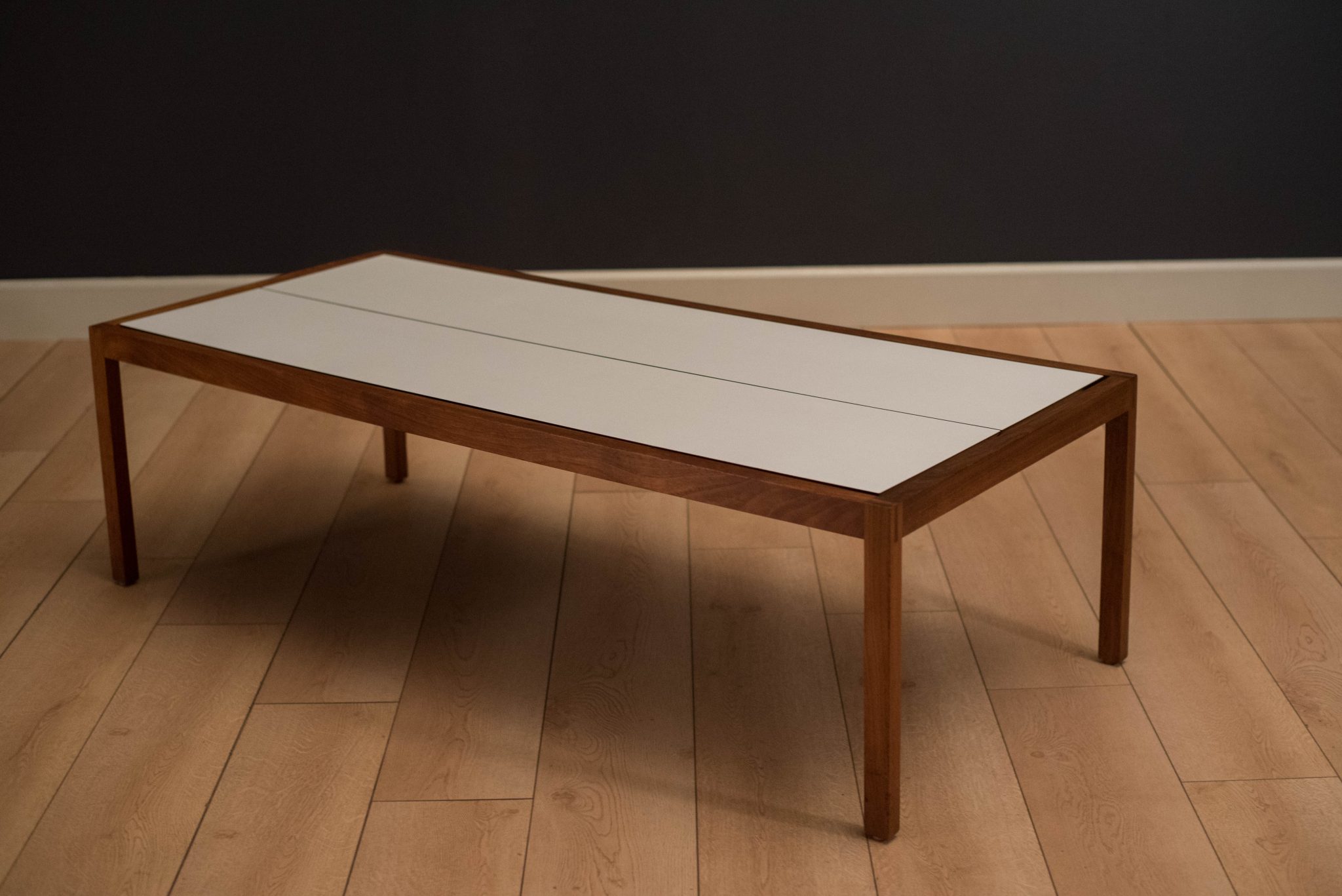 Mid century coffee table table designed by Lewis Butler for Knoll. This piece features a floating white laminate top with a rectangular walnut frame.