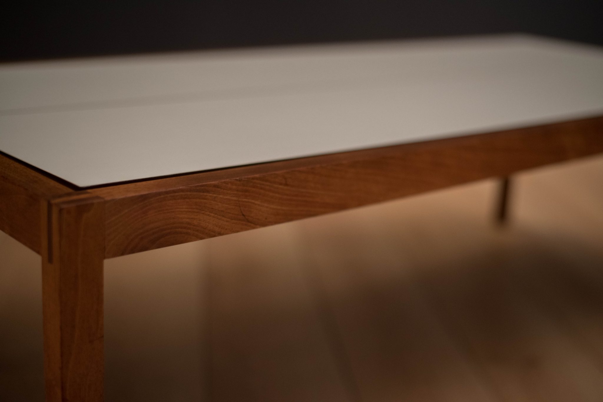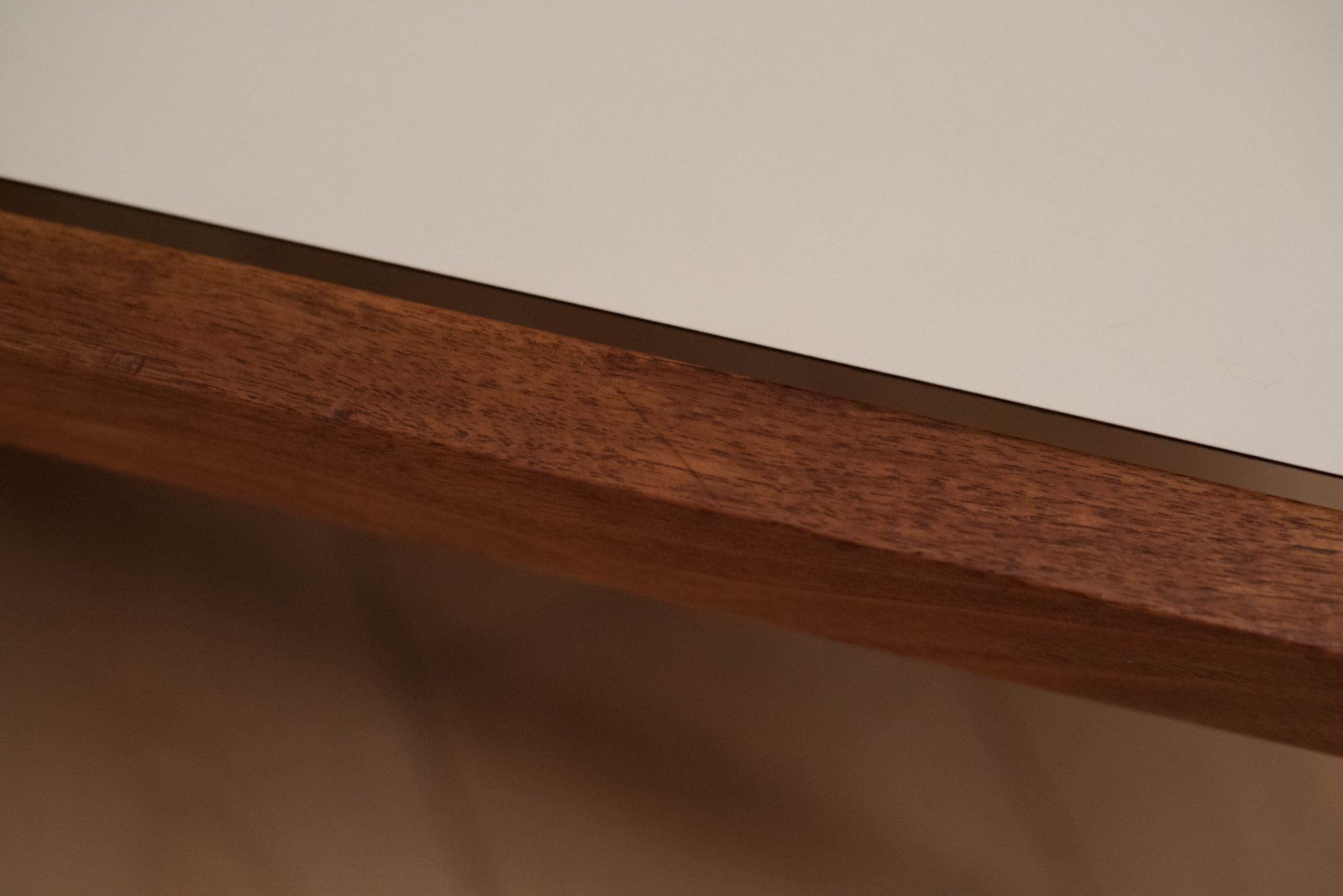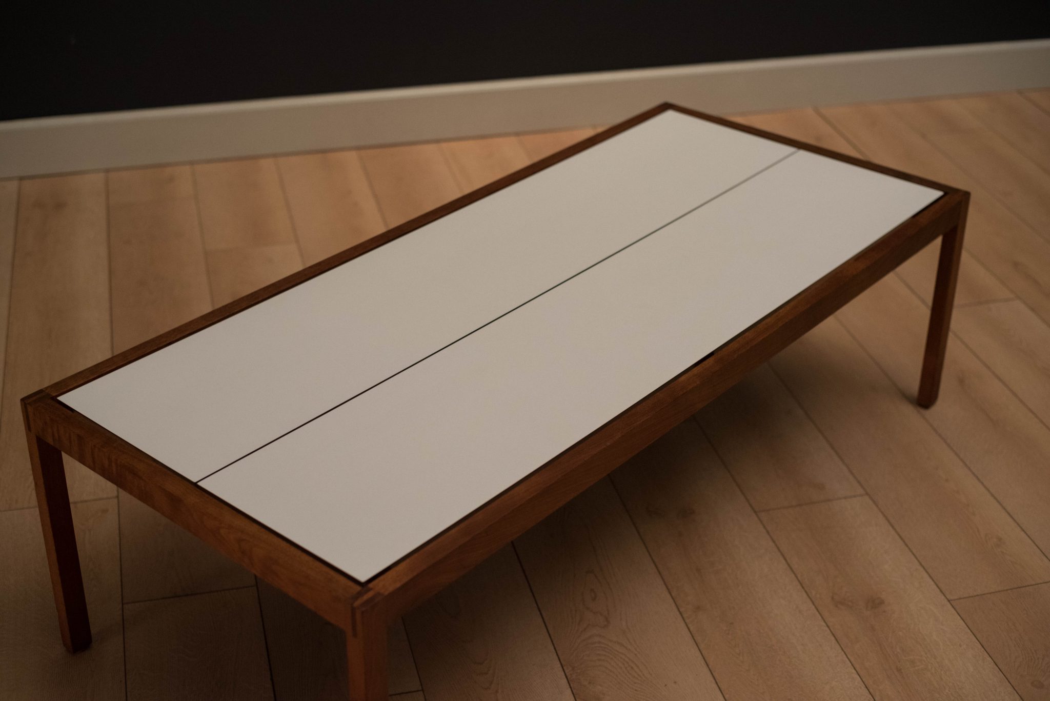 Mid century coffee table table designed by Lewis Butler for Knoll. This piece features a floating white laminate top with a rectangular walnut frame.