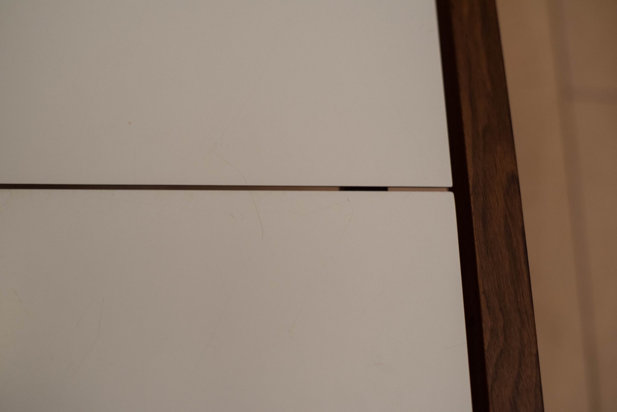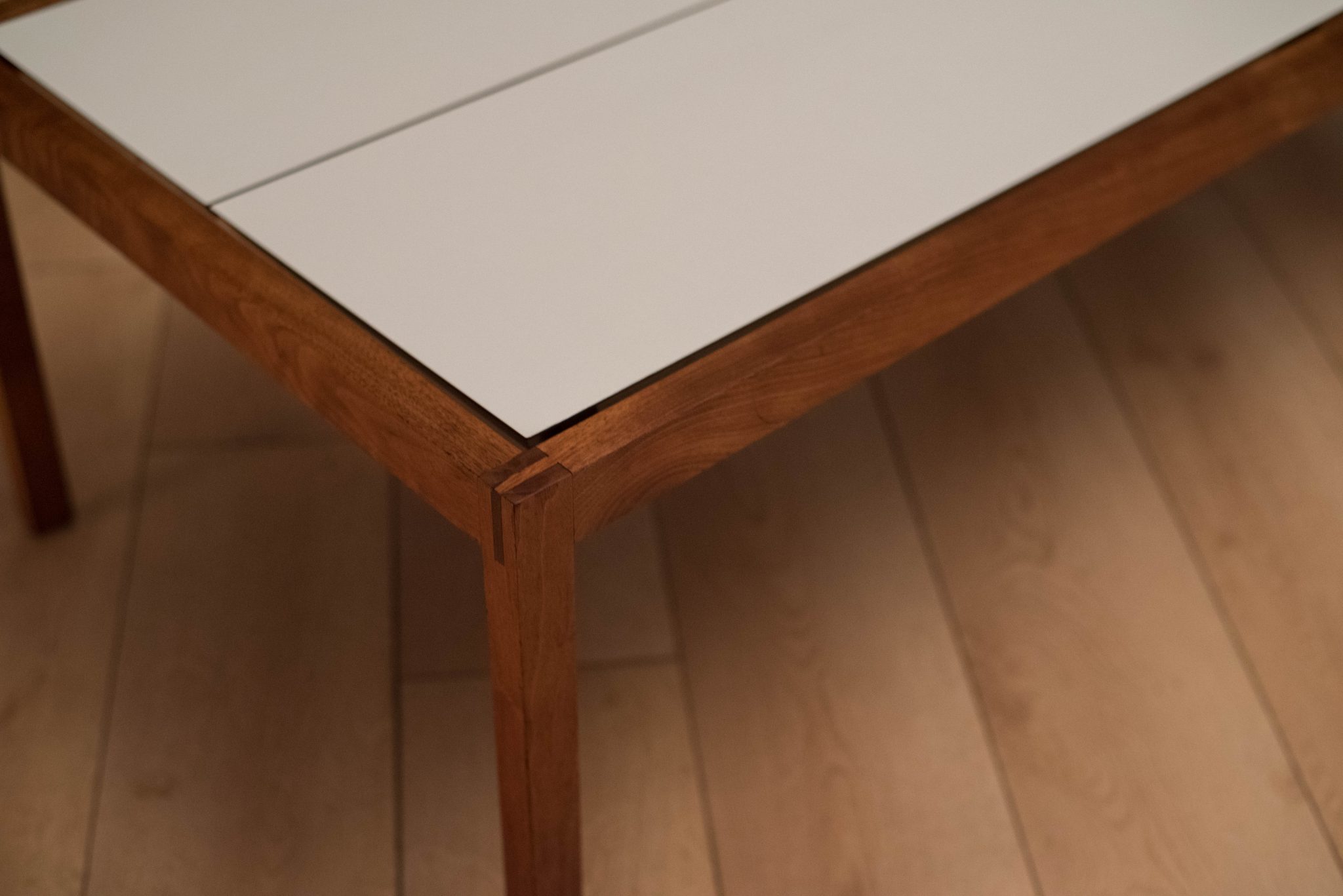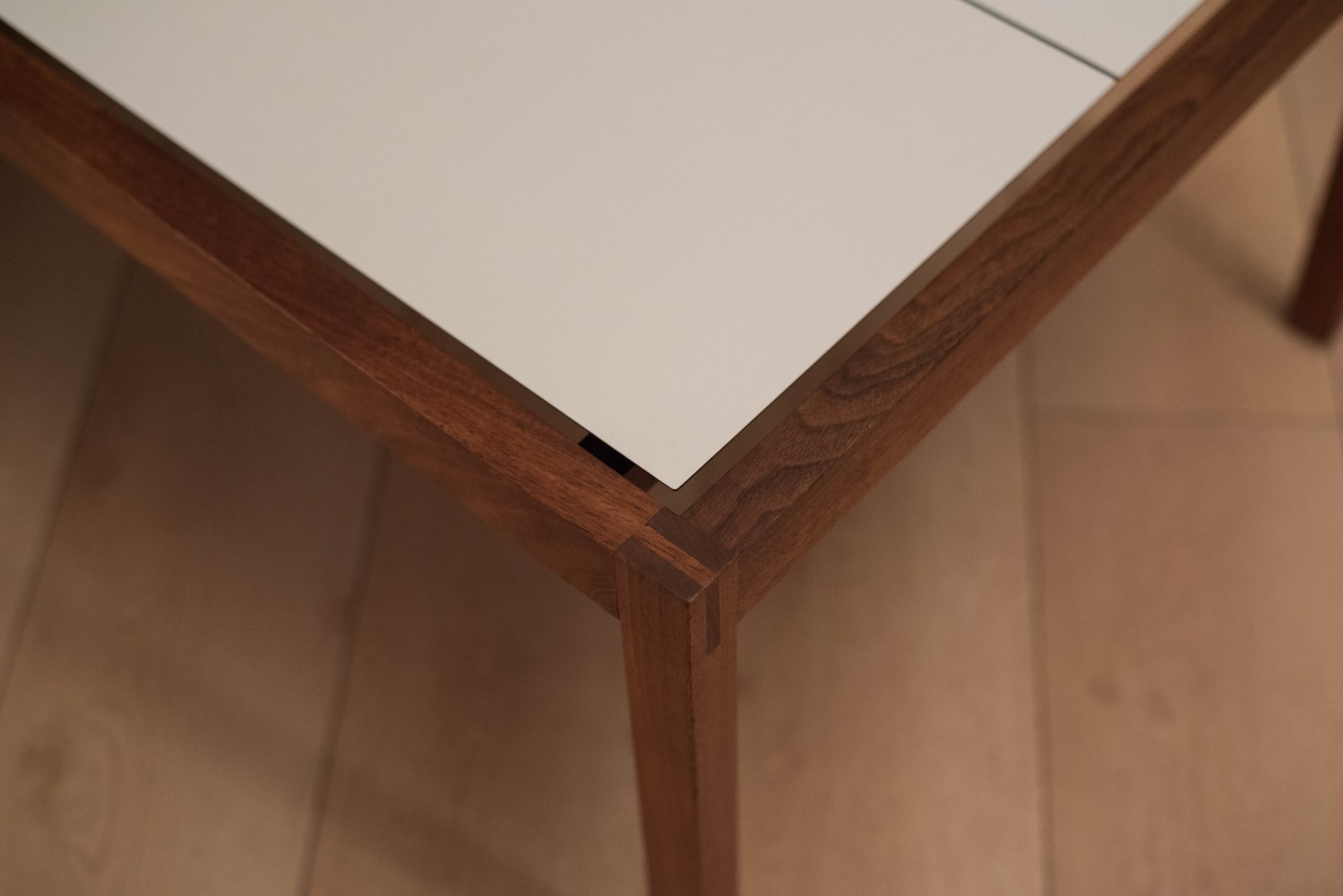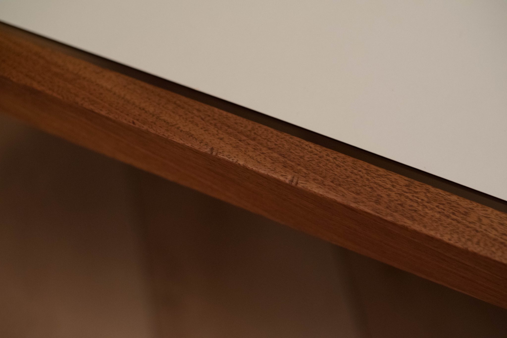 Mid century coffee table table designed by Lewis Butler for Knoll. This piece features a floating white laminate top with a rectangular walnut frame.