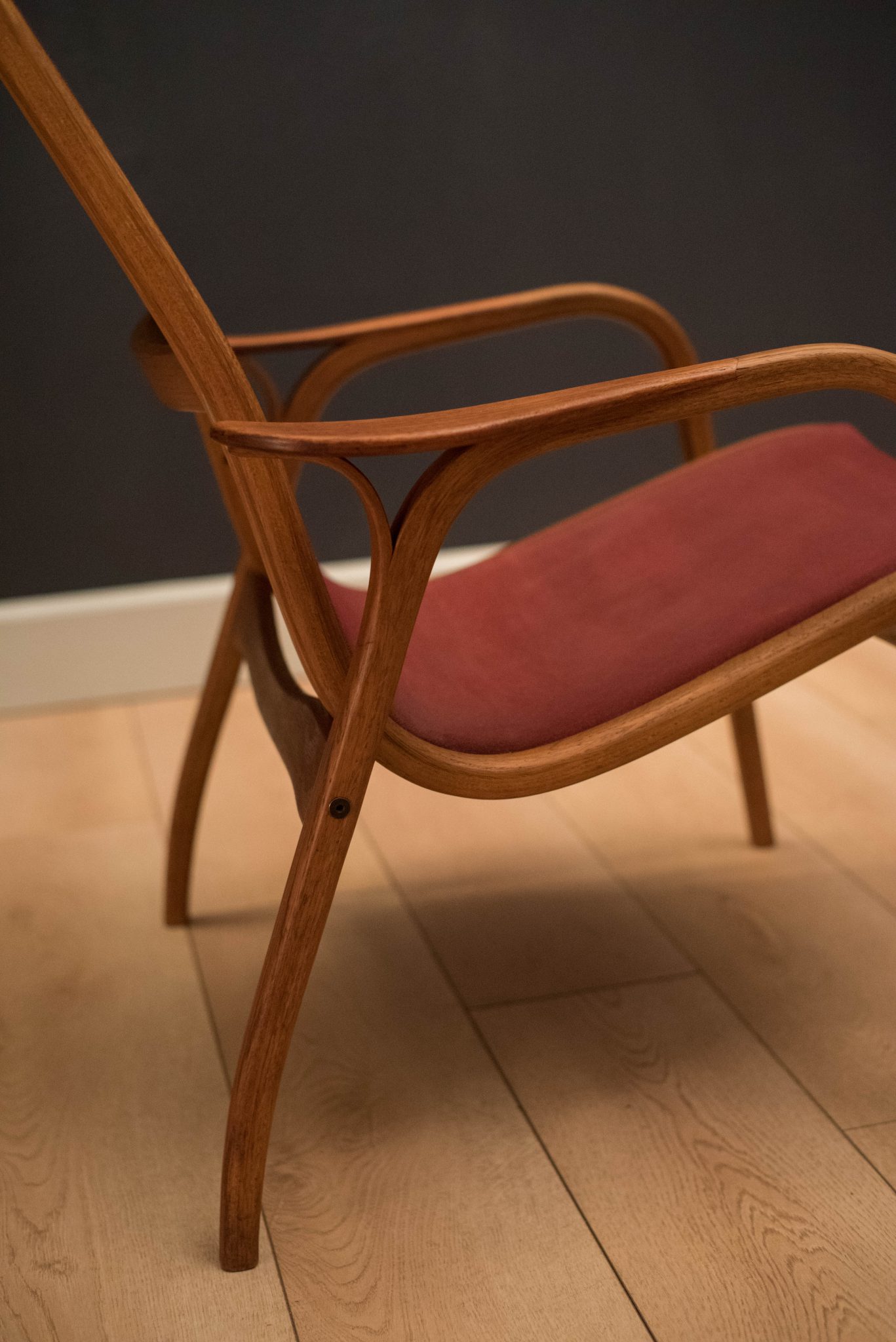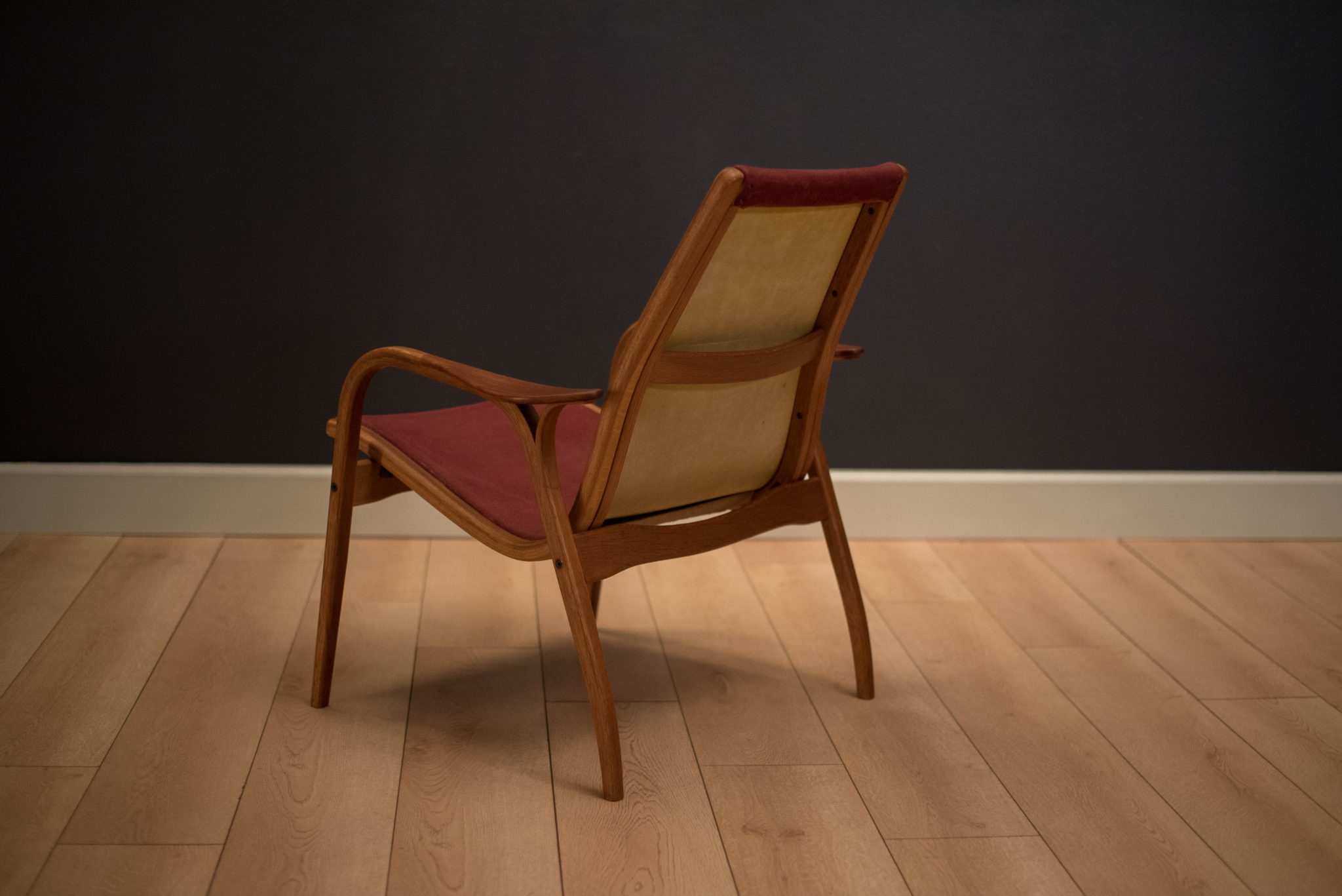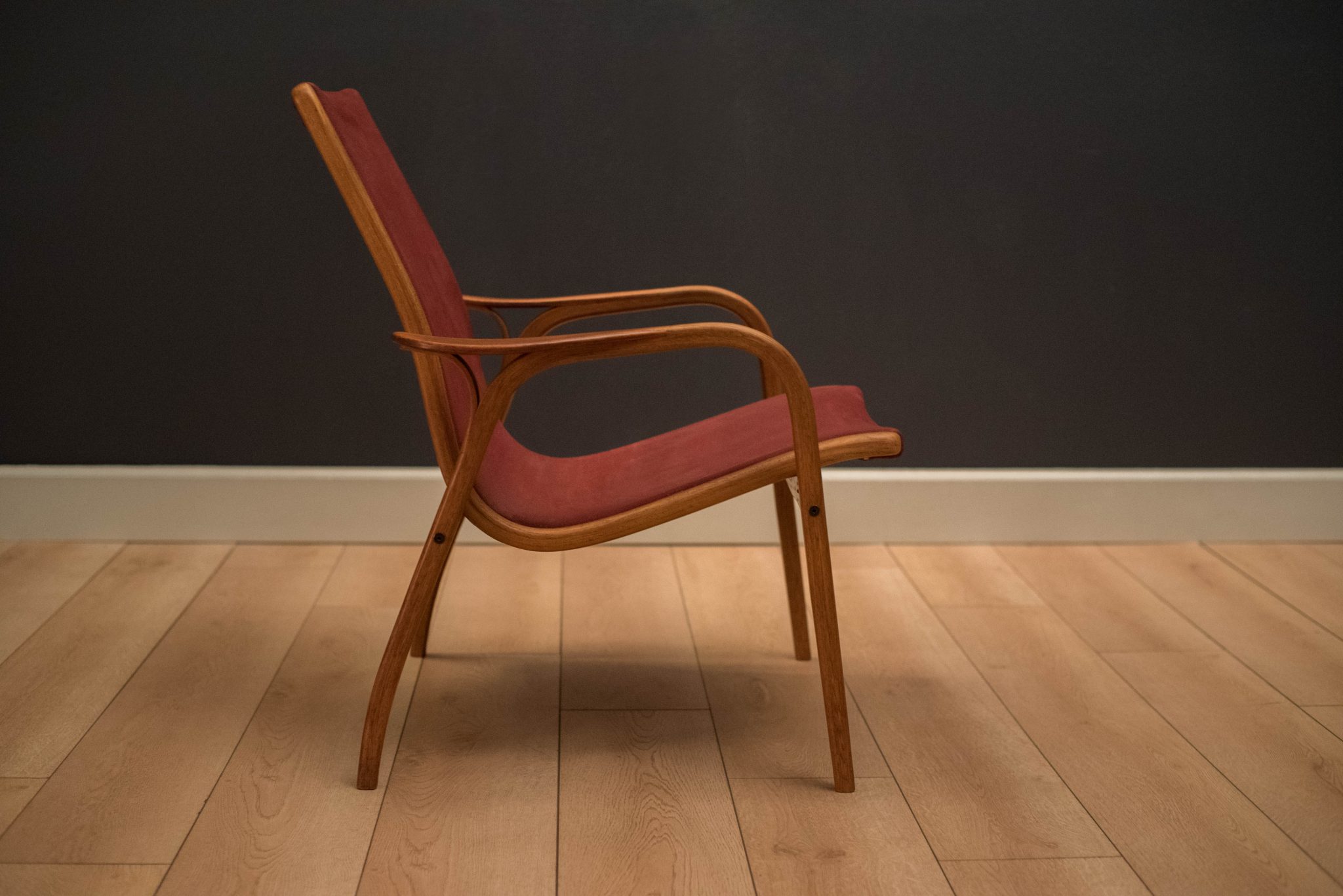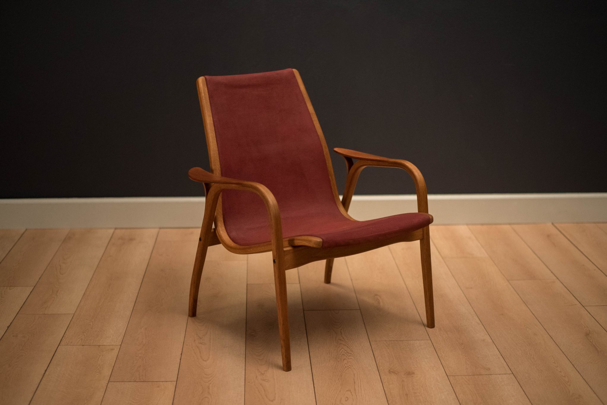 Mid century low back Laminett lounge chair designed by Yngve Ekström for Swedese. This piece displays a sculptural oak frame with contrasting teak arms. Retains the original suede fabric in burgundy red.
