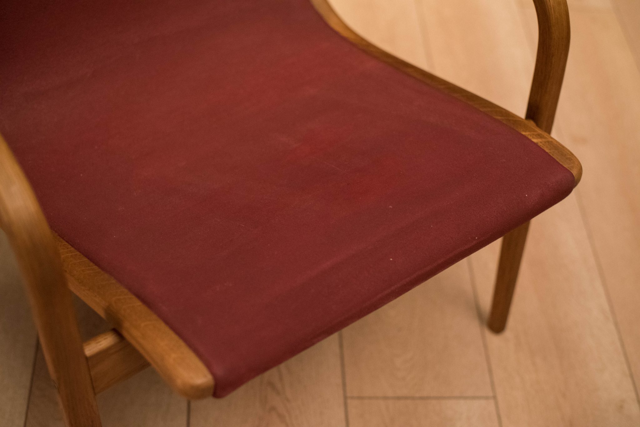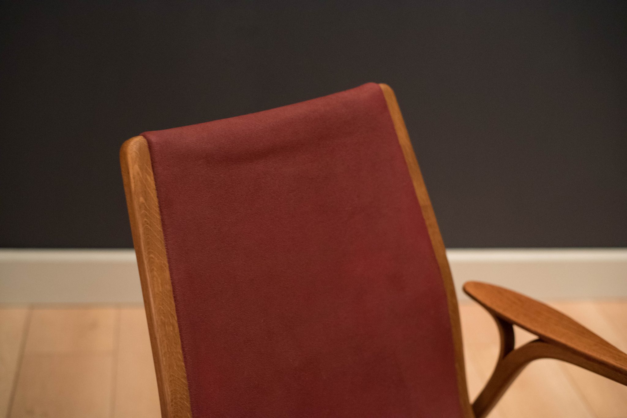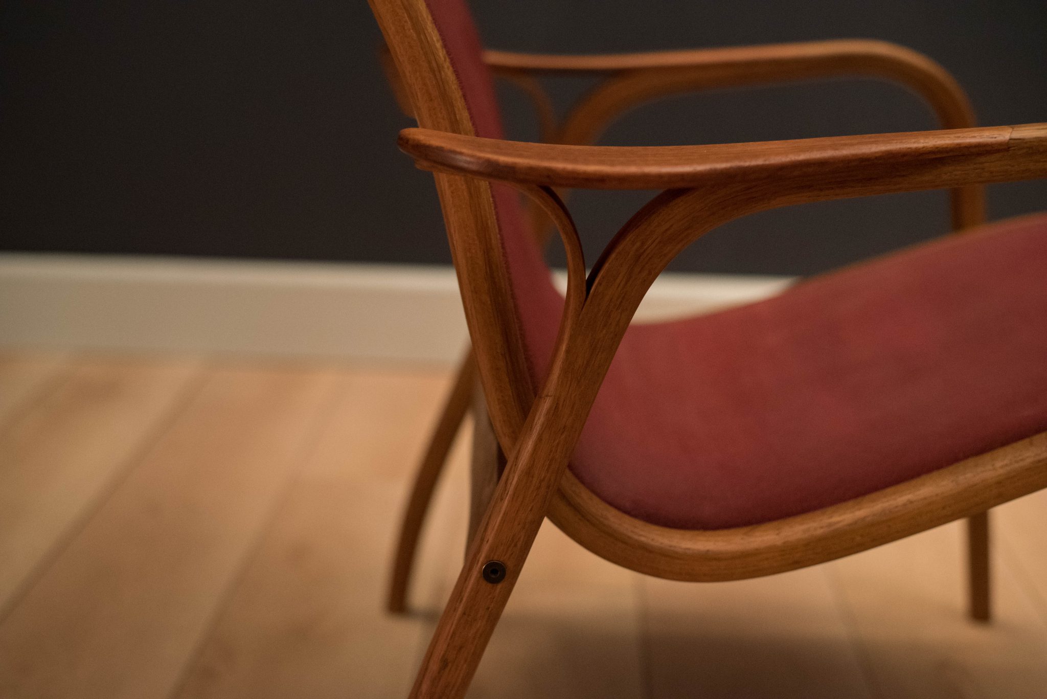 Mid century low back Laminett lounge chair designed by Yngve Ekström for Swedese. This piece displays a sculptural oak frame with contrasting teak arms. Retains the original suede fabric in burgundy red.