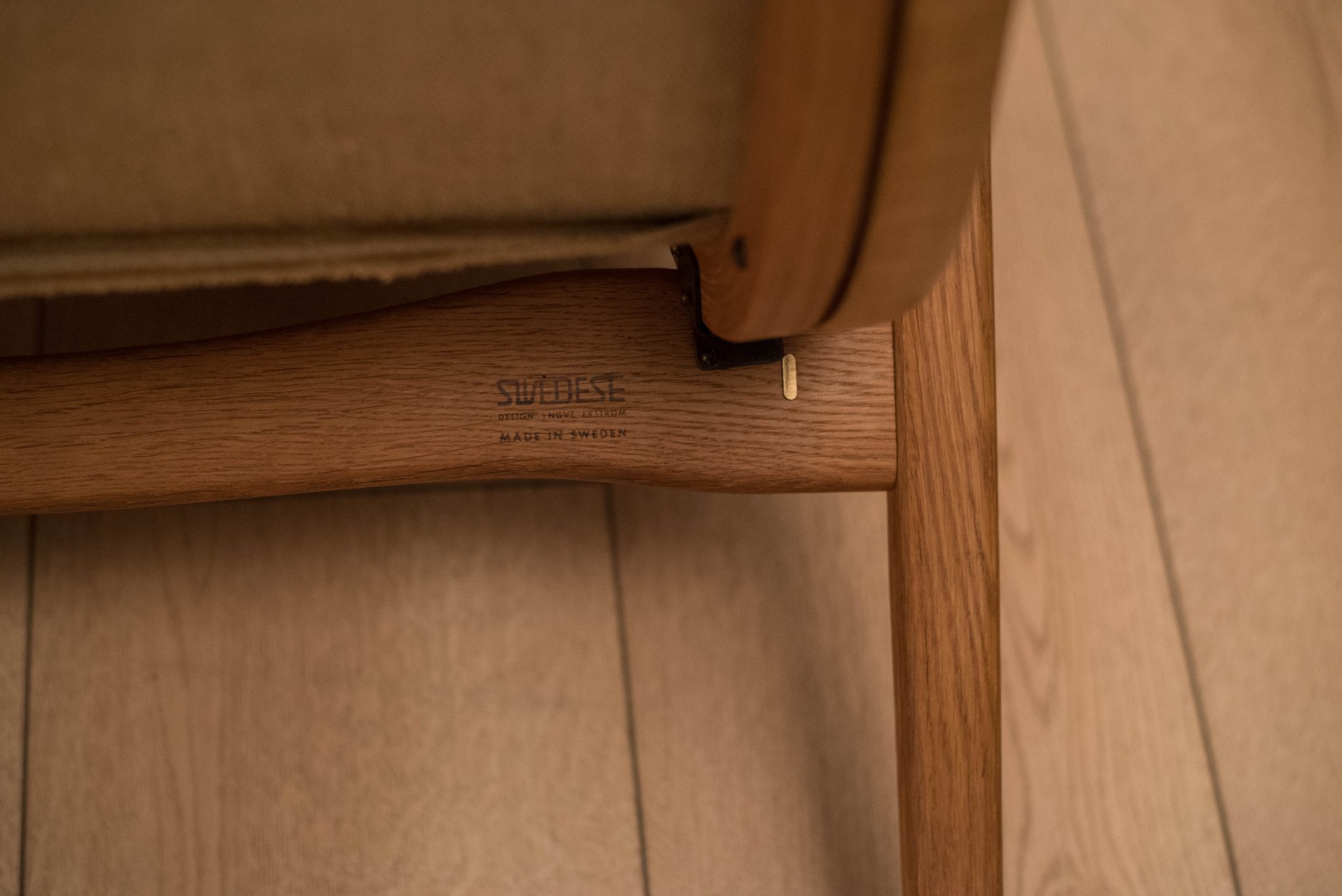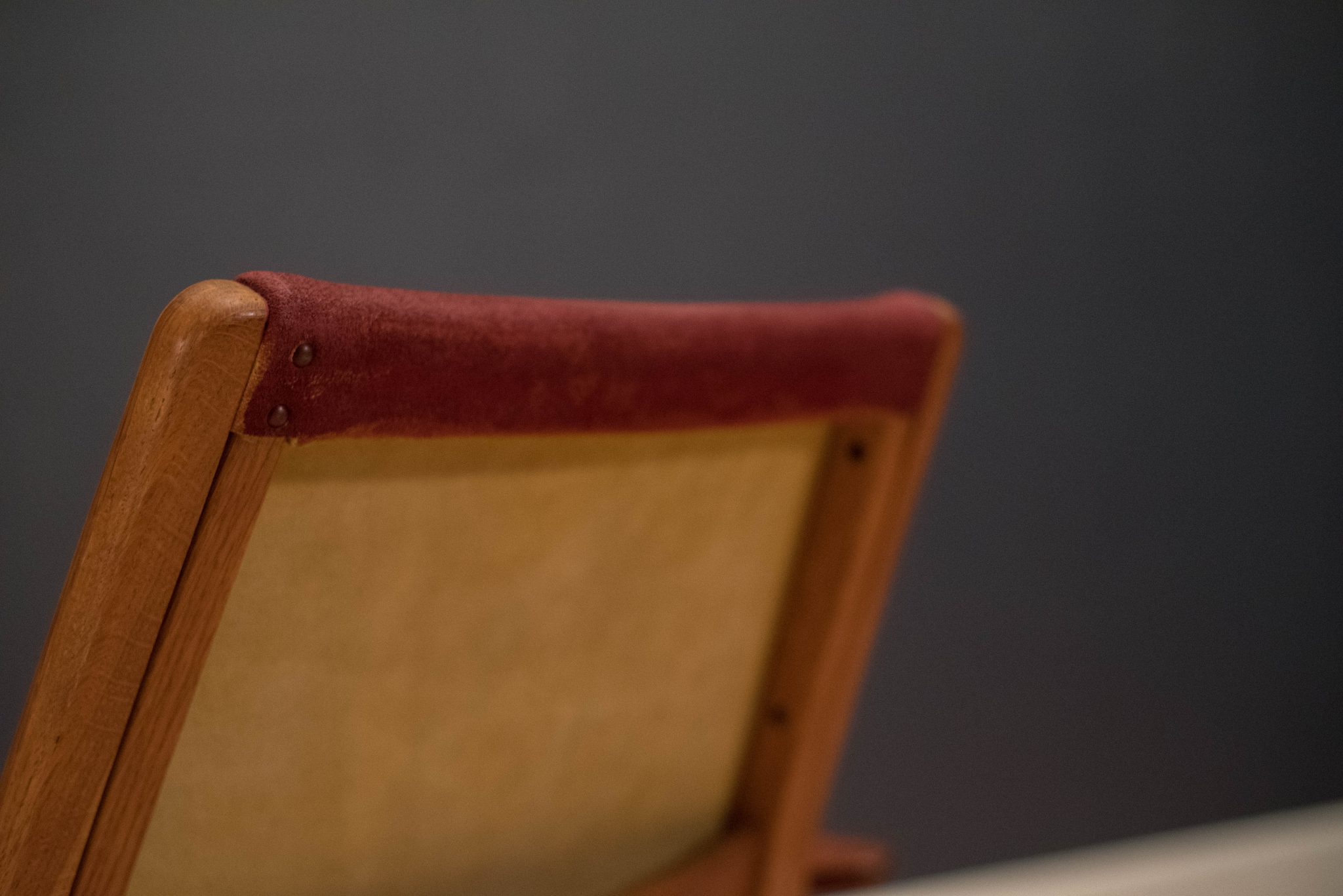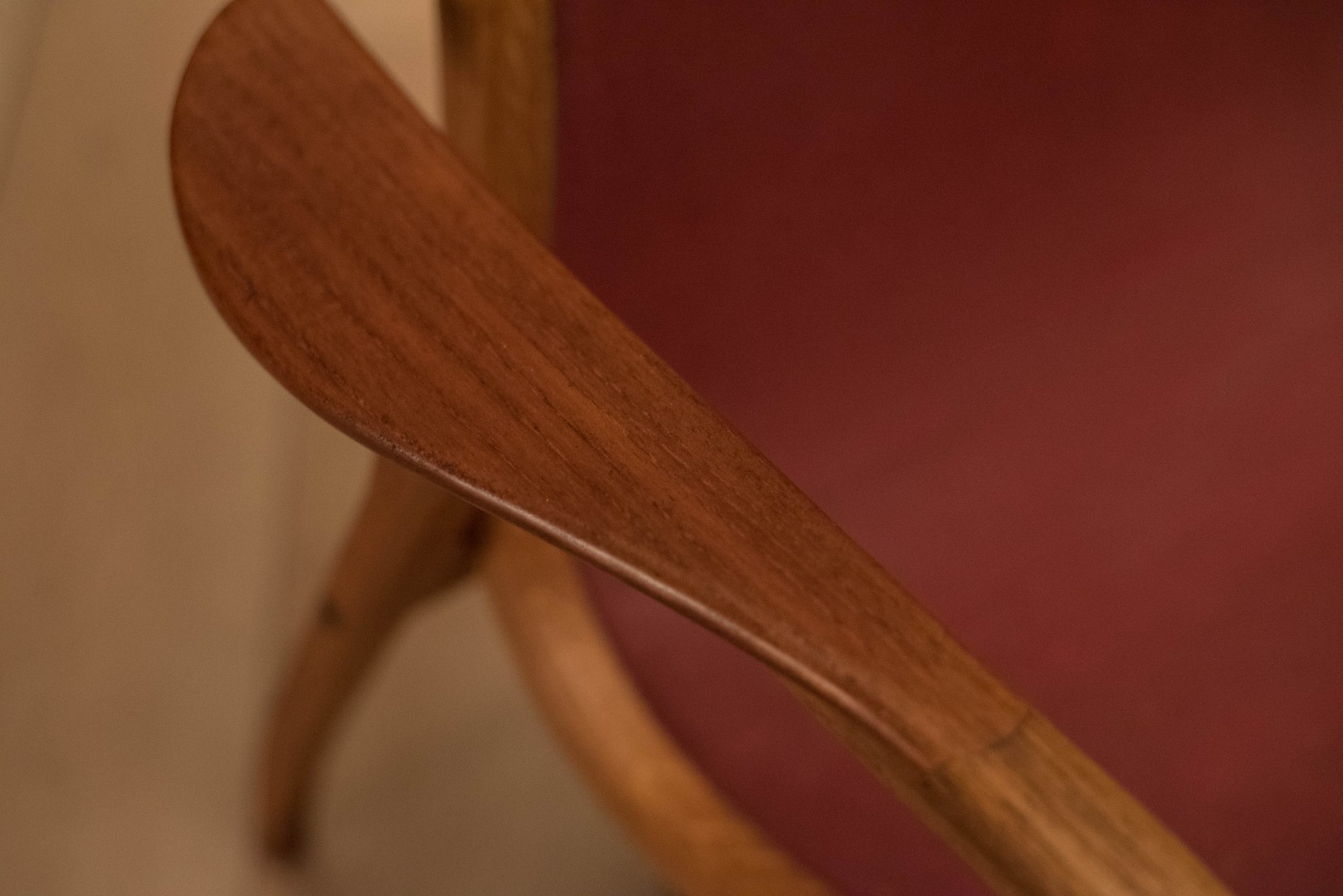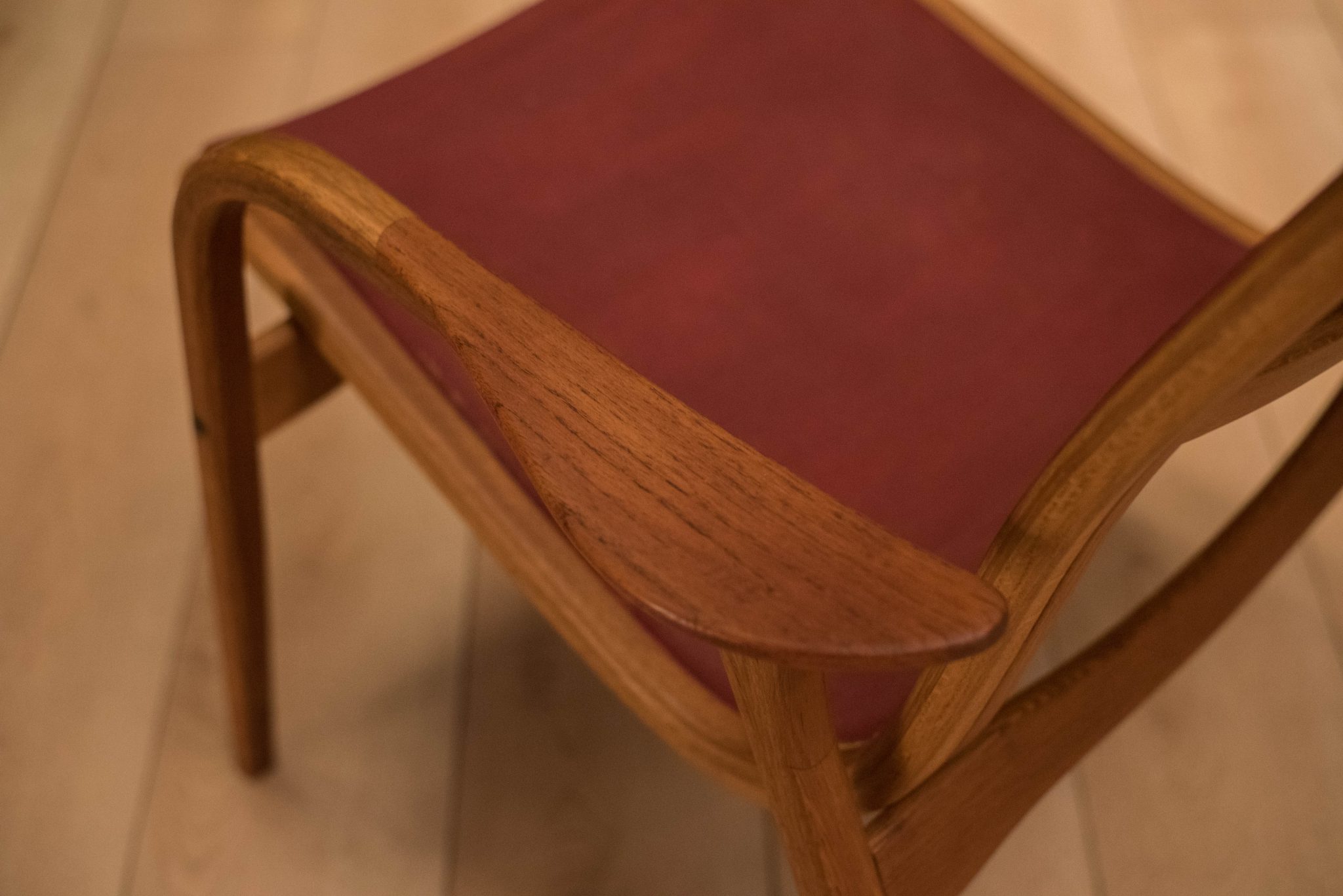 Mid century low back Laminett lounge chair designed by Yngve Ekström for Swedese. This piece displays a sculptural oak frame with contrasting teak arms. Retains the original suede fabric in burgundy red.